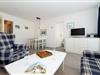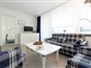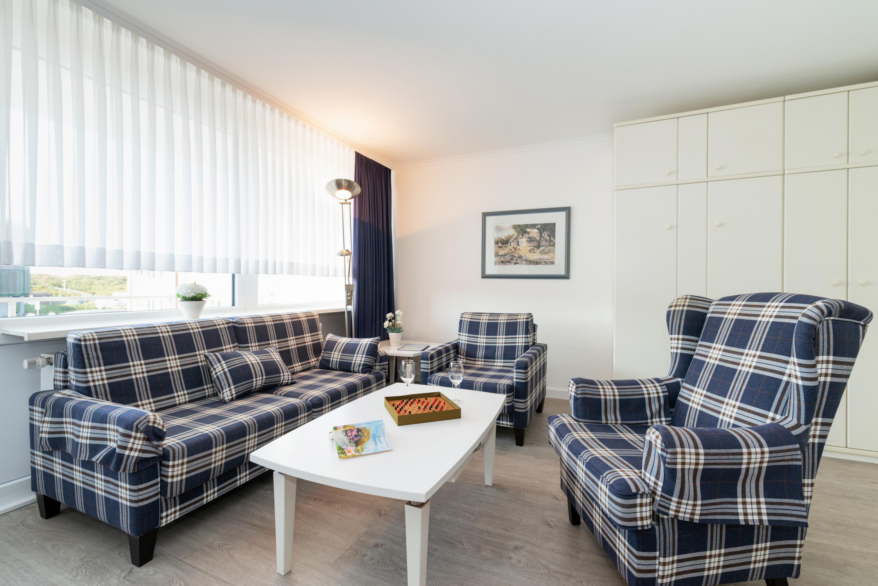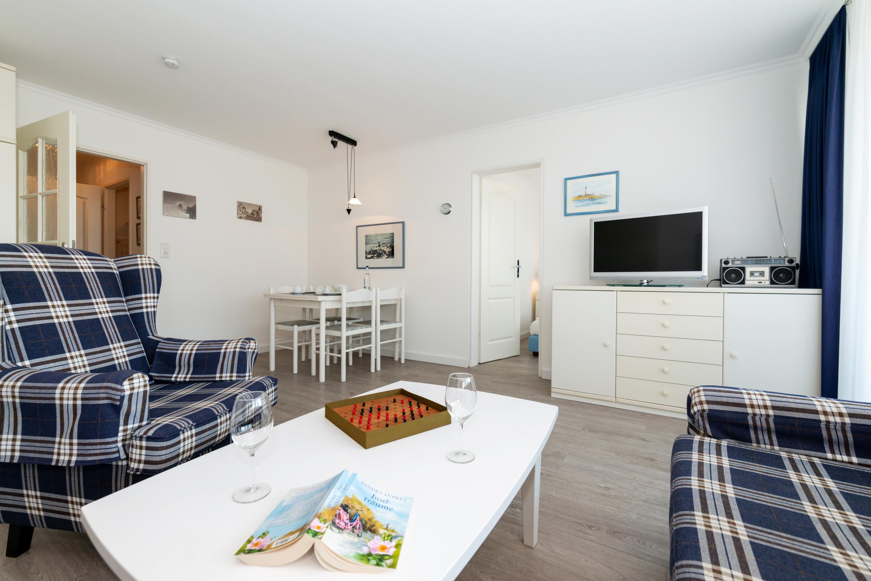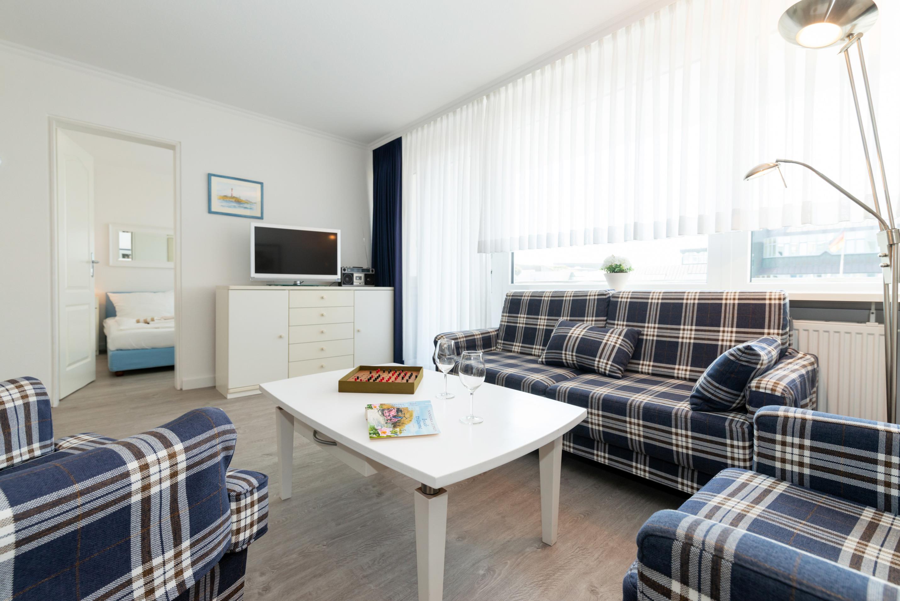 Der Wohnraum besteht aus einer bequemen Sitzgarnitur (zwei Zweisitzer und ein Sessel mit Fußhocker), einem Essplatz, einem Einzelschrankbett, Kabel-TV, HiFi-Anlage und dem Zugang zum Schlafzimmer.