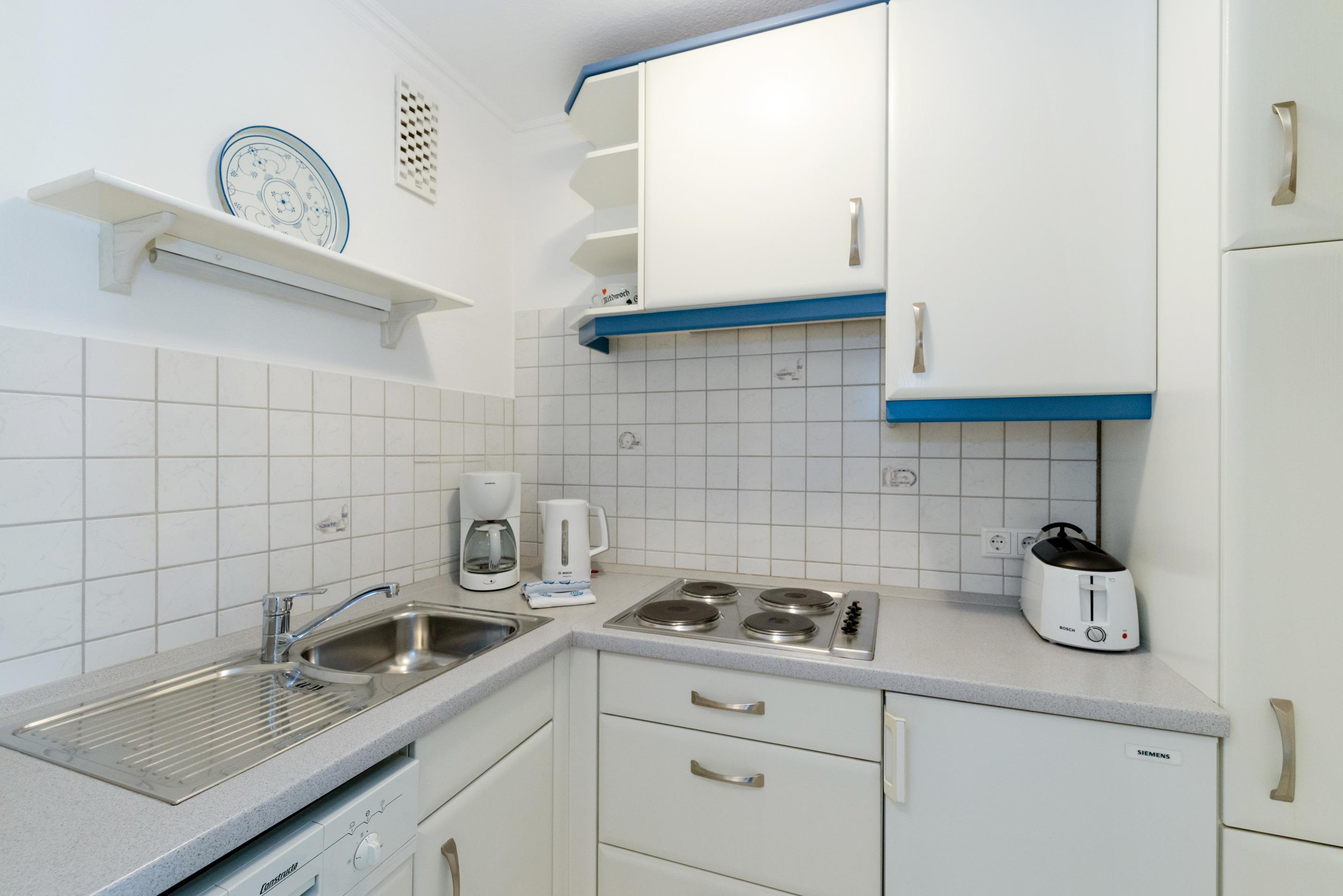 Die neue Küche hat einen Geschirrspüler, ein 4-Platten-Kochfeld, einen Kühlschrank mit 3-Sterne-Gefrierfach. Kaffeemaschine, Wasserkocher und Toaster gehören zur Grundausstattung.