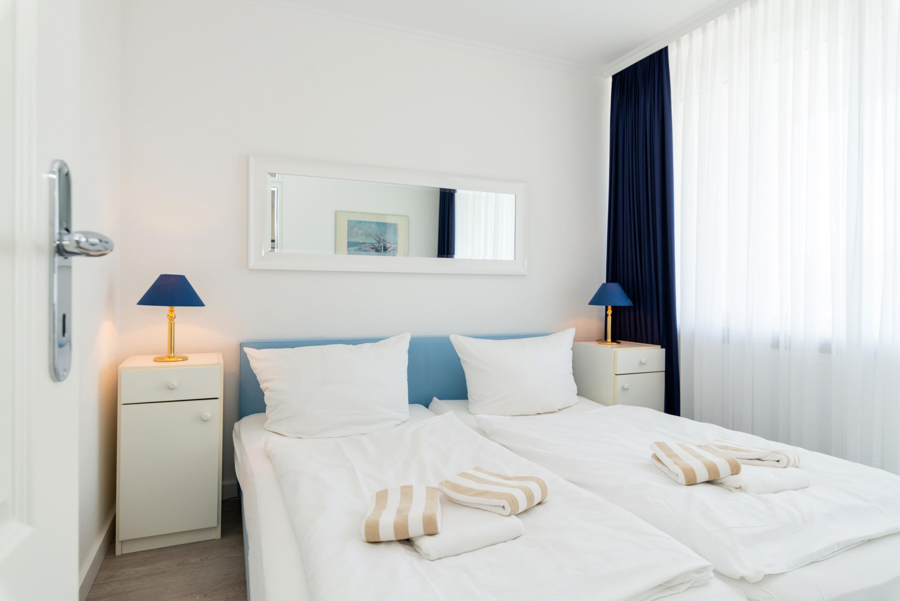 Das Schlafzimmer hat ein Doppelbett mit zwei Einzelmatratzen.