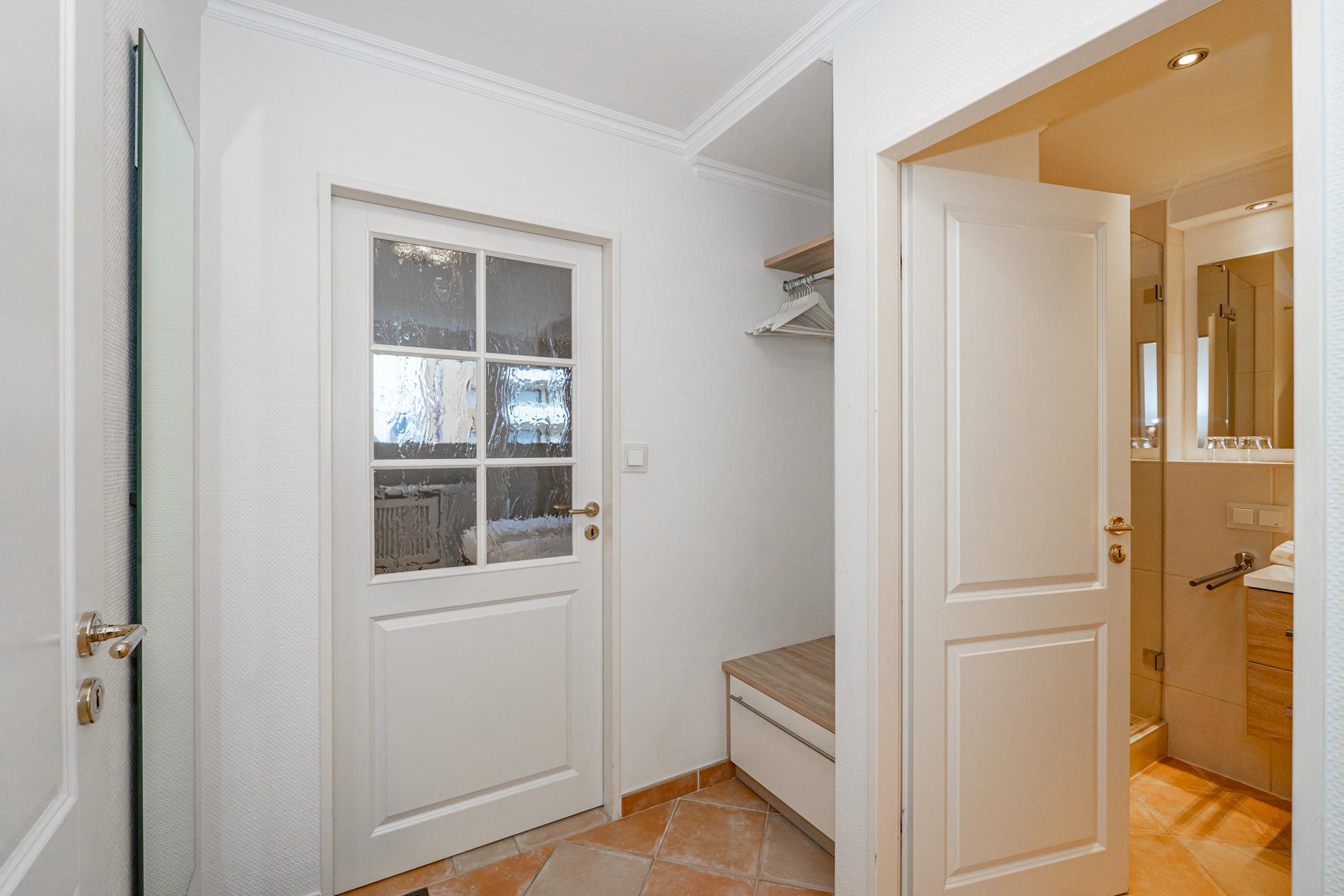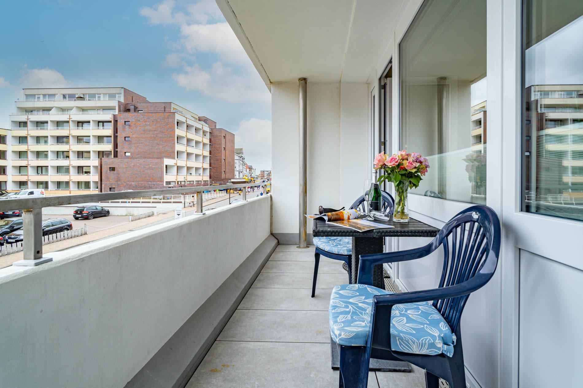 Komfortable, komplett mit Fliesen ausgelegte 1-Zimmer-Nichtraucher-Ferienwohnung (ca. 38 qm) in der 1. Etage zur Landseite mit Ostloggia (Morgensonne, Balkonmöbel vorhanden) für max. 2 Personen.