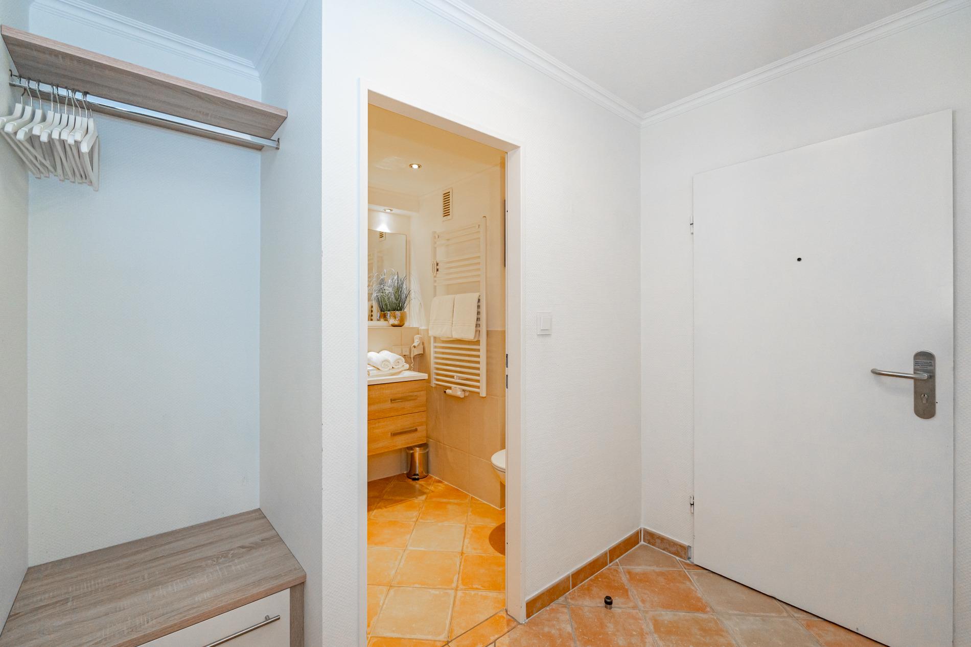 Das neue, helle Badezimmer ist mit einer Dusche mit extraflachem Einstieg, einem Waschtisch, ein WC und einem festinstallierten Fön ausgestattet.