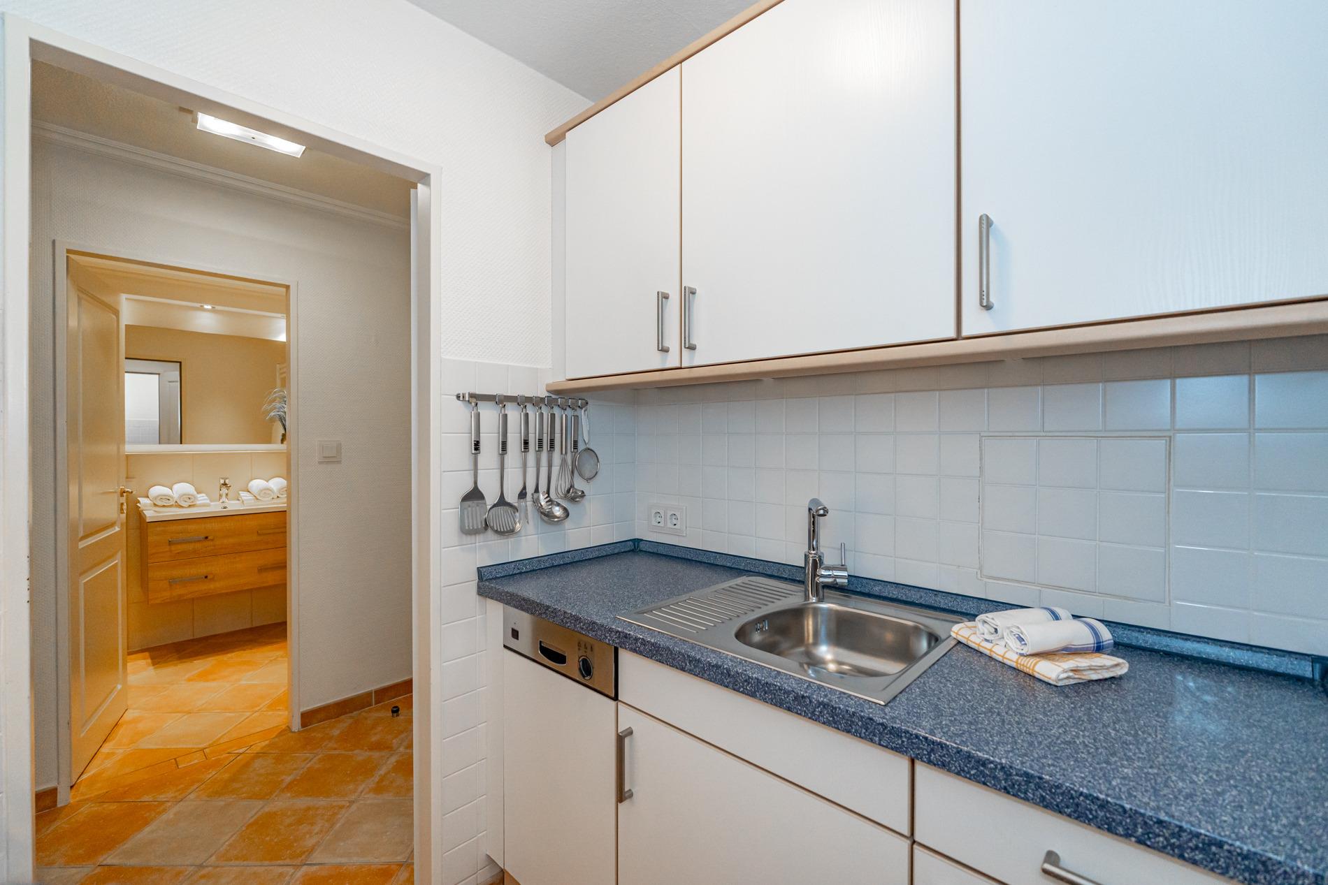 Die separate Küche hat einen Geschirrspüler, einen Herd mit Backofen, ein Cerankochfeld und einen Kühlschrank mit 3*-Gefrierfach.