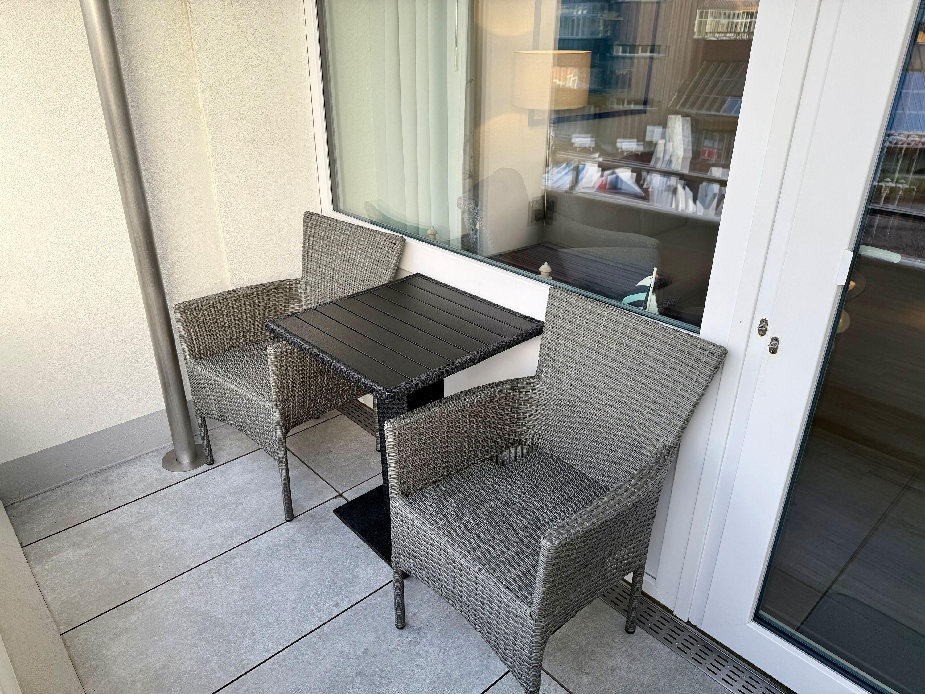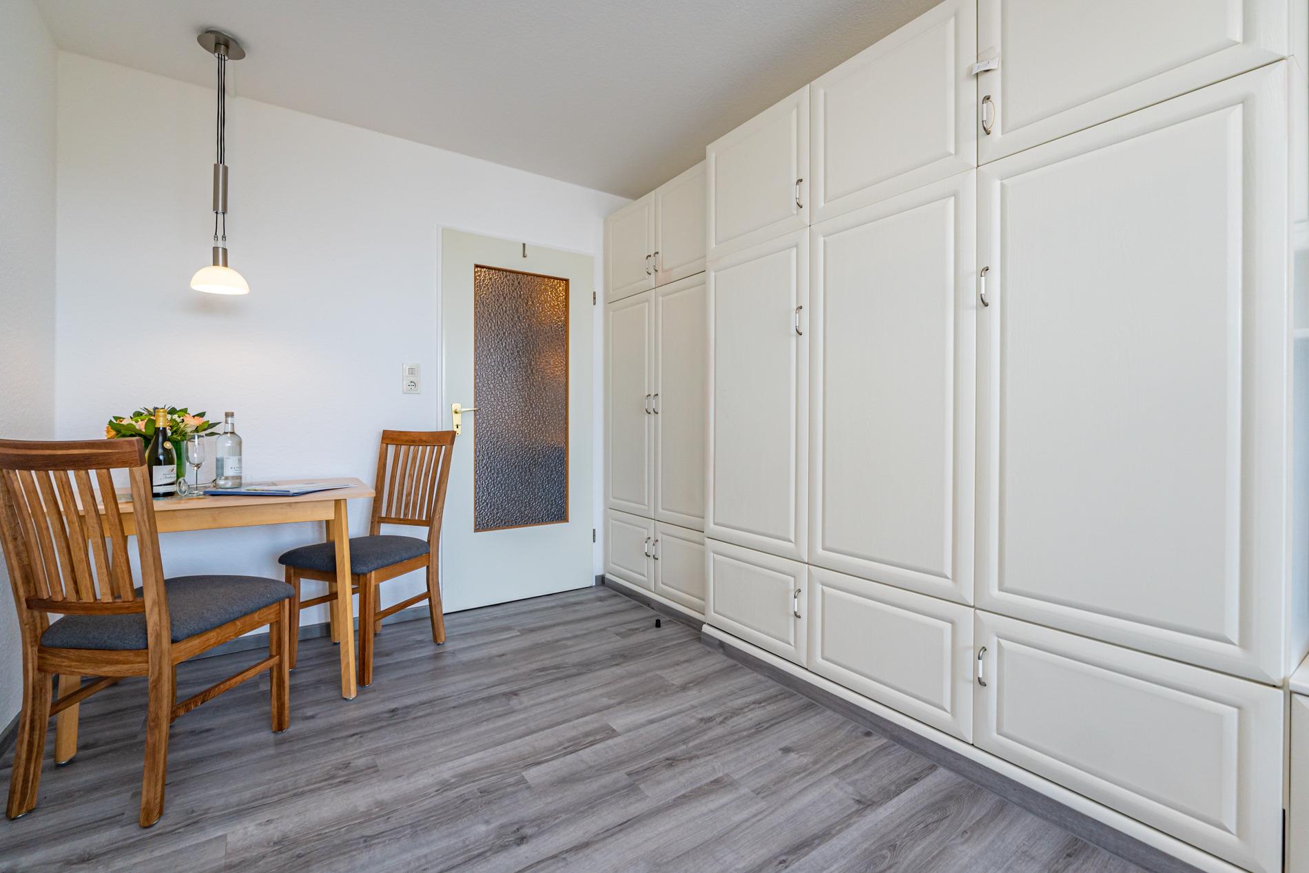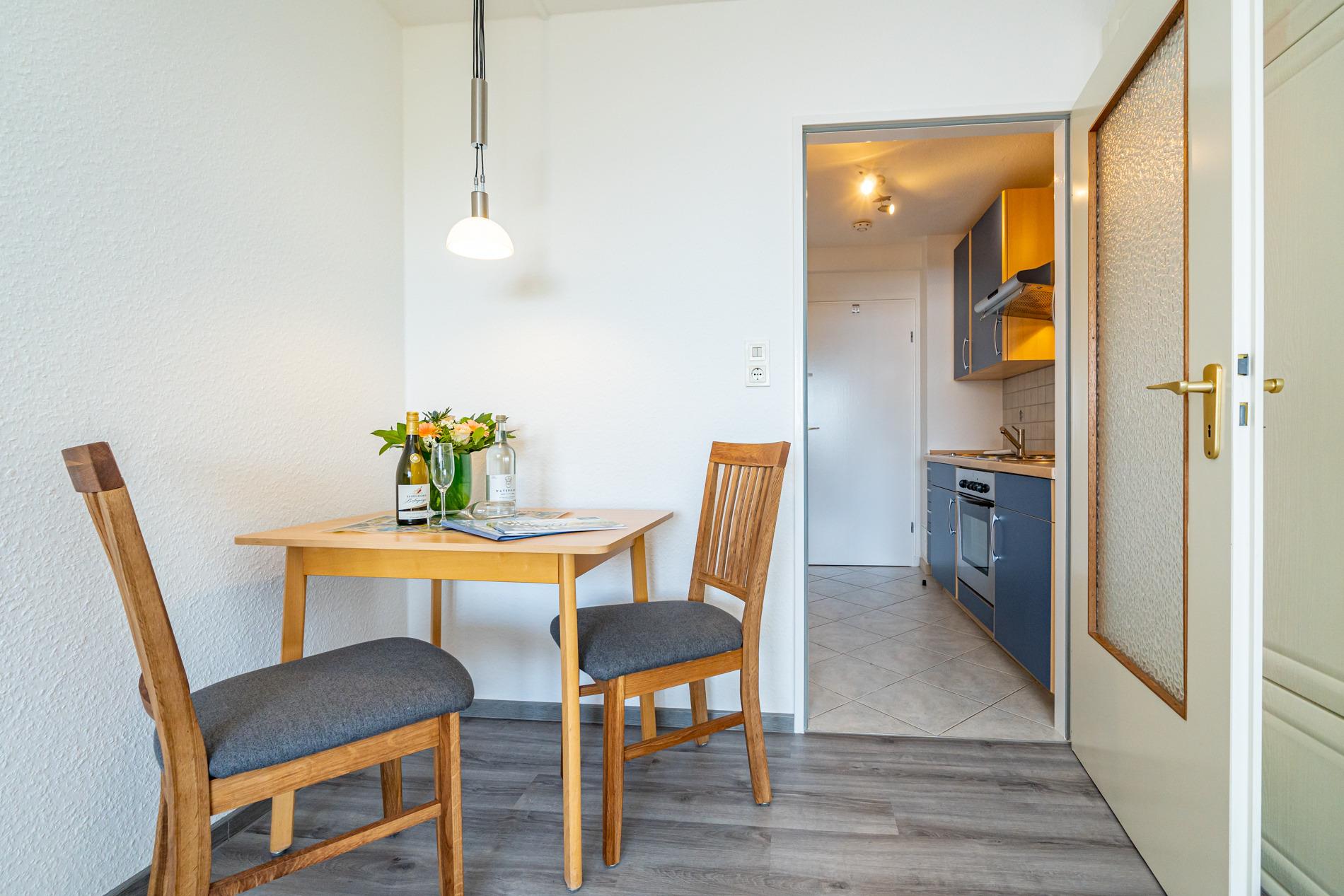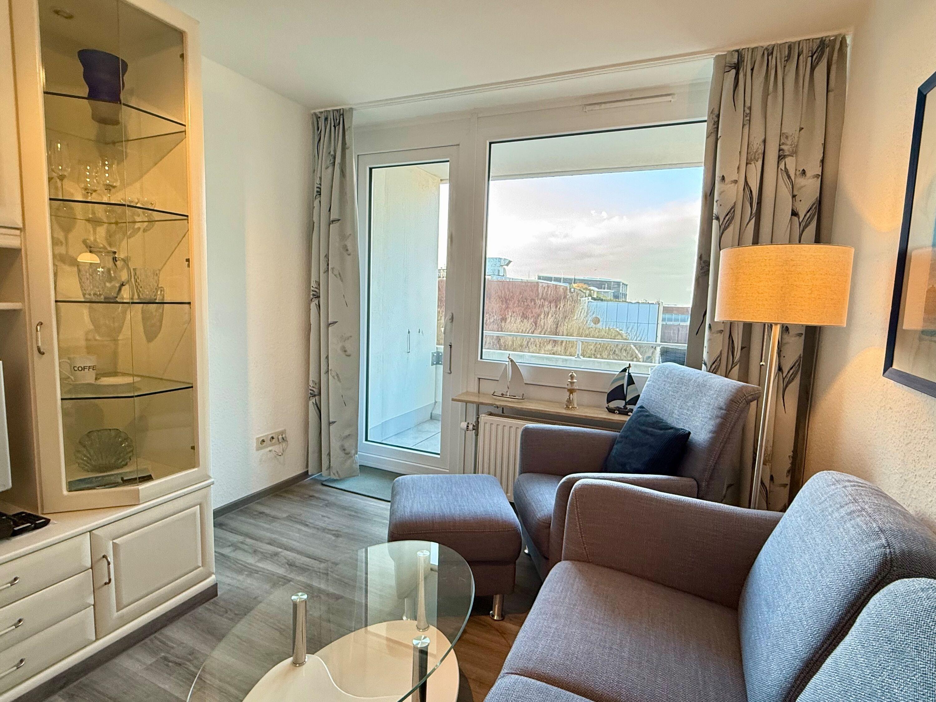 Komfortable 1-Zimmer-Nichtraucher-Ferienwohnung, ca. 25 qm, in der 2. Etage zur Seeseite mit Westloggia (Nachmittagssonne, mit Balkonmöbeln und Auflagen) für max. 2 Personen.