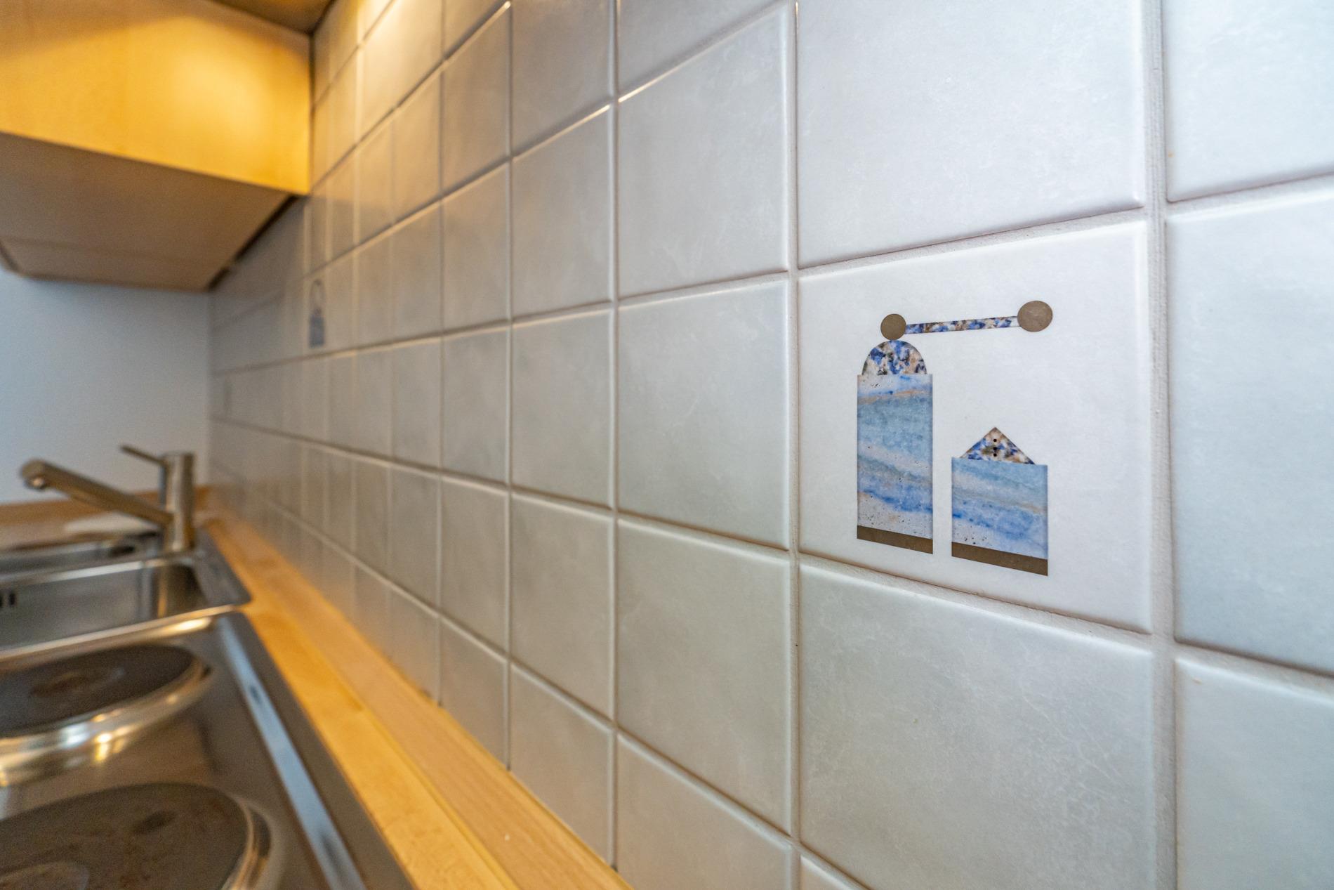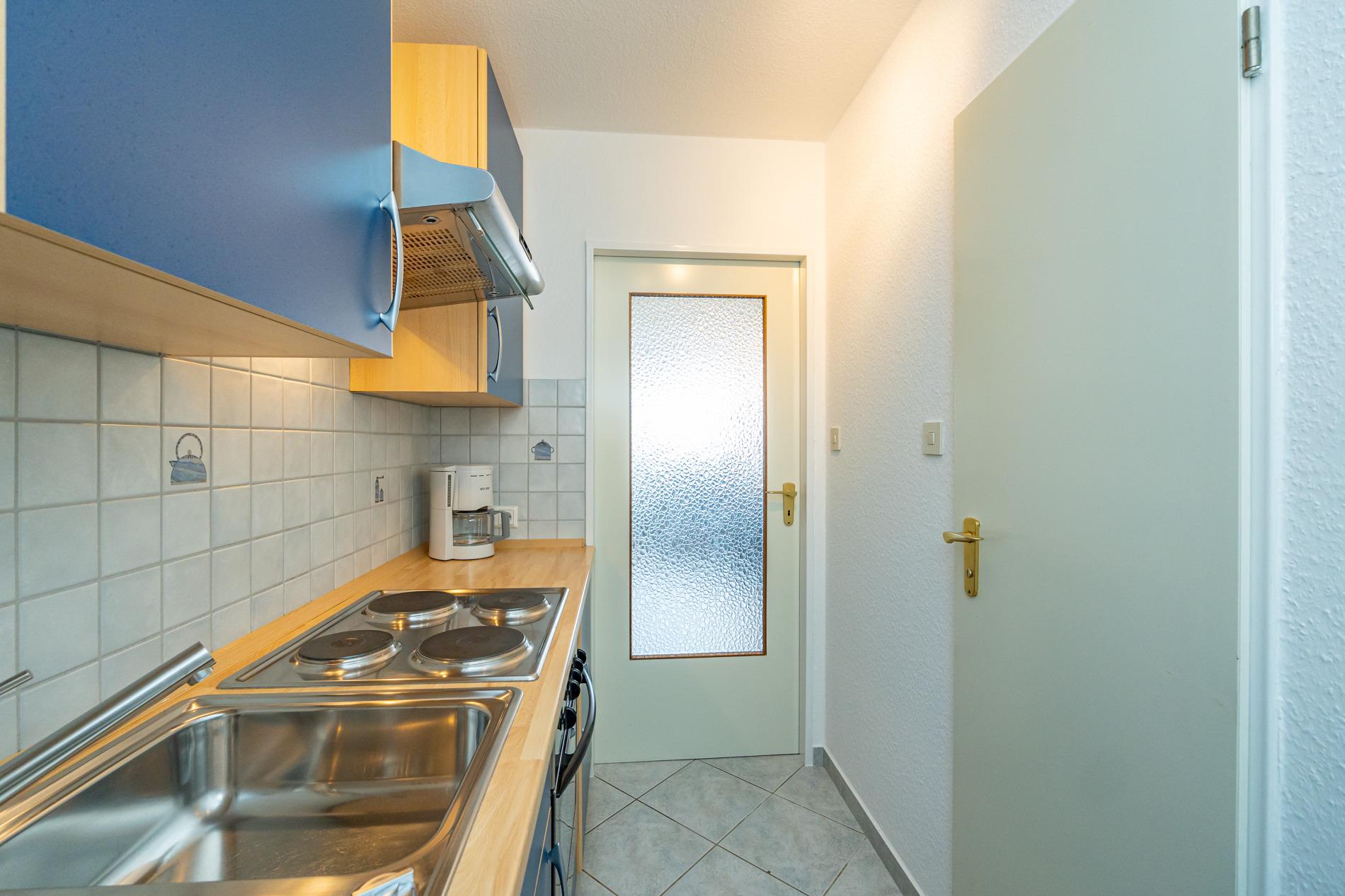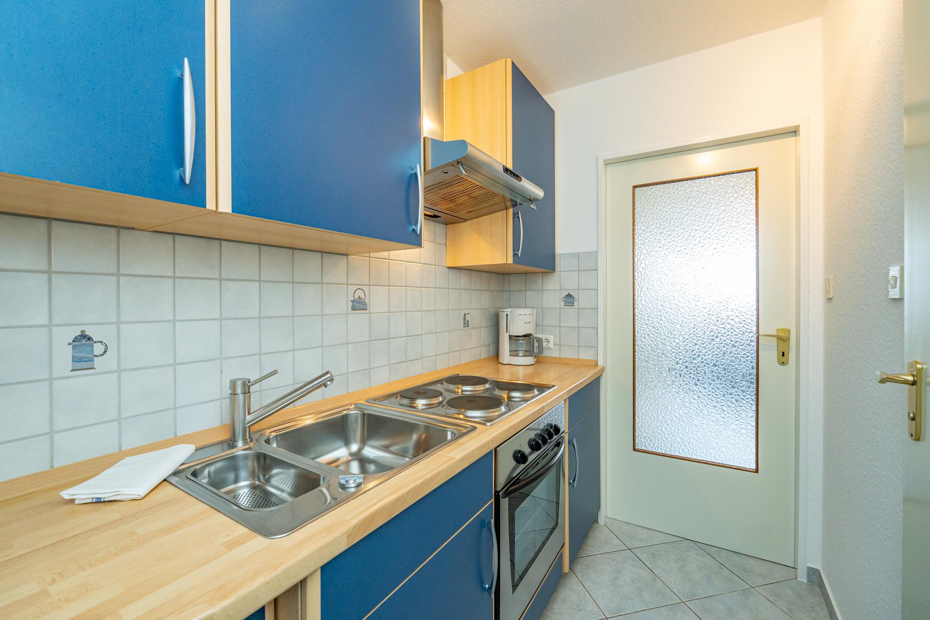 Die neuwertige Küchenzeile hat ein 4-Platten-Kochfeld, einen Backofen und einen Kühlschrank. Kaffeemaschine, Wasserkocher und Toaster gehören zur Grundausstattung.