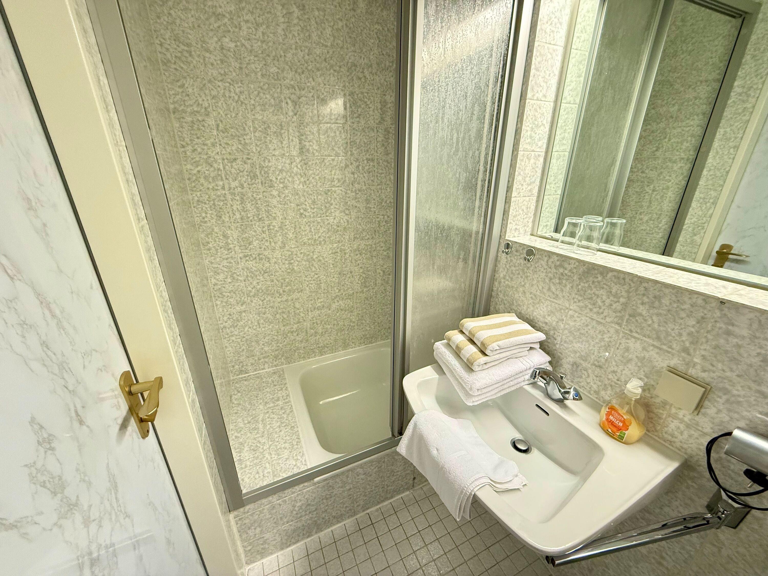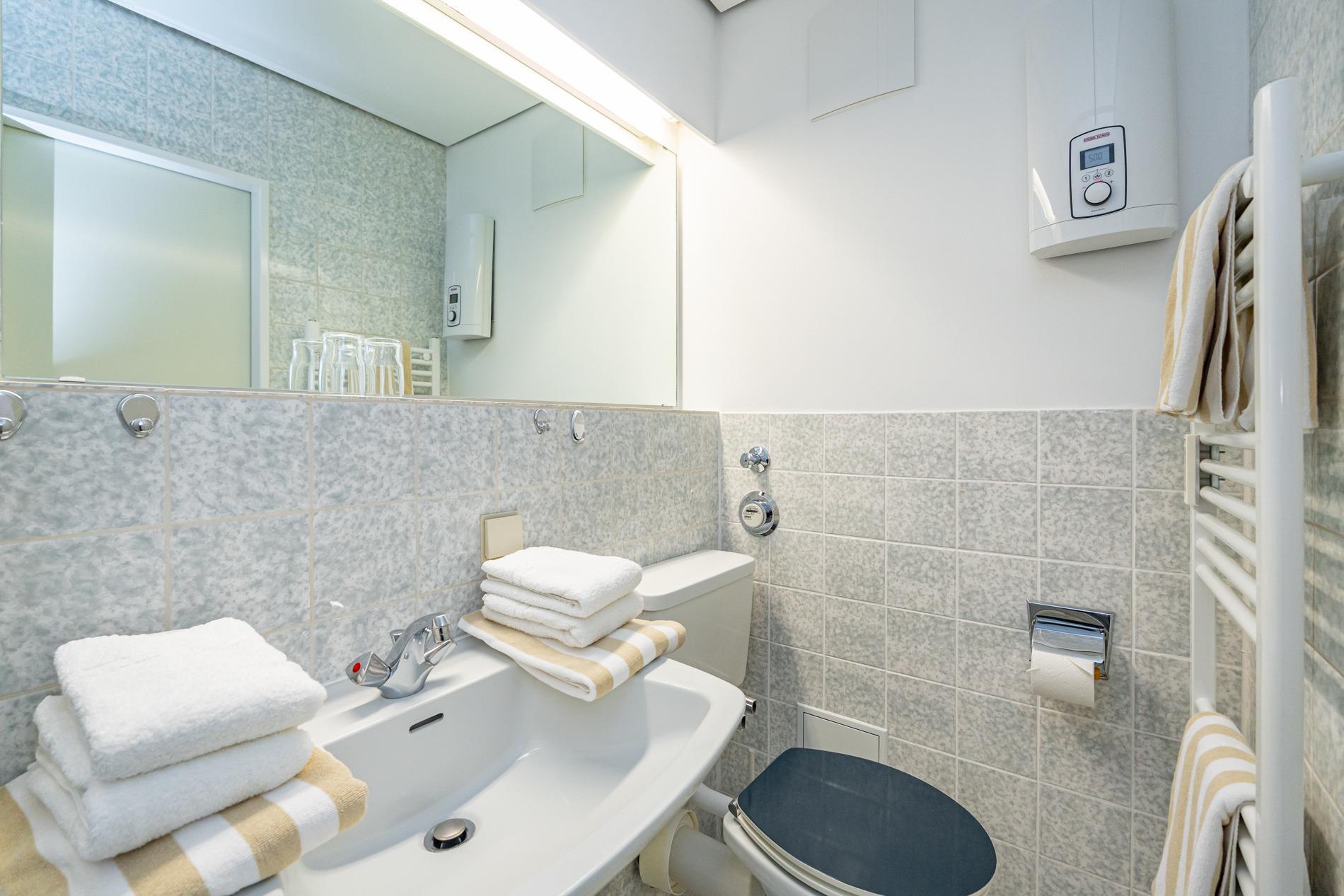 Im Bad befinden sich eine Dusche, ein WC und ein Waschtisch.