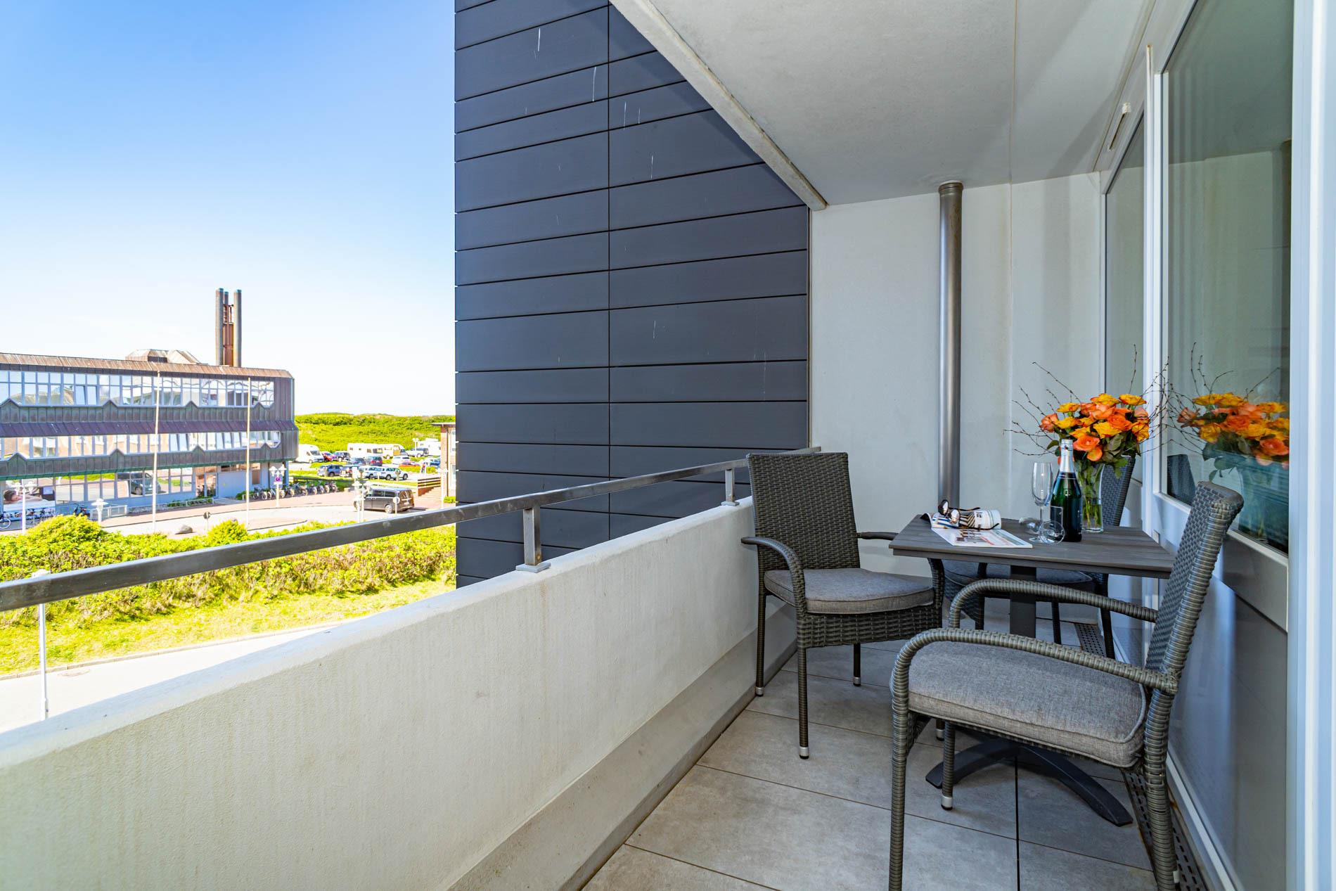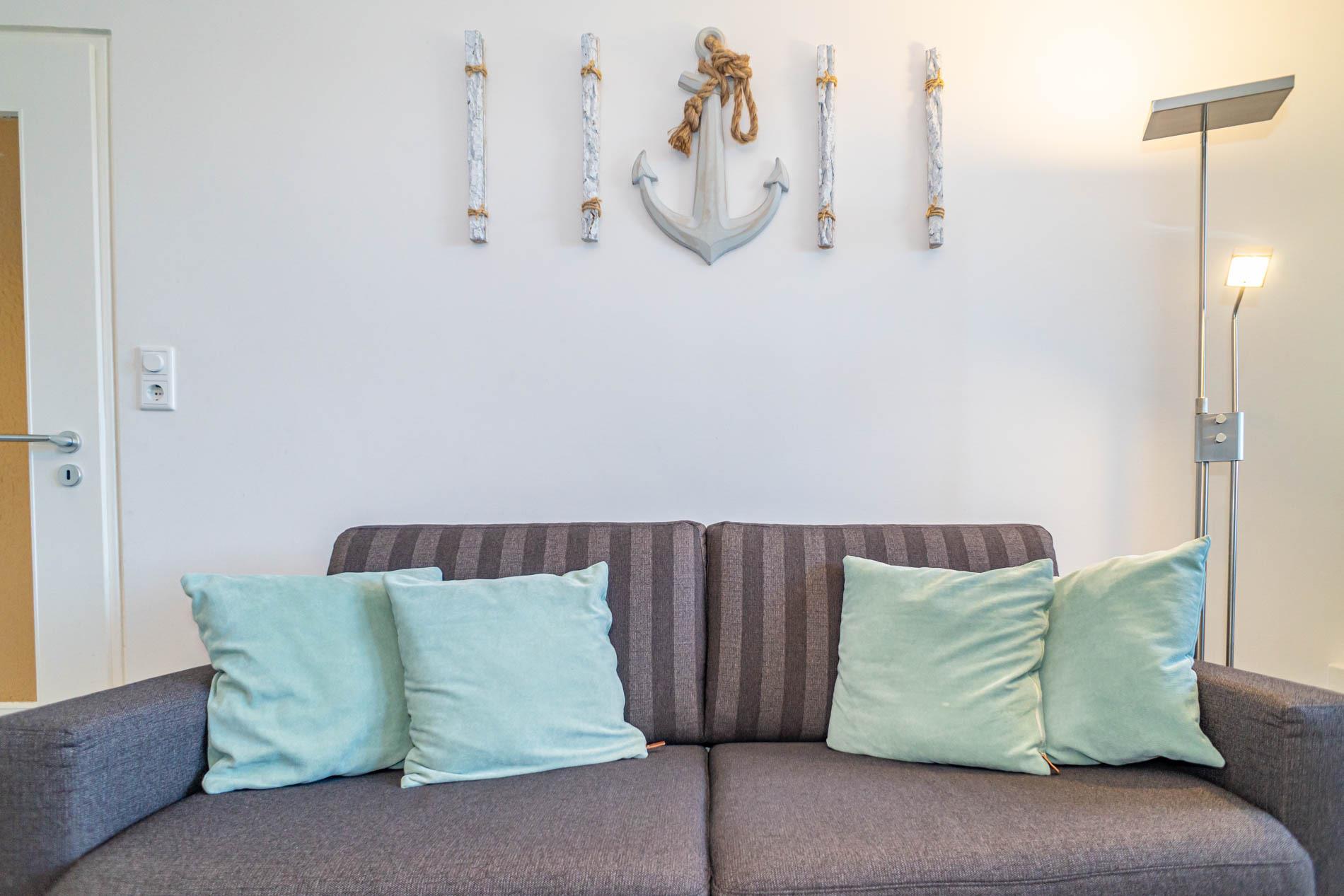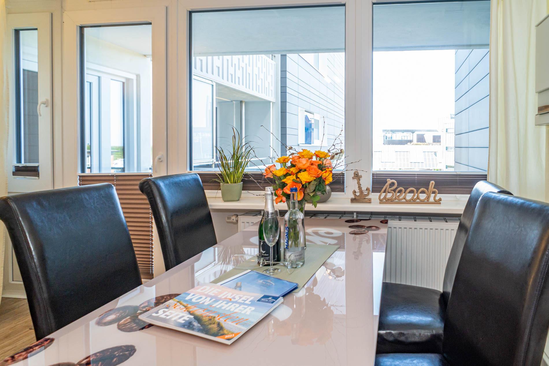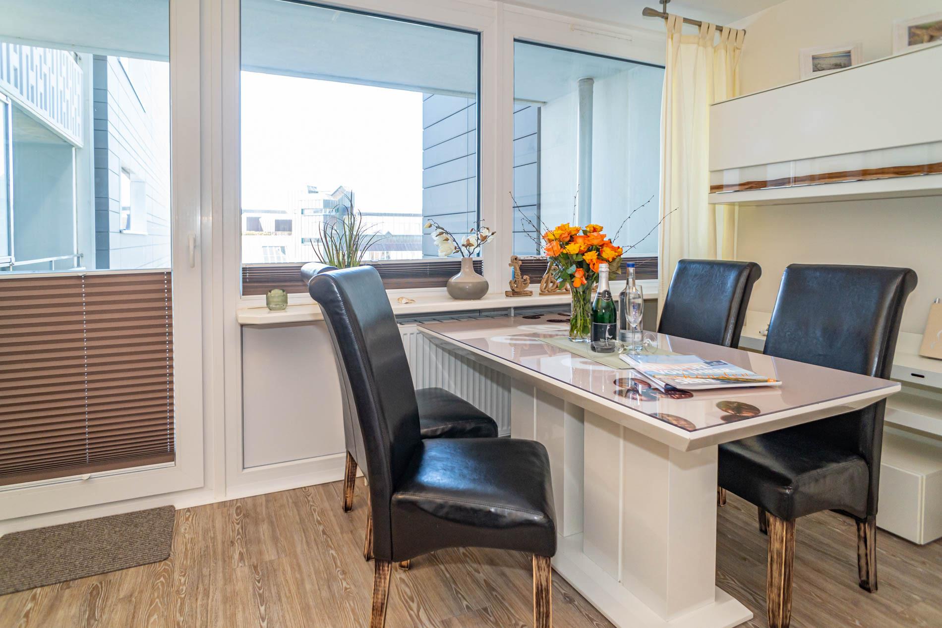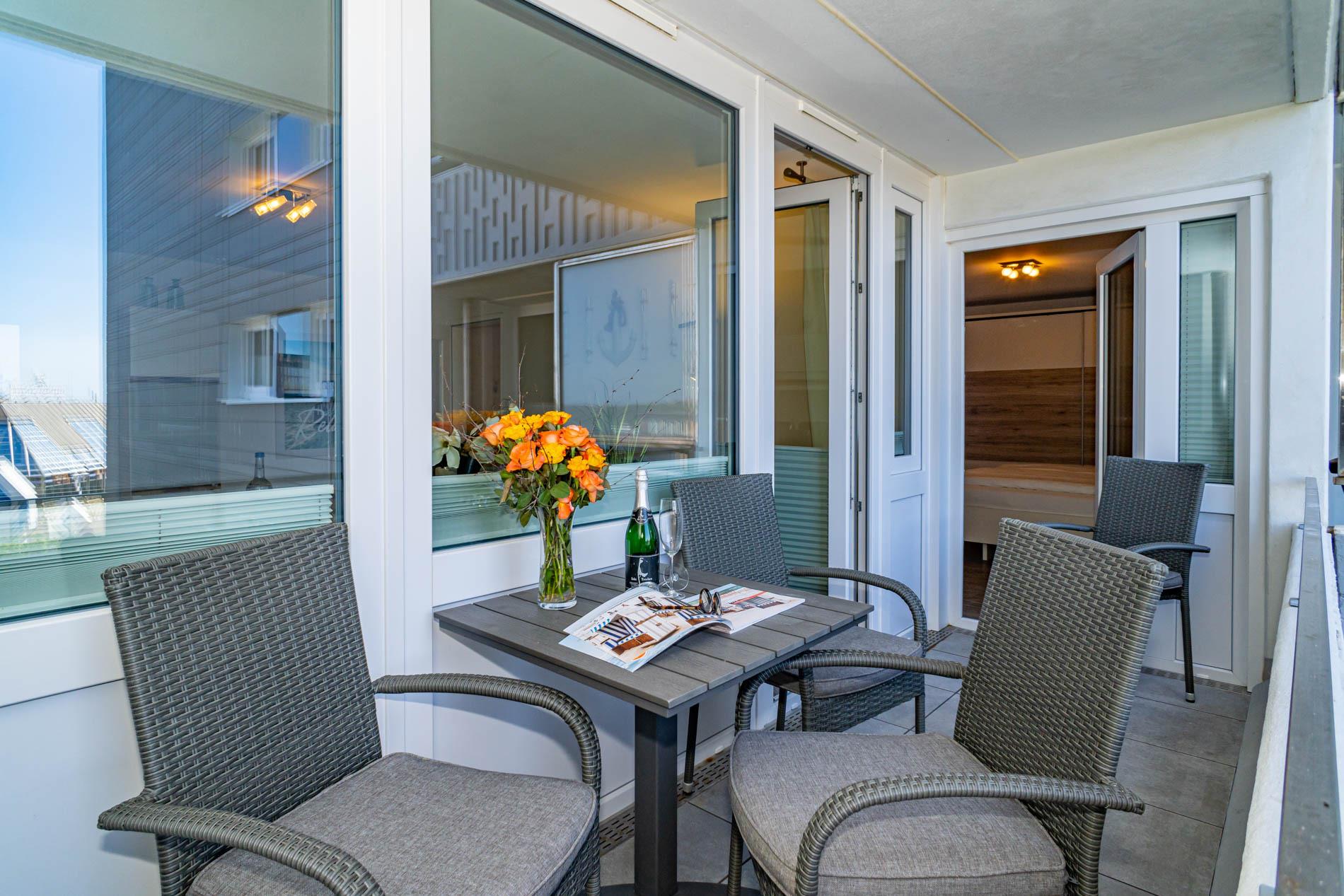 Hochwertig und modern eingerichtete 2-Zimmer-Nichtraucher-Ferienwohnung (ca. 59 qm) in der 2. Etage zur Seeseite mit Westloggia (Nachmittagssonne, mit Balkonmöbeln und Auflagen) für max. 4 Personen.