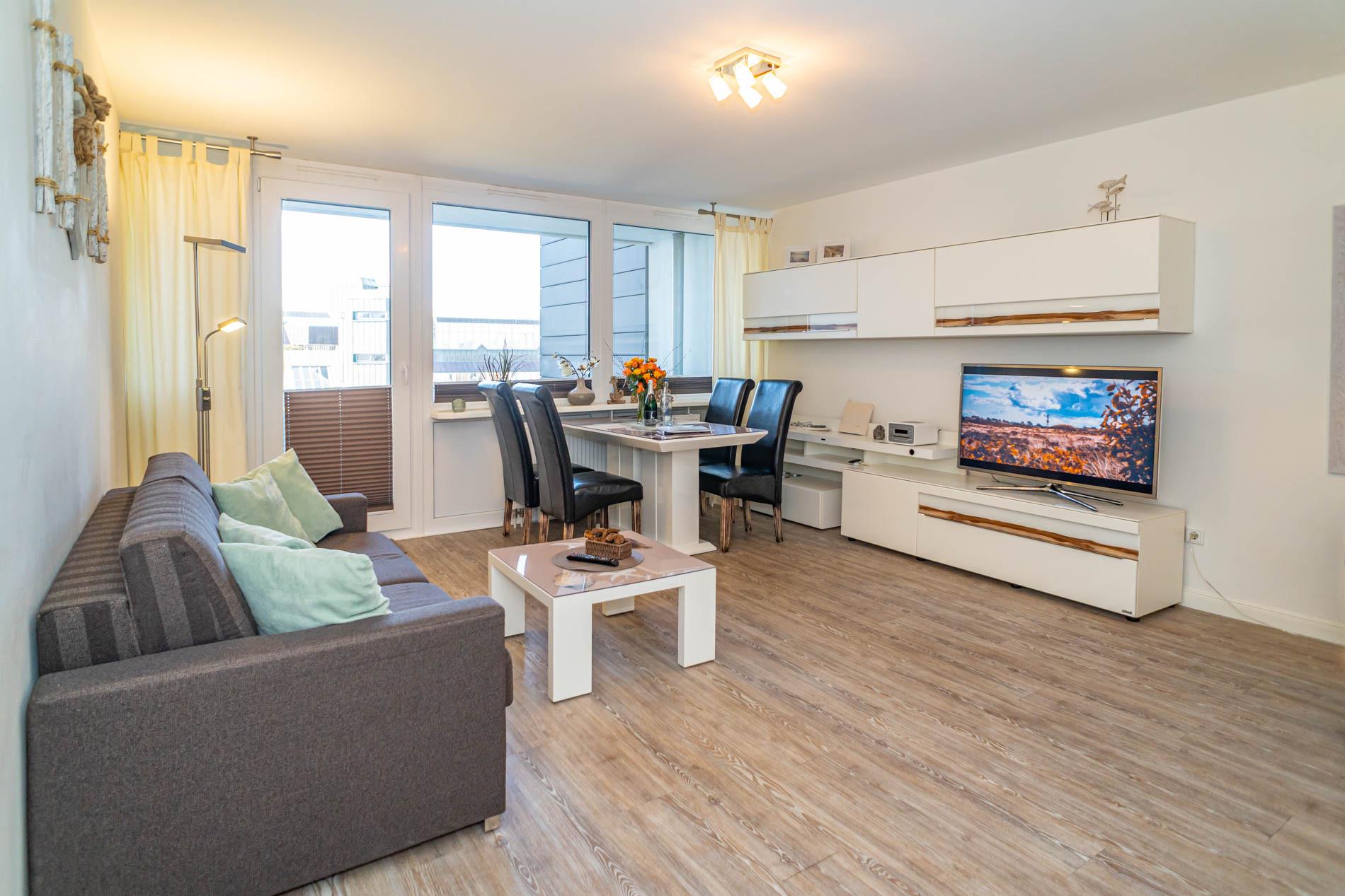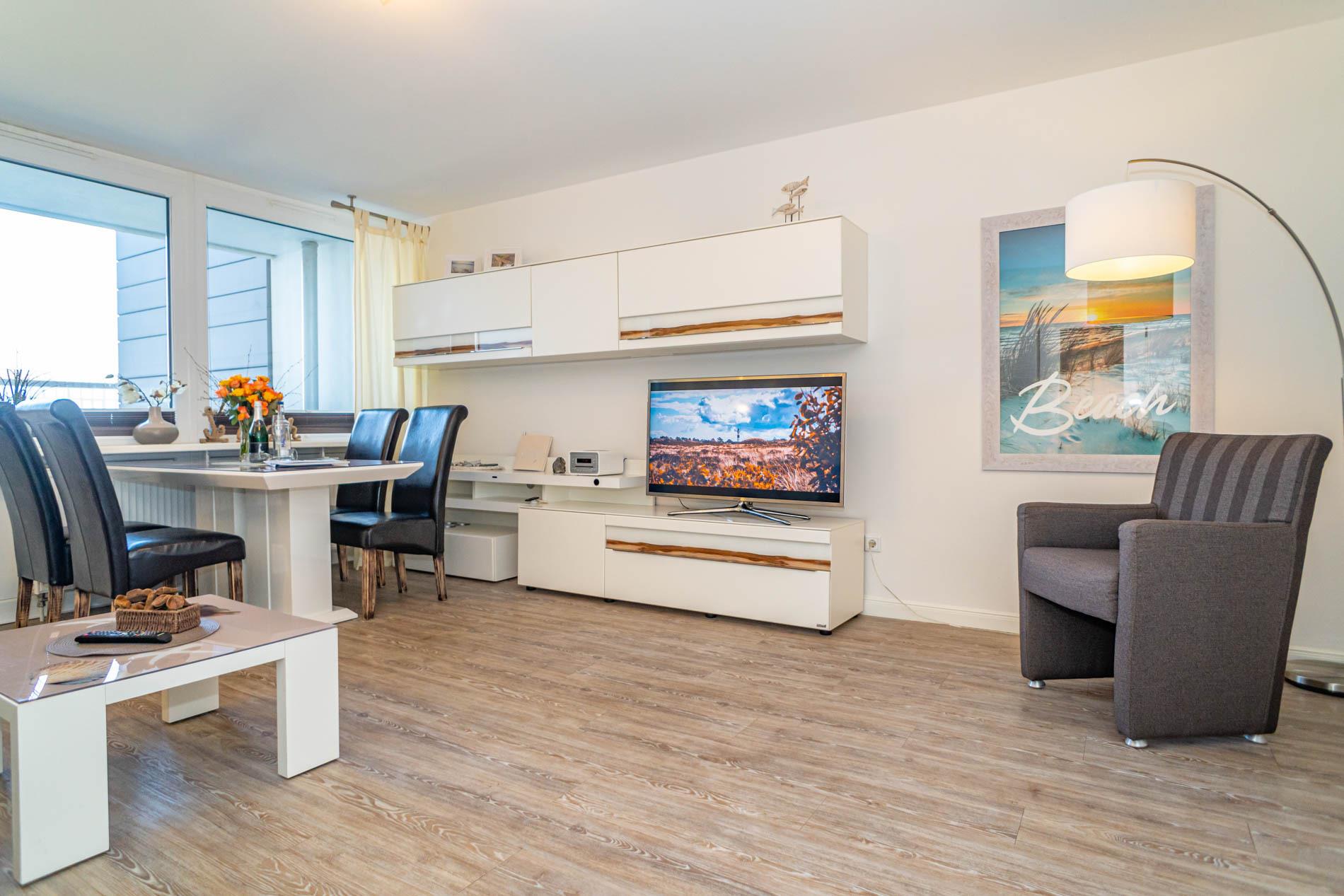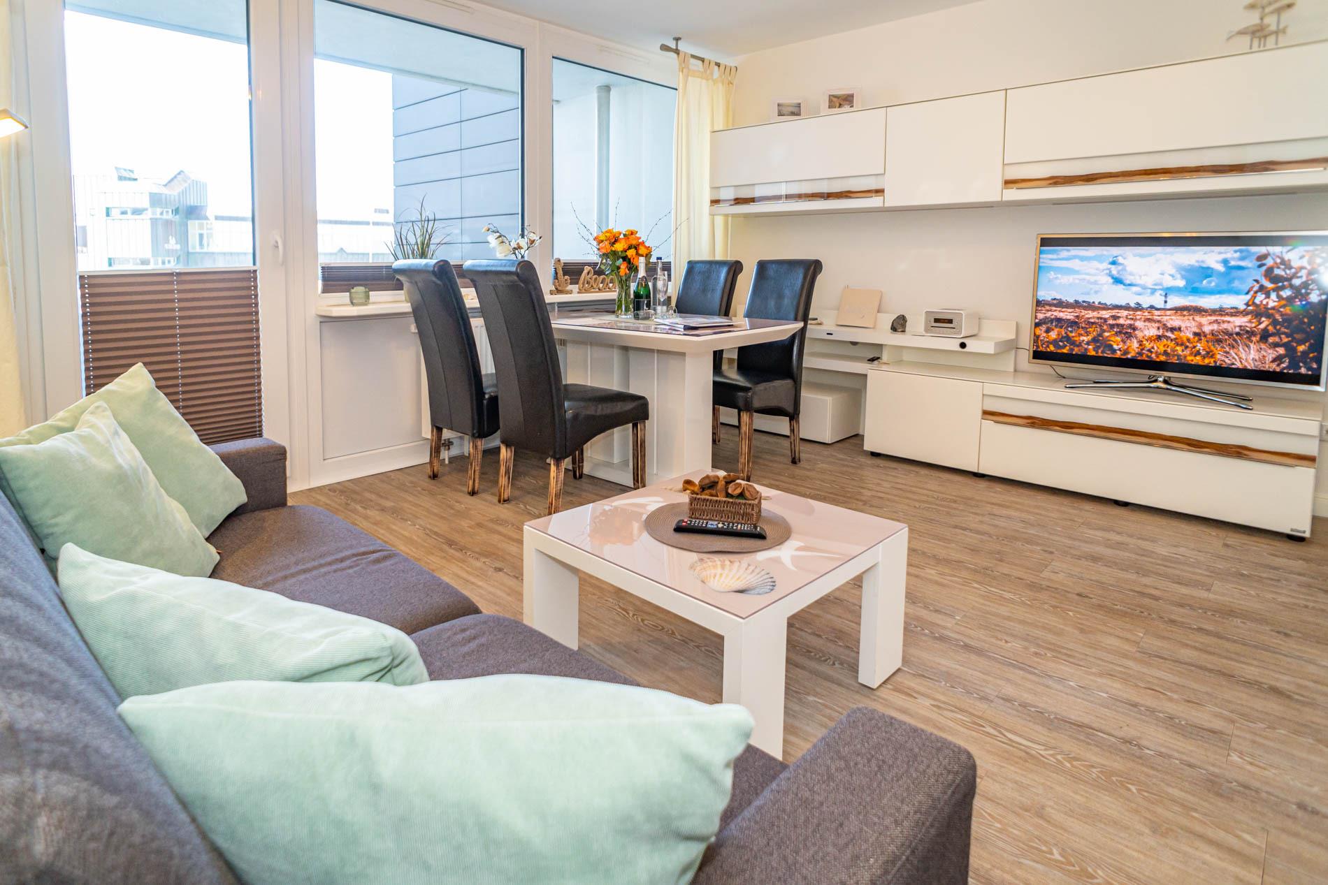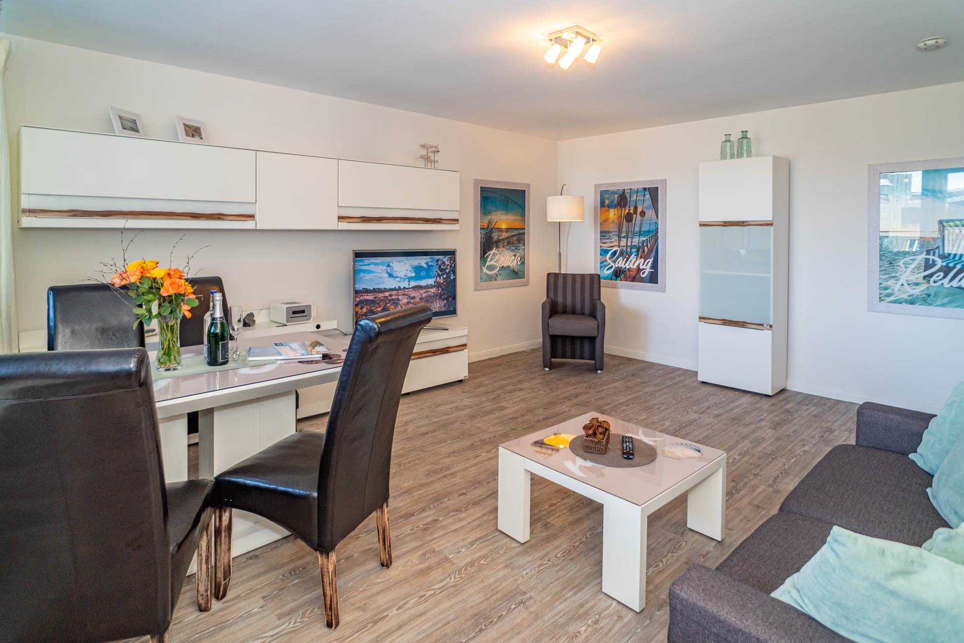 Der Wohnraum besteht aus einer gemütlichen Sitzgarnitur (Doppelschlafcouch und Sessel), einem Essplatz, Kabel-Flachbild-TV, Radio/CD.