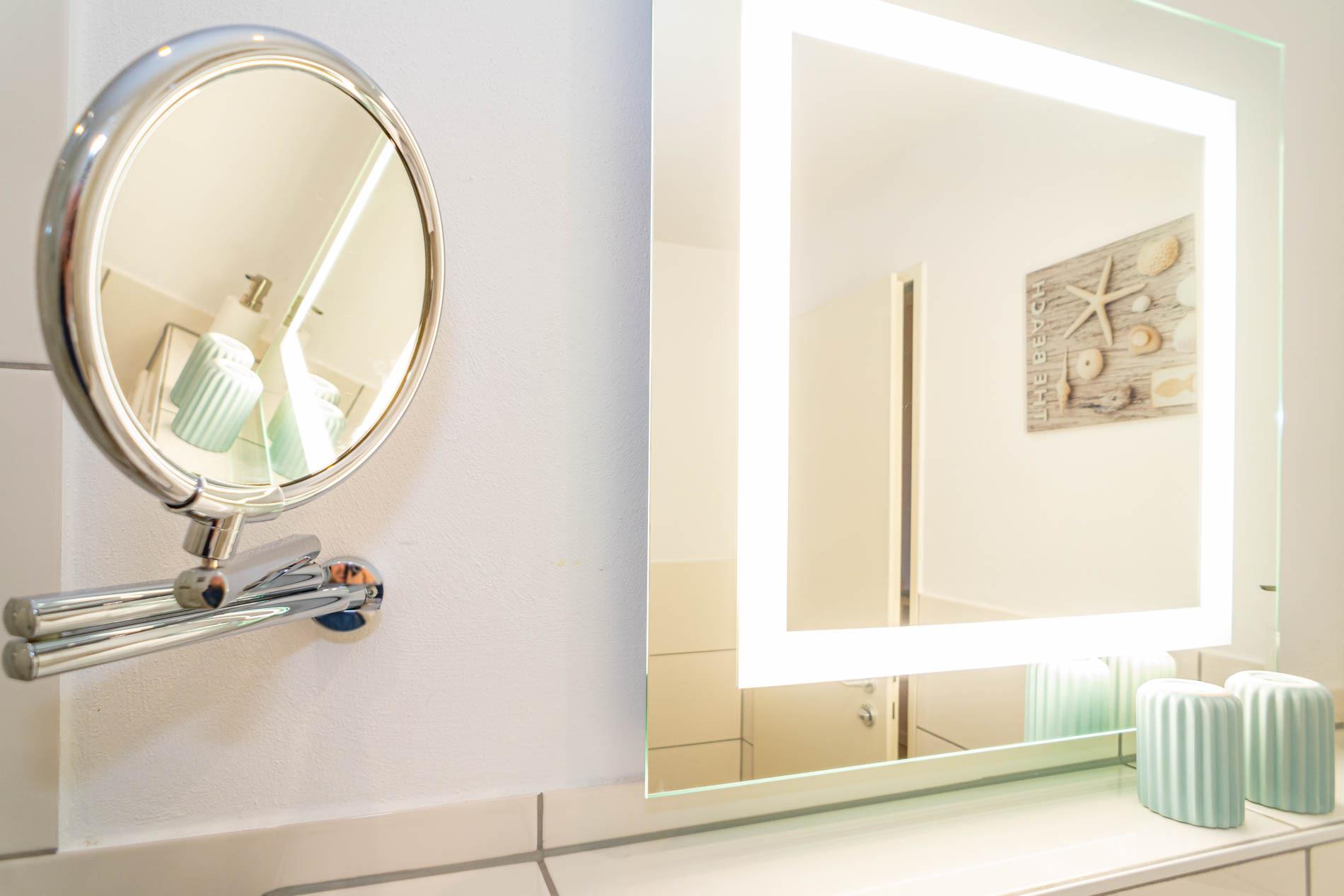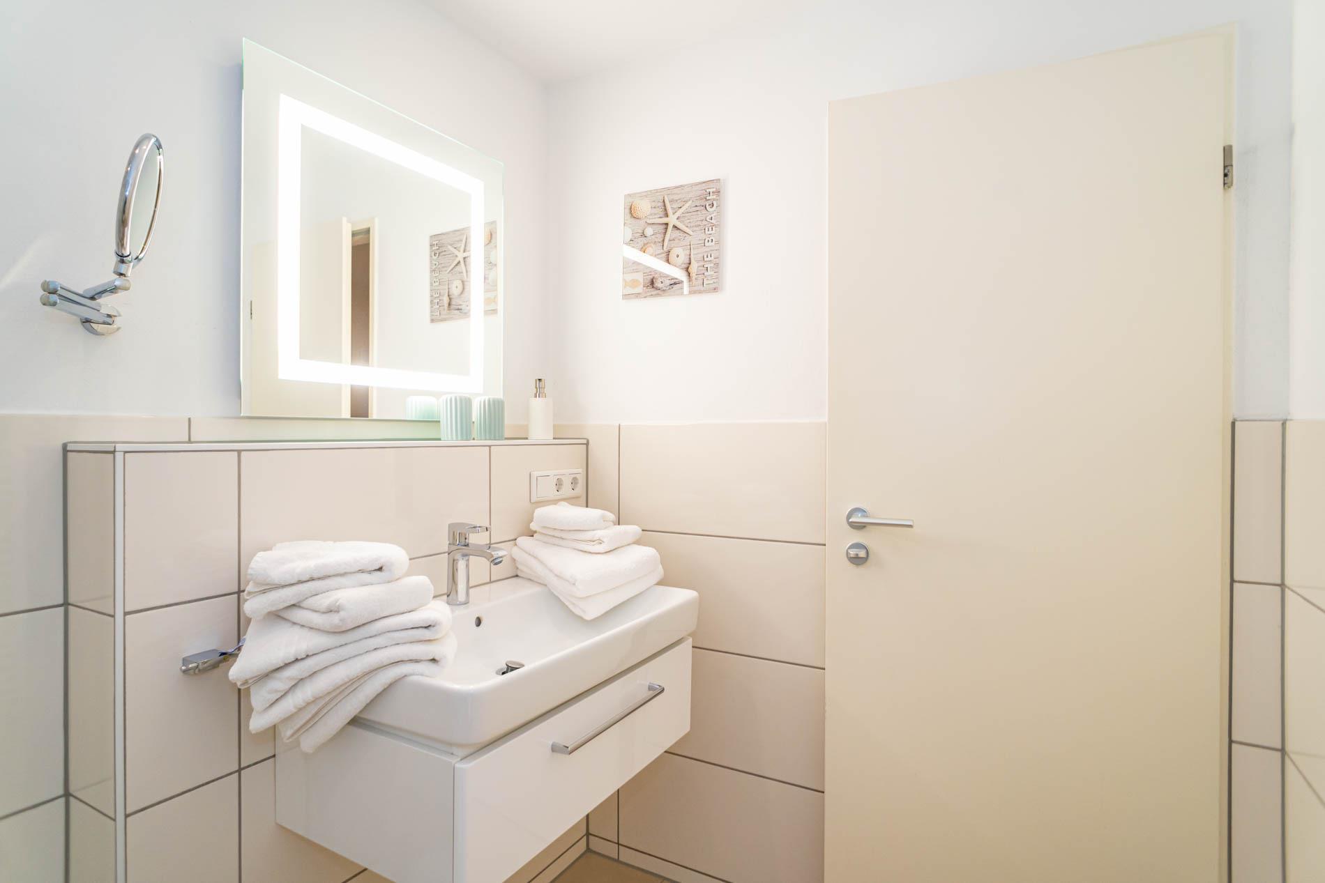 Im modernen Bad befinden sich eine Dusche mit niedrigem Einstieg, ein WC, ein Waschtisch, ein Handtuchtrockner und ein Kosmetikspiegel.