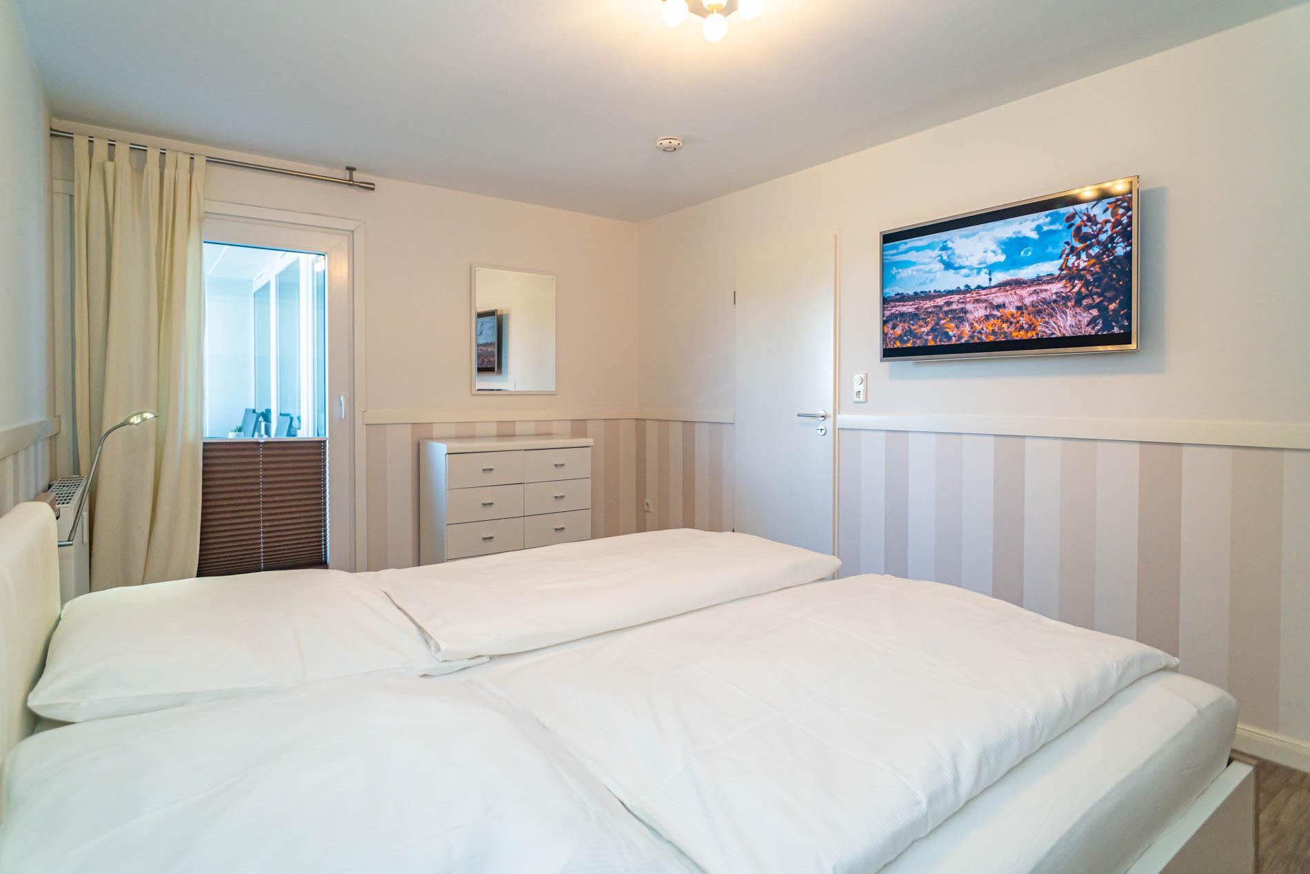 Das Schlafzimmer hat ein Doppelbett mit zwei Einzelmatratzen und einen weiteren großen Kabel-Flachbild-TV. Ein Set mit zwei Bestelltischen und ein gepolsterter Stuhl ist im Schlafzimmer mit vorhanden.