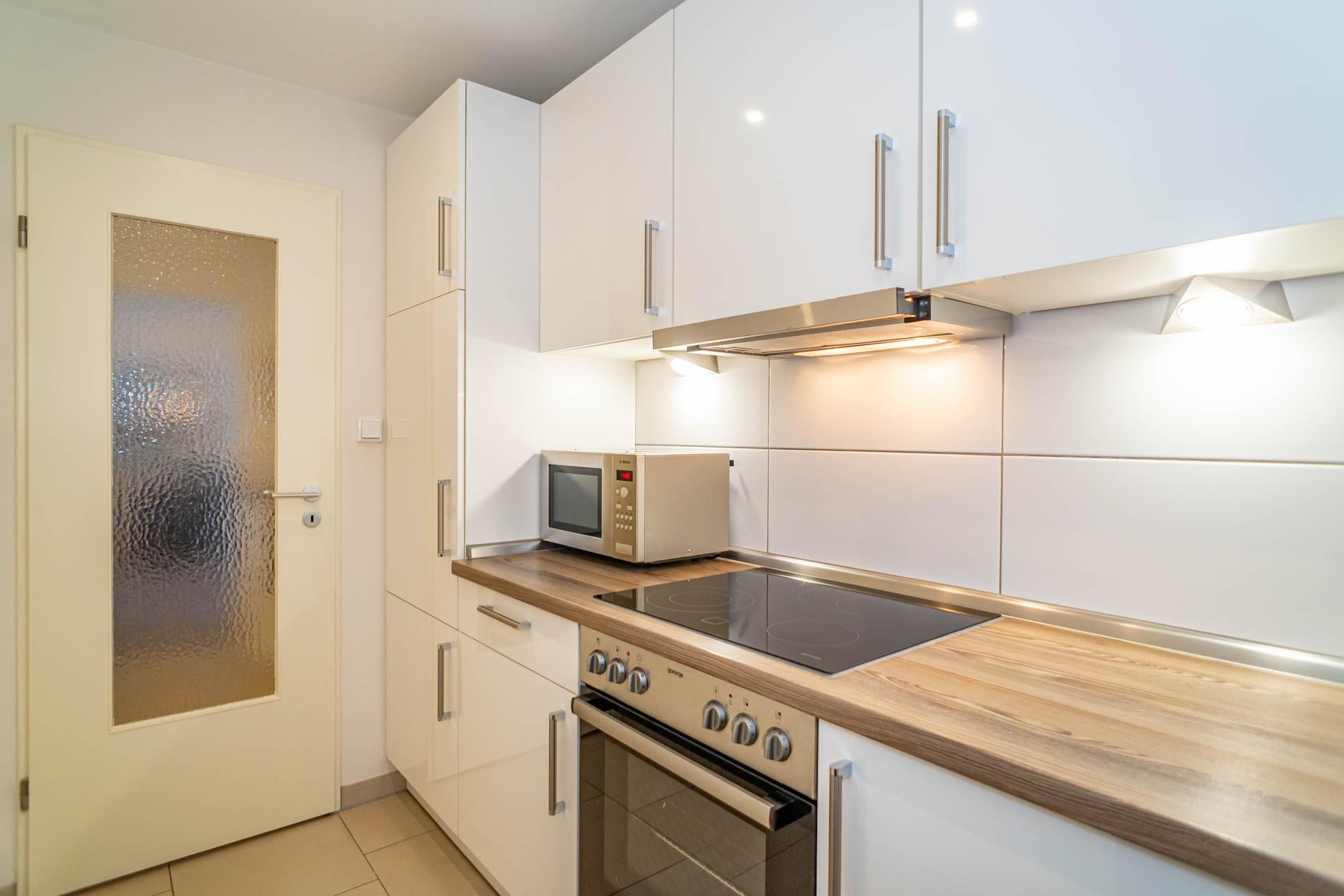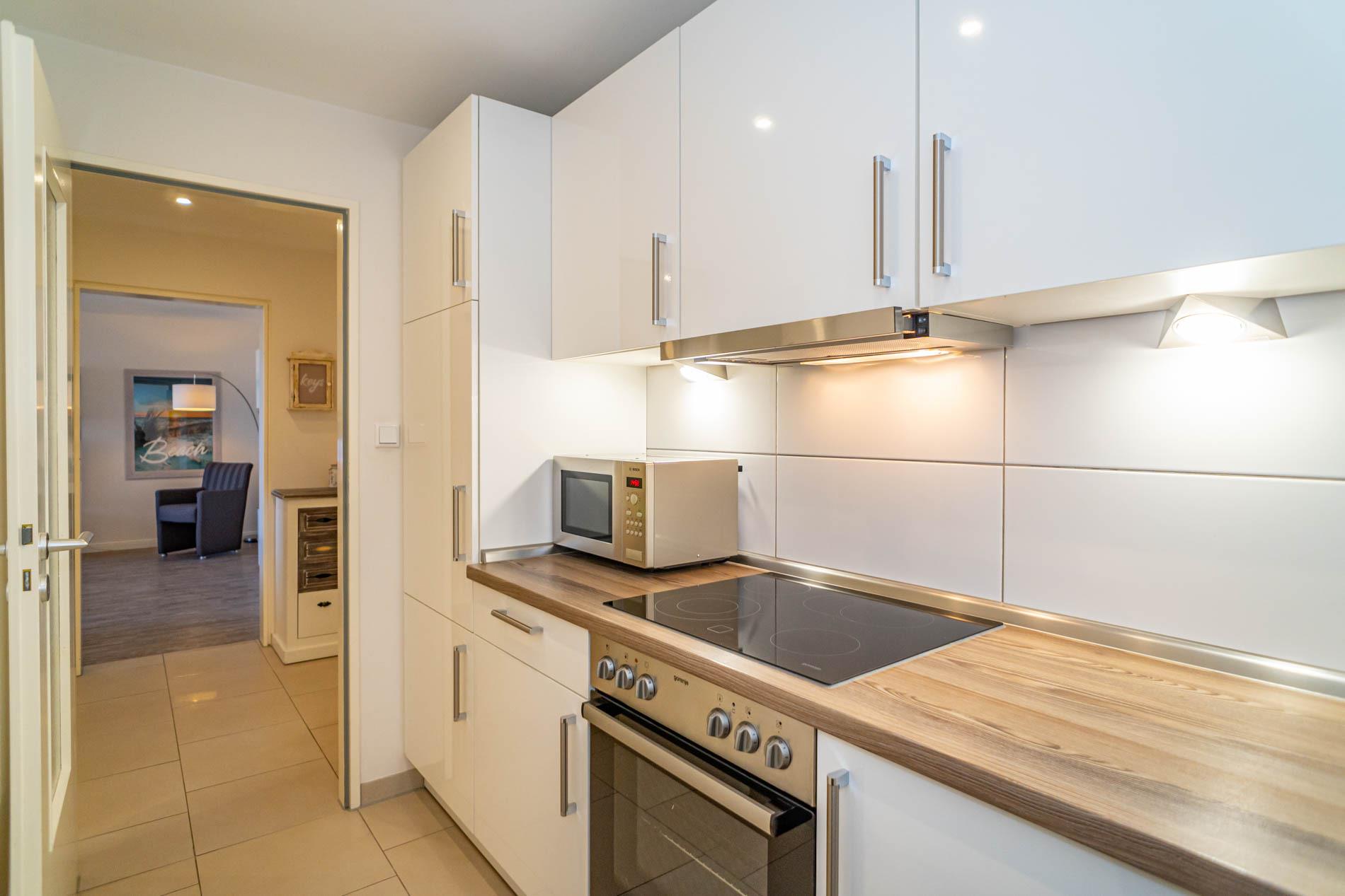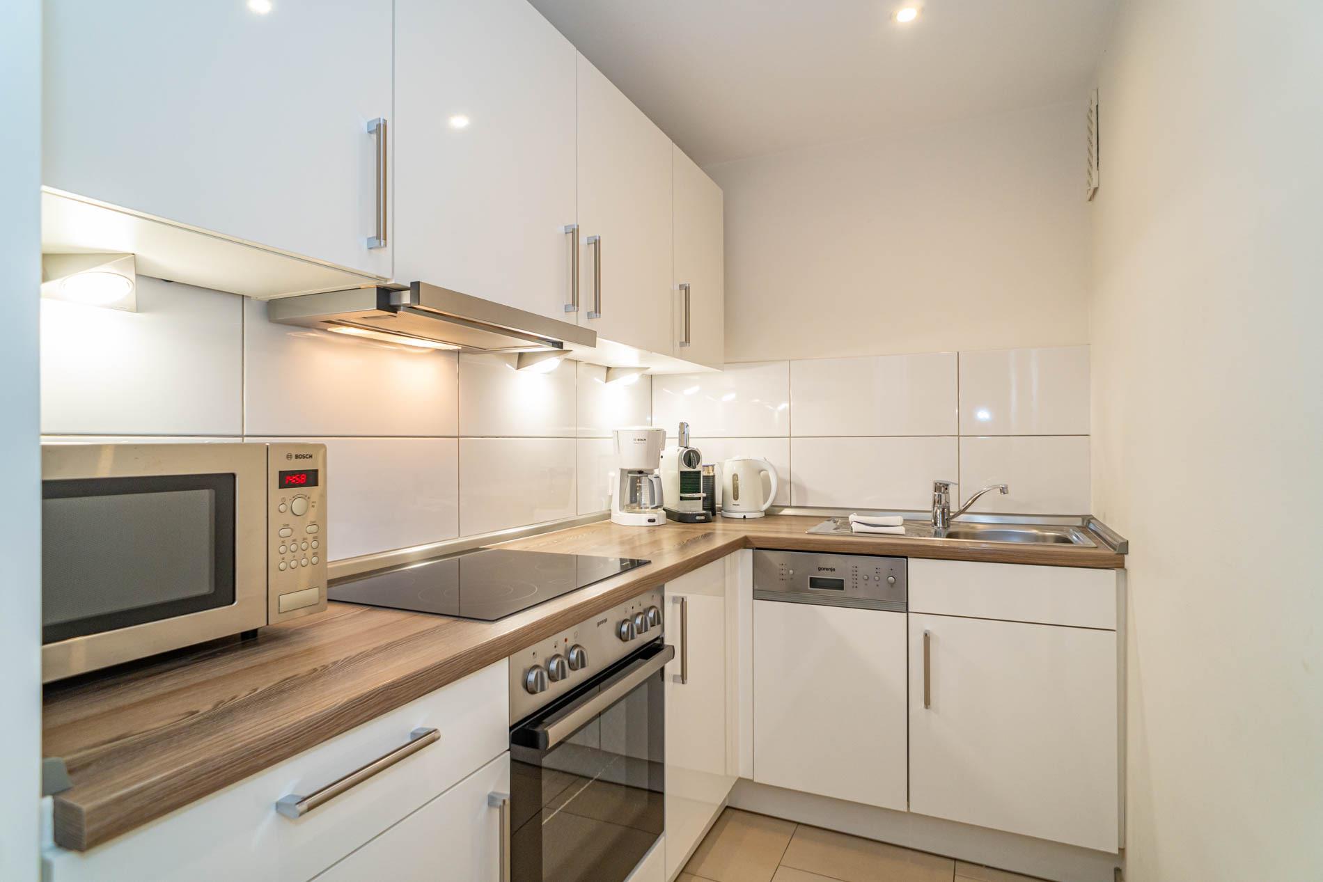 Die Küchenzeile hat einen Herd mit Backofen und Cerankochfeld, einen Geschirrspüler, eine Mikrowelle und einen Kühlschrank mit 3-Sterne-Gefrierfach. Nespresso-Kapsel-Kaffeemaschine und Kaffee-Filtermaschine, Wasserkocher und Toaster gehören zur Grundausstattung.