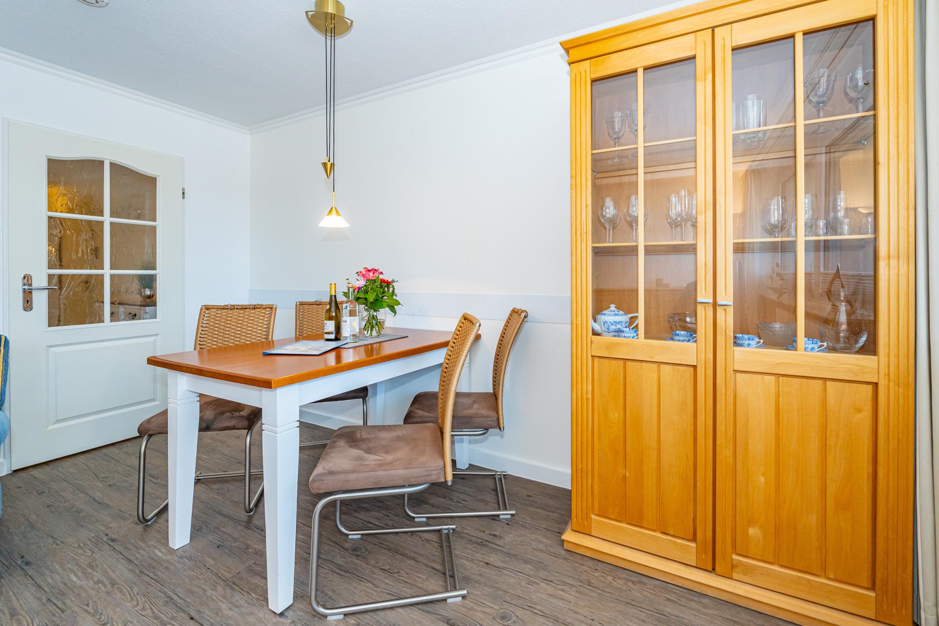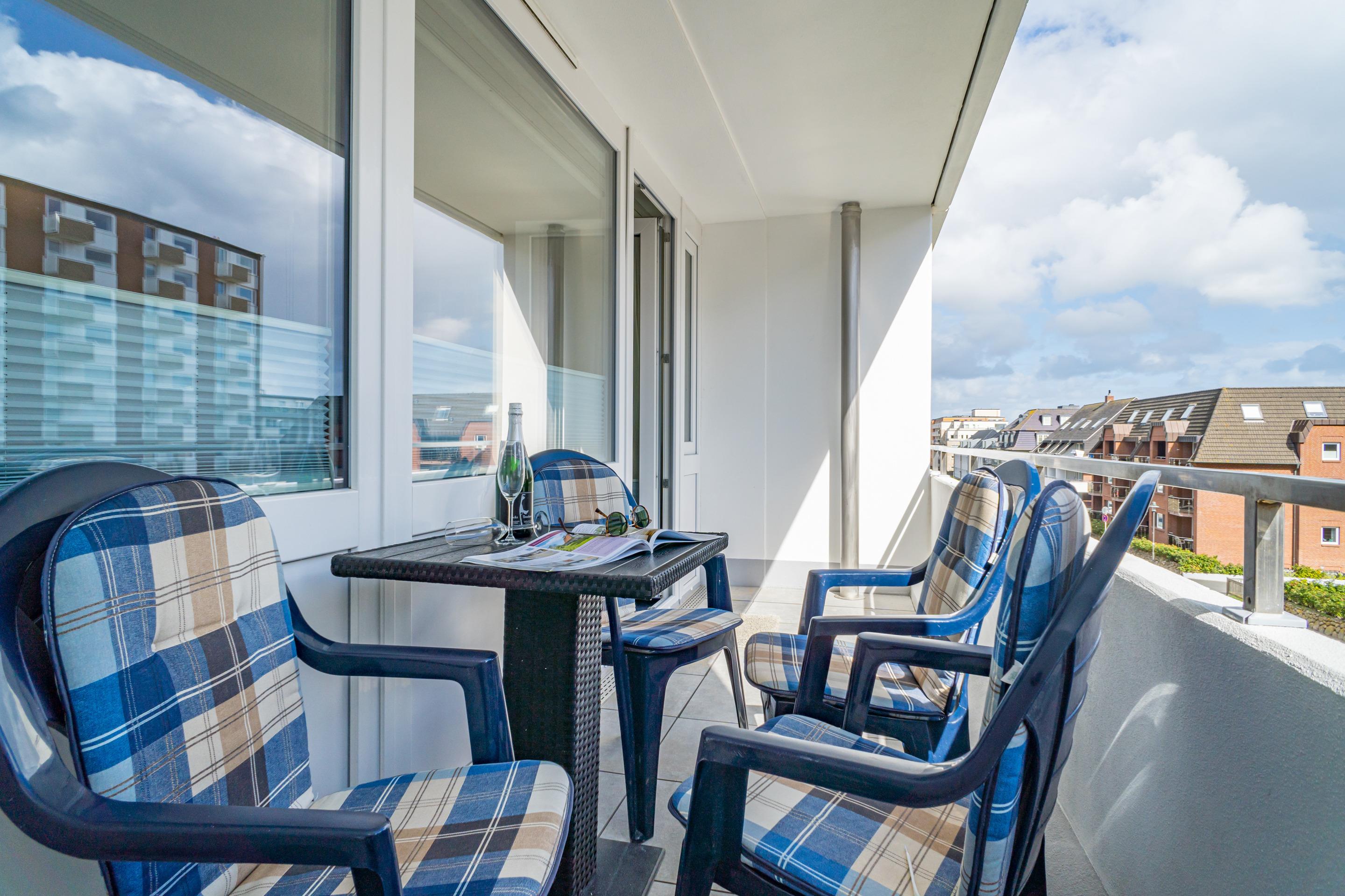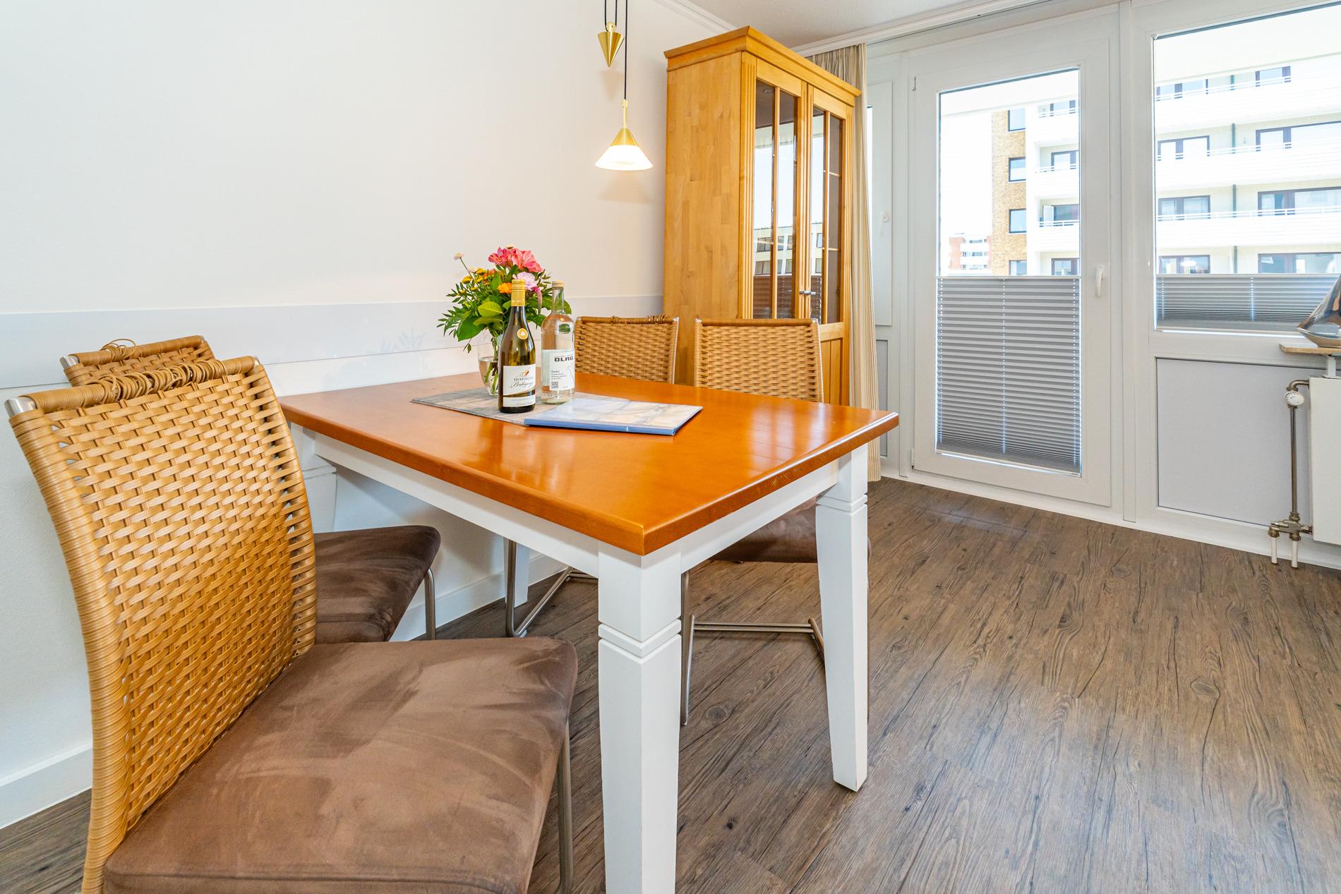 Schick renovierte 3-Zimmer-Nichtraucher-Ferienwohnung, ca. 63 qm, in der 2. Etage zur Landseite mit Ostloggia (Morgensonne, mit Balkonmöbeln und Auflagen) für max. 4 Personen (stufenfrei erreichbar).