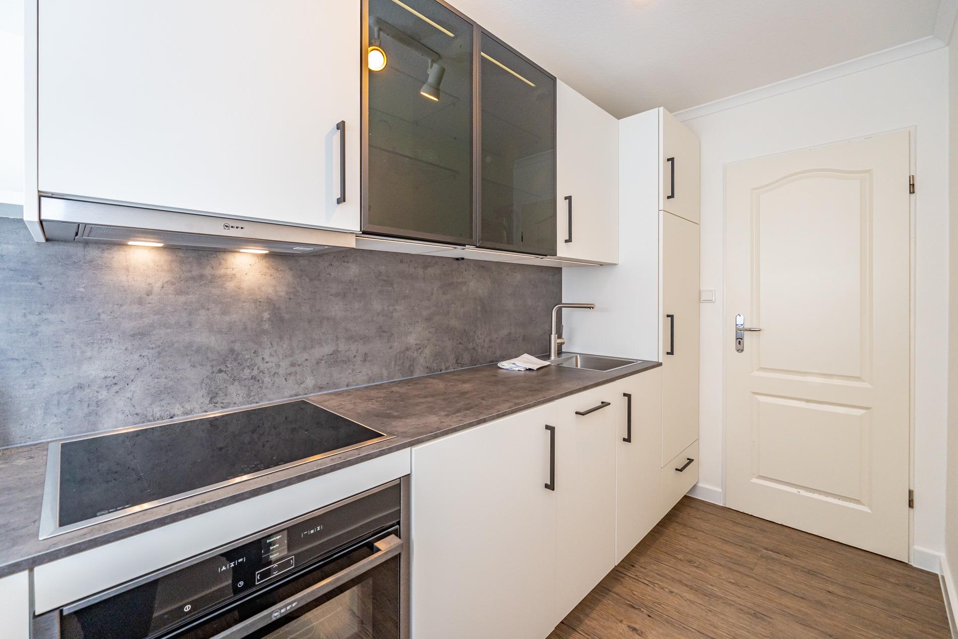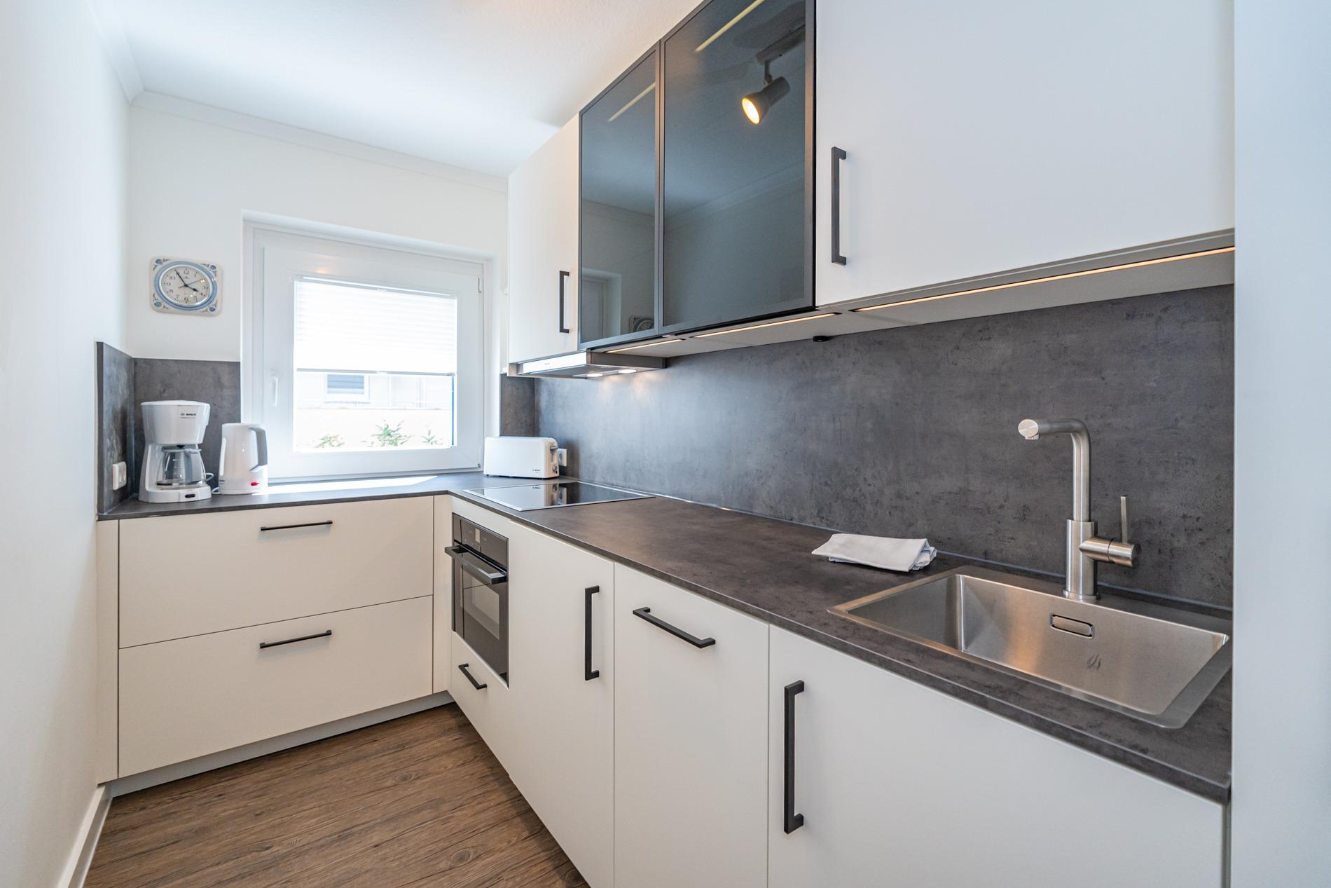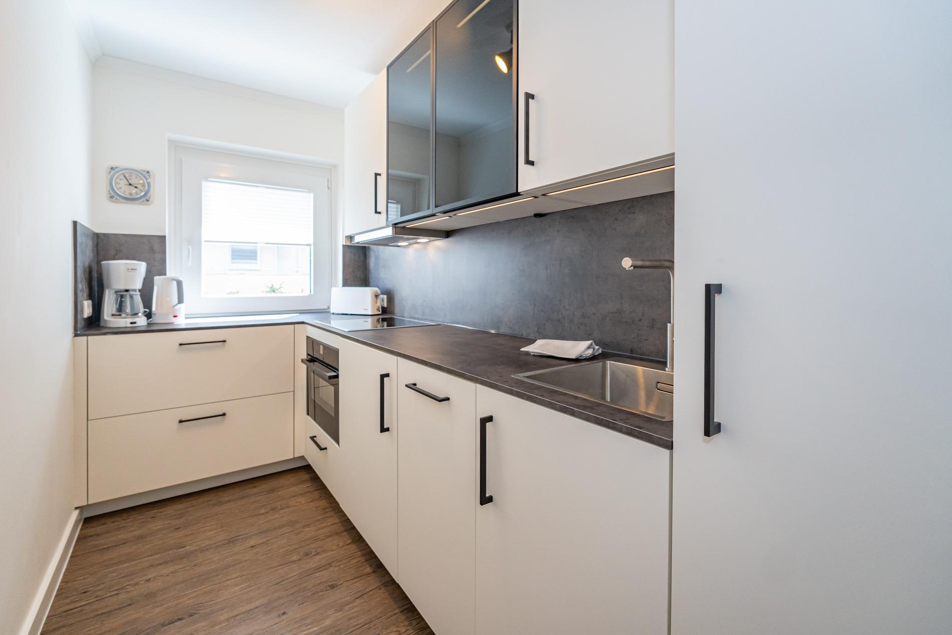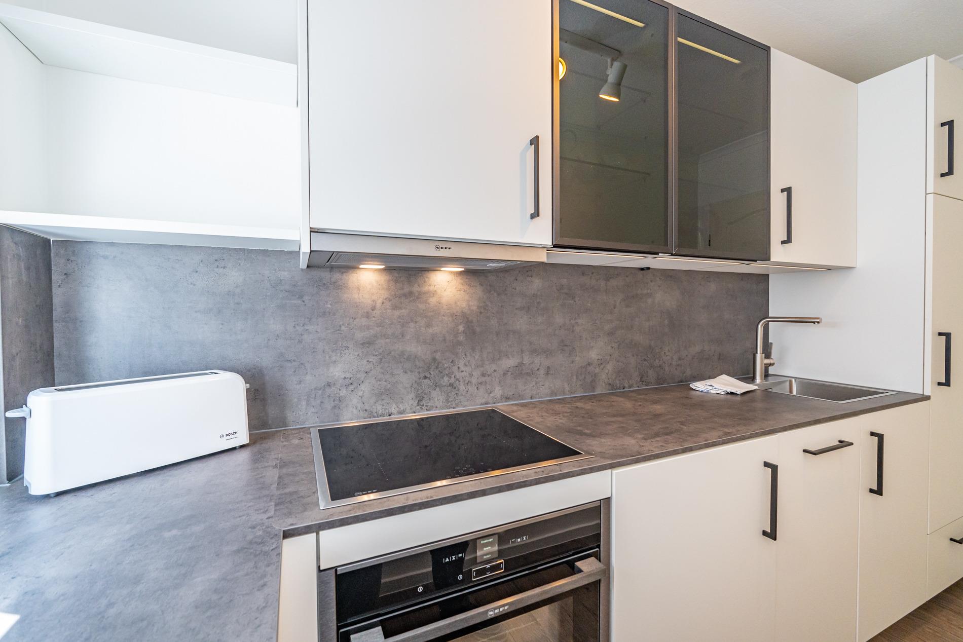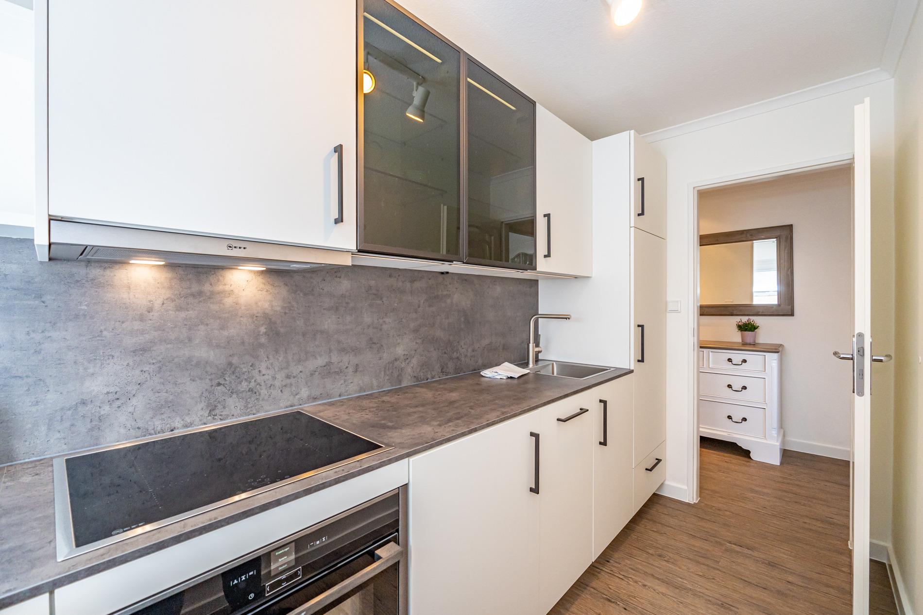 Die separate, vollausgestattete Küche hat einen Geschirrspüler, ein Ceranfeld (4 Kochfelder), einen Backofen, eine Nespresso-Maschine, einen Kühlschrank mit 3-Sterne-Gefrierfach und ein Fenster. Kaffeemaschine, Wasserkocher und Toaster gehören zur Grundausstattung.