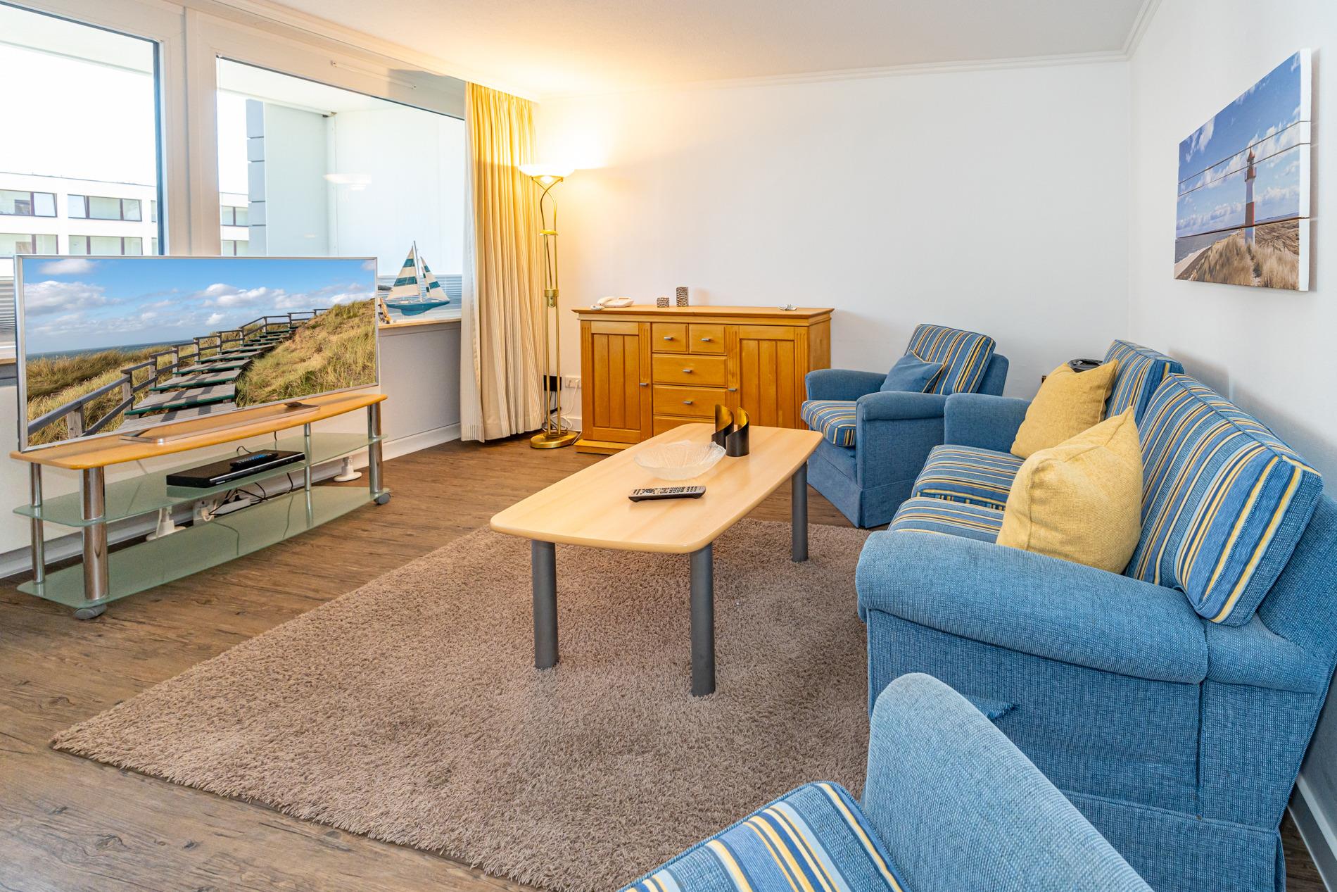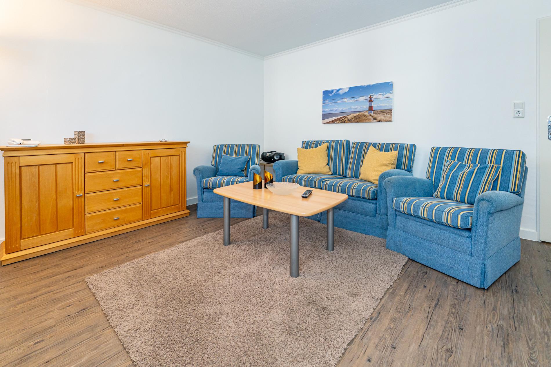 Der Wohnraum besteht aus einer bequemen Sitzgarnitur (2-Sitzer-Couch und 2 Sessel), einem Essplatz, Kabel-Flachbild-TV, DVD-Player, Radio/CD-Player.