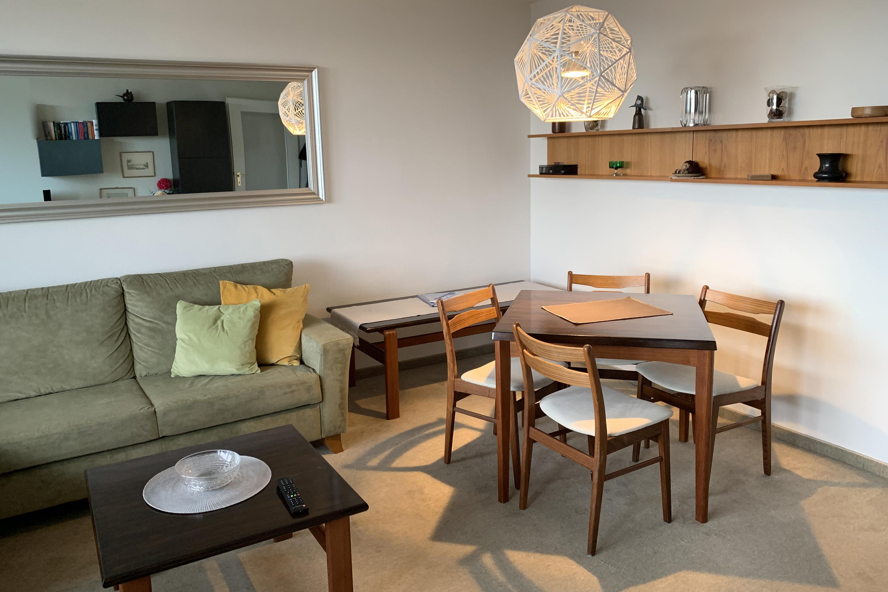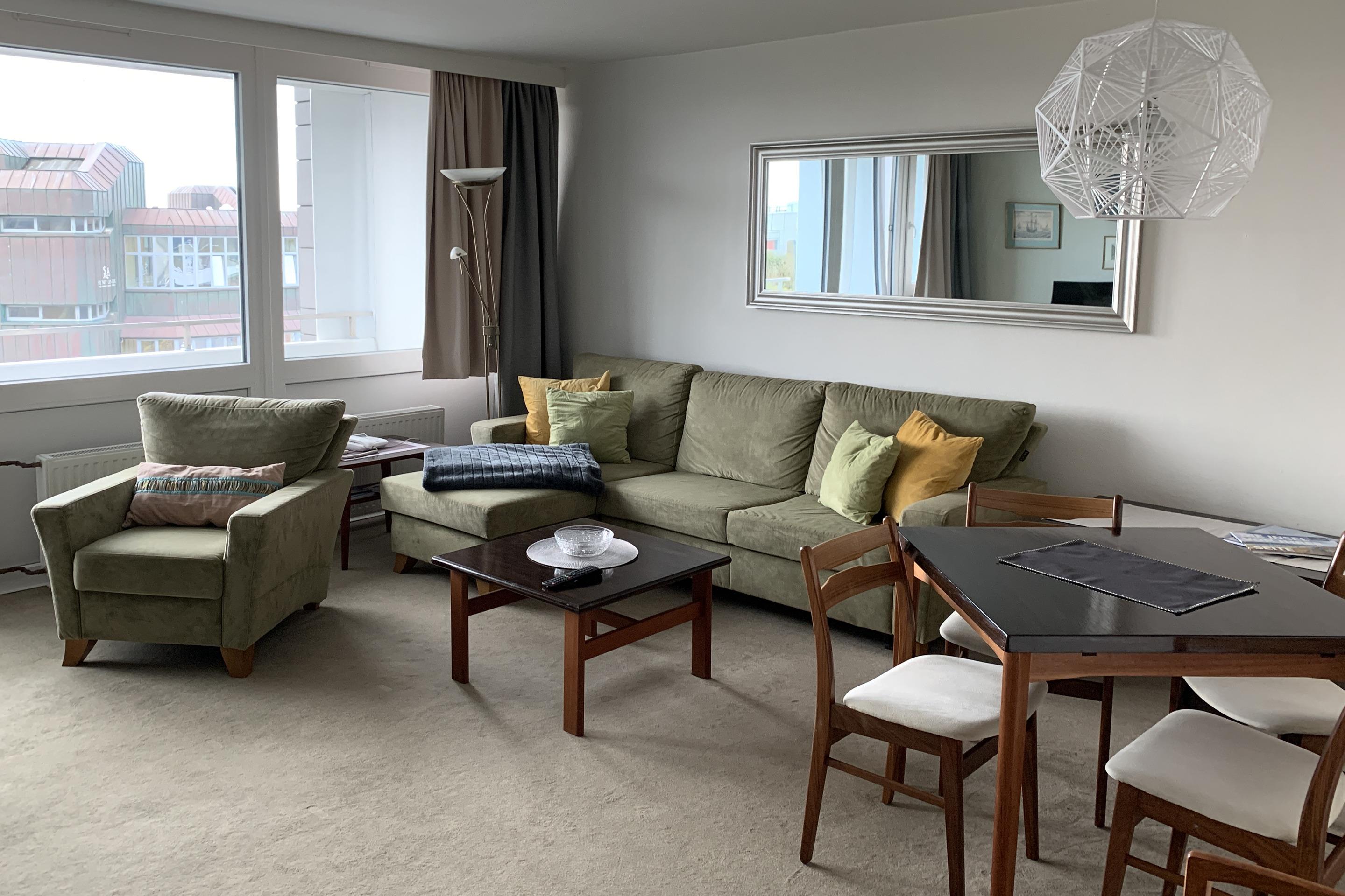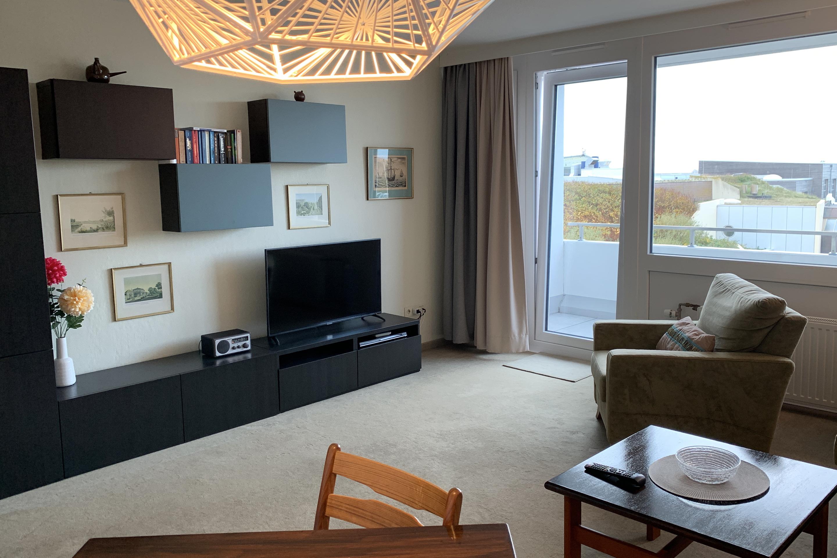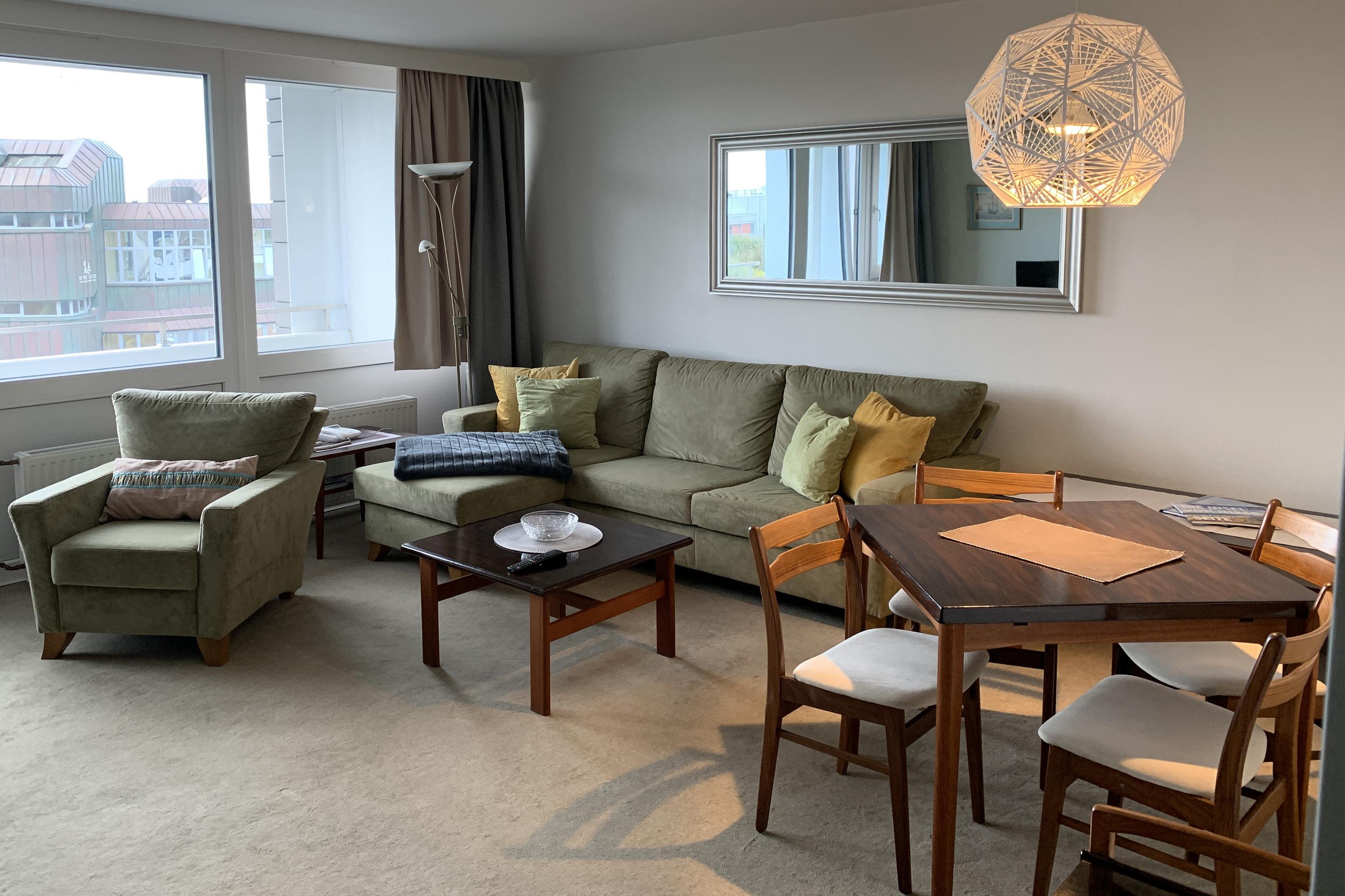 Der Wohnraum besteht aus einer Sitzgarnitur (Schlafcouch 1,20 x 2,10 m und Sessel), Kabel-TV, DVD-Player, Raumverdunkelung durch Dim out Vorhang.