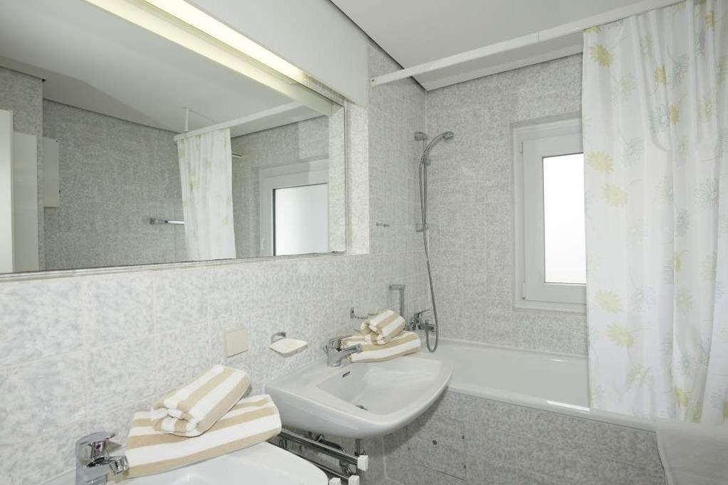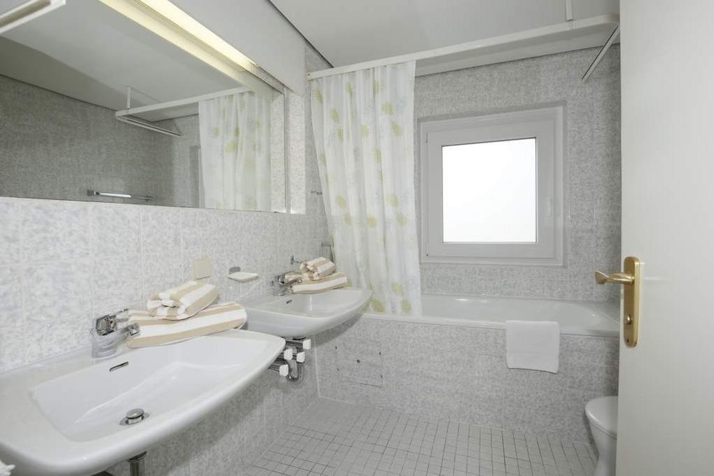 Im Bad befinden sich eine Wanne, ein WC, zwei Waschtische und ein Fenster.