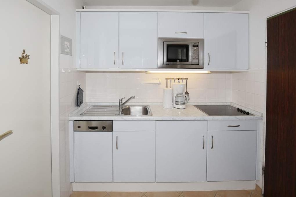 Die neue Küchenzeile hat einen Geschirrspüler, ein Cerankochfeld, eine Mikrowelle und einen Kühlschrank mit 3*-Gefrierfach. Kaffeemaschine, Wasserkocher und Toaster gehören zur Grundausstattung.