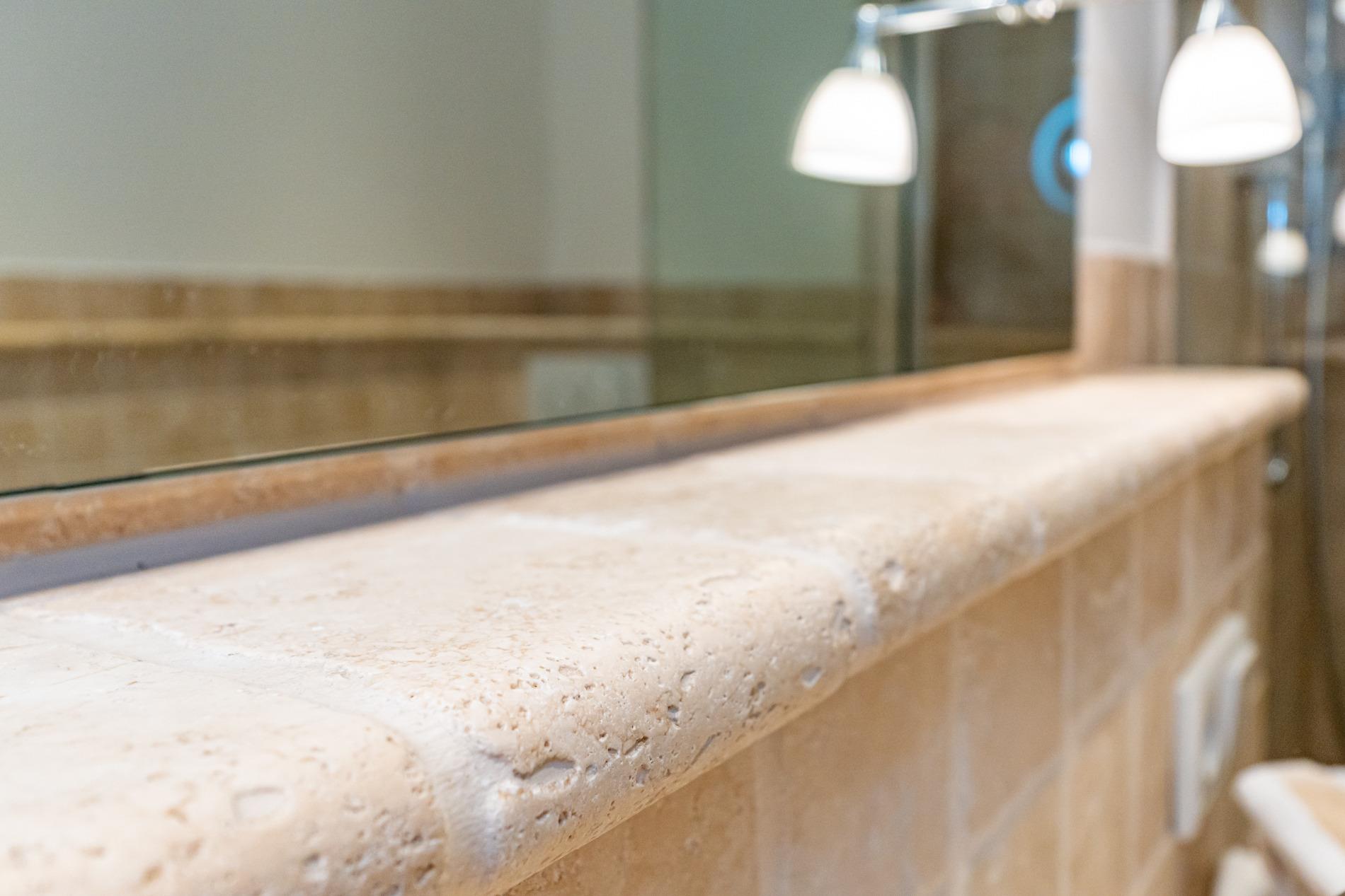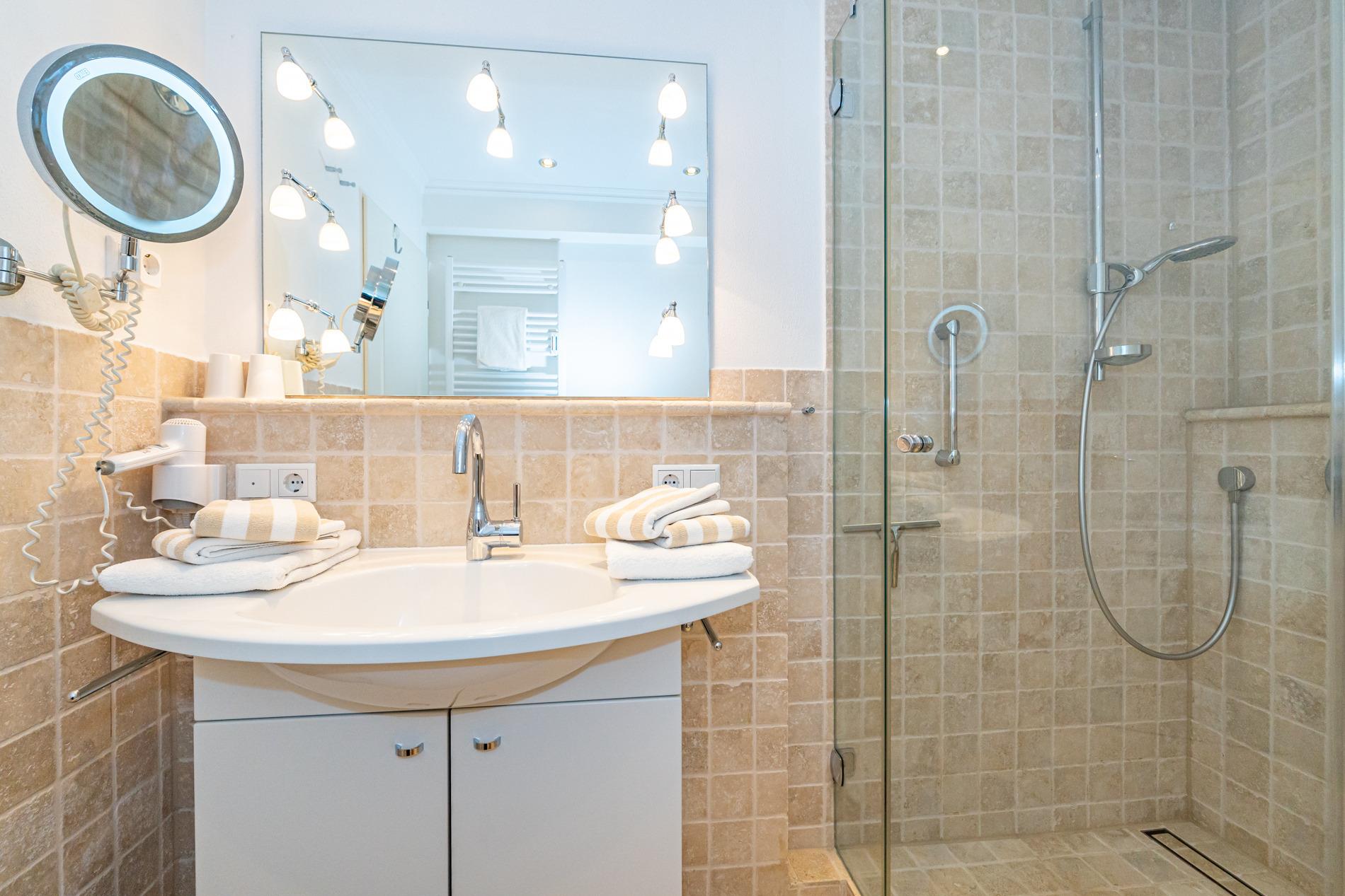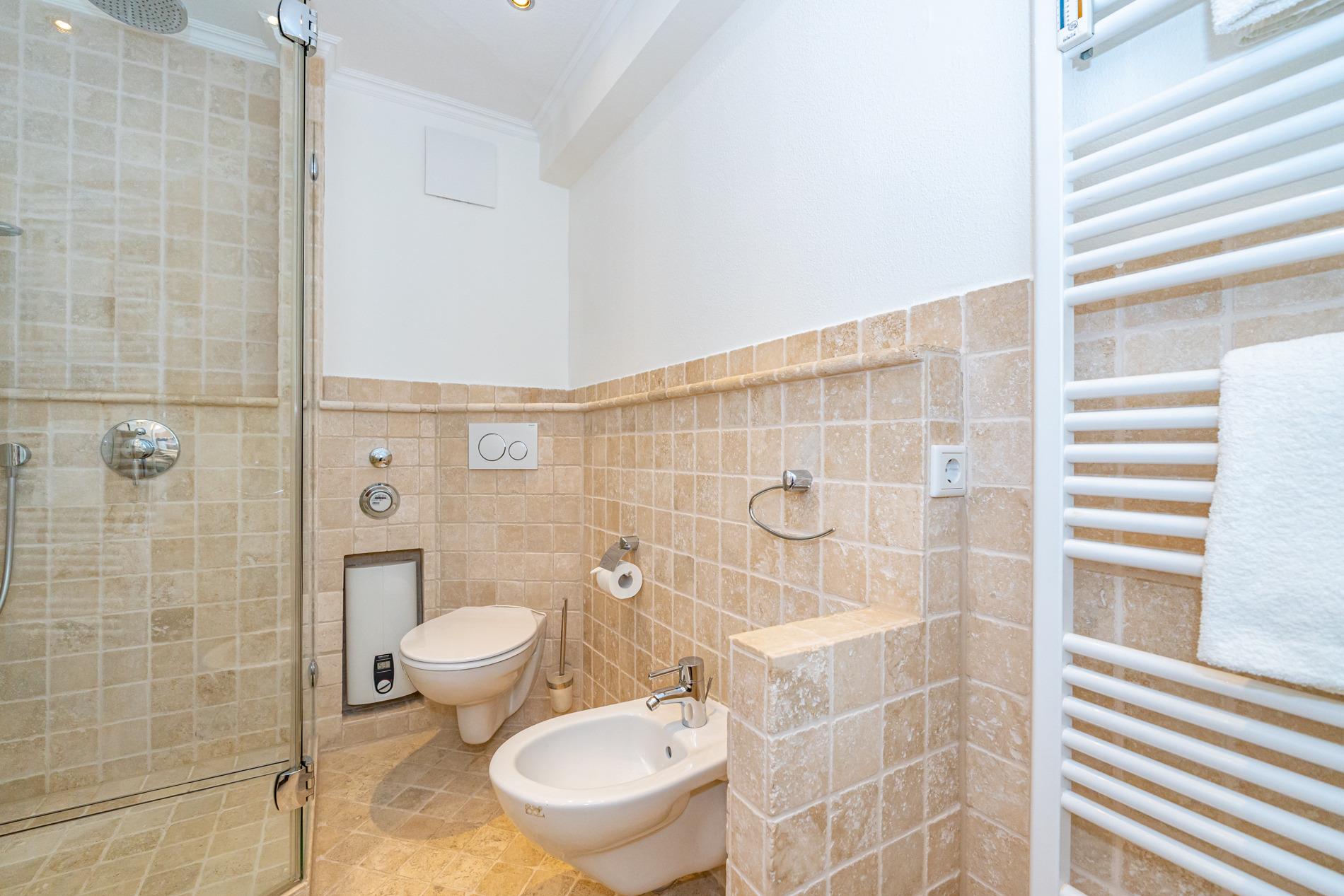 Im modernen Bad befinden sich eine flache Dusche, ein WC, ein Bidet, ein Waschtisch, ein Handtuchtrockner und ein Fön.