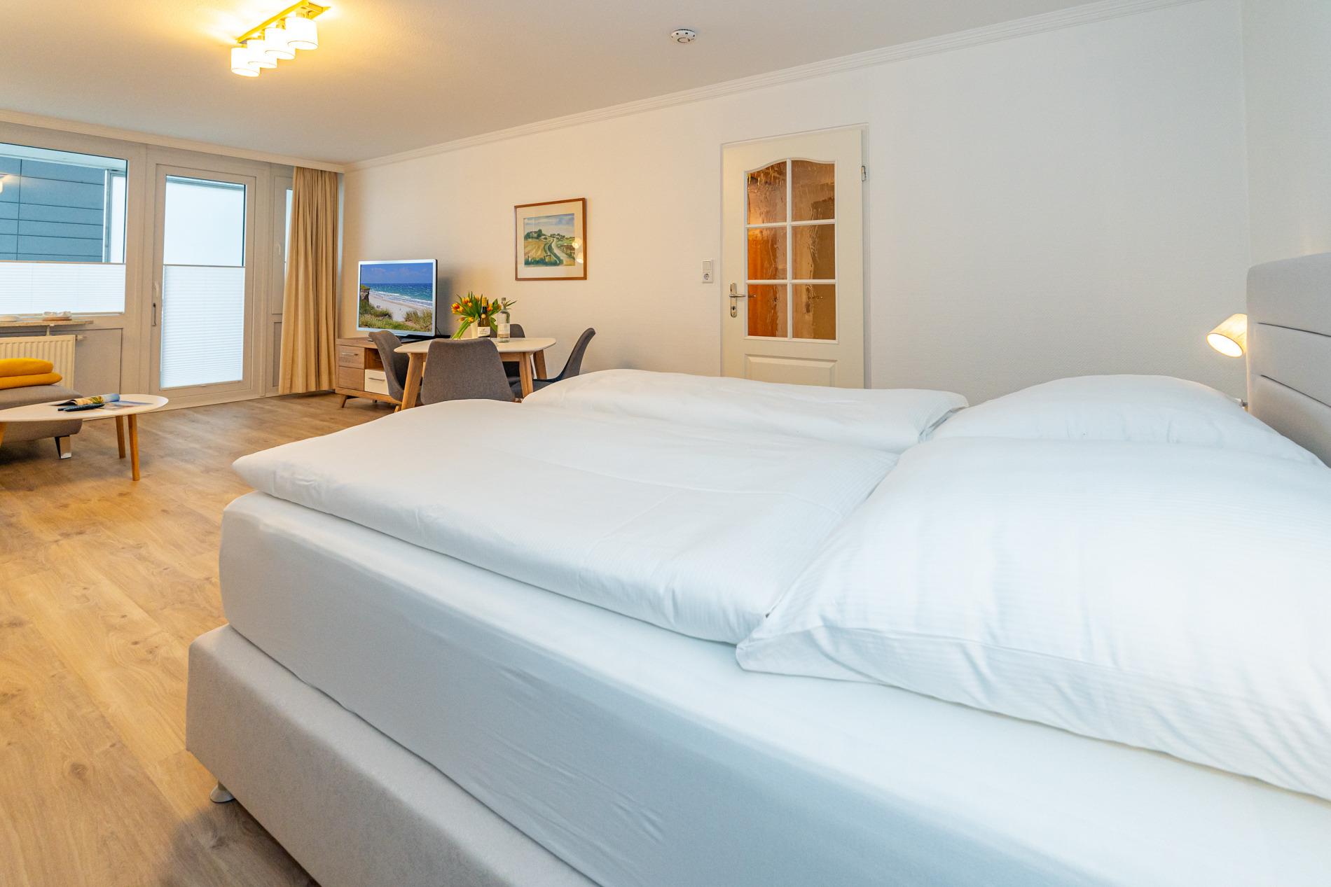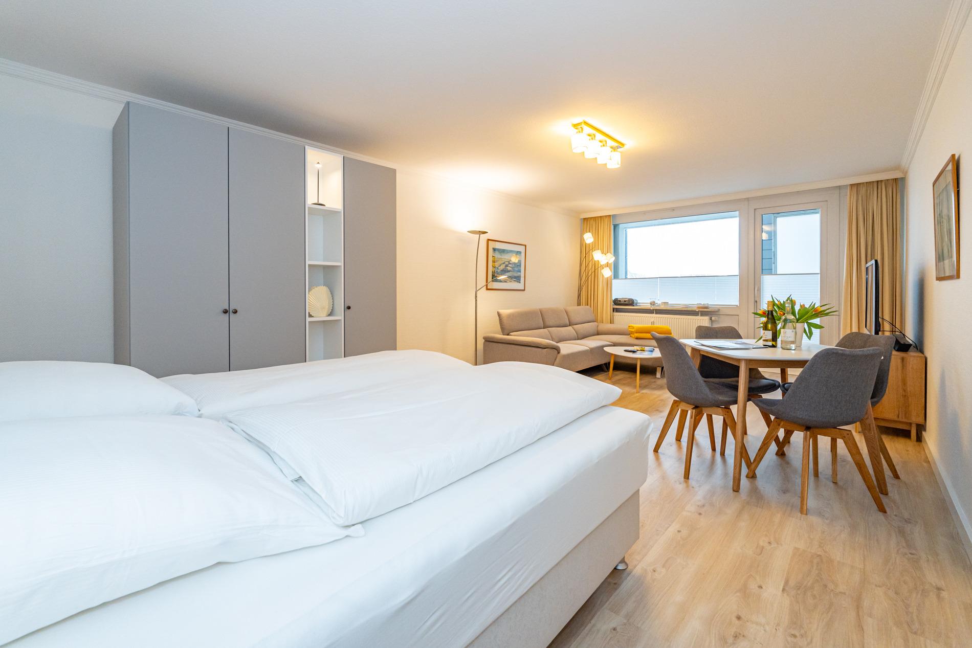 Das gut geschnittene Zimmer besteht aus einer komfortablen Couch, einem Essplatz, einem Doppelpolsterbett (durchgängige Matratze mit Topper), Kabel-Flachbild-TV.