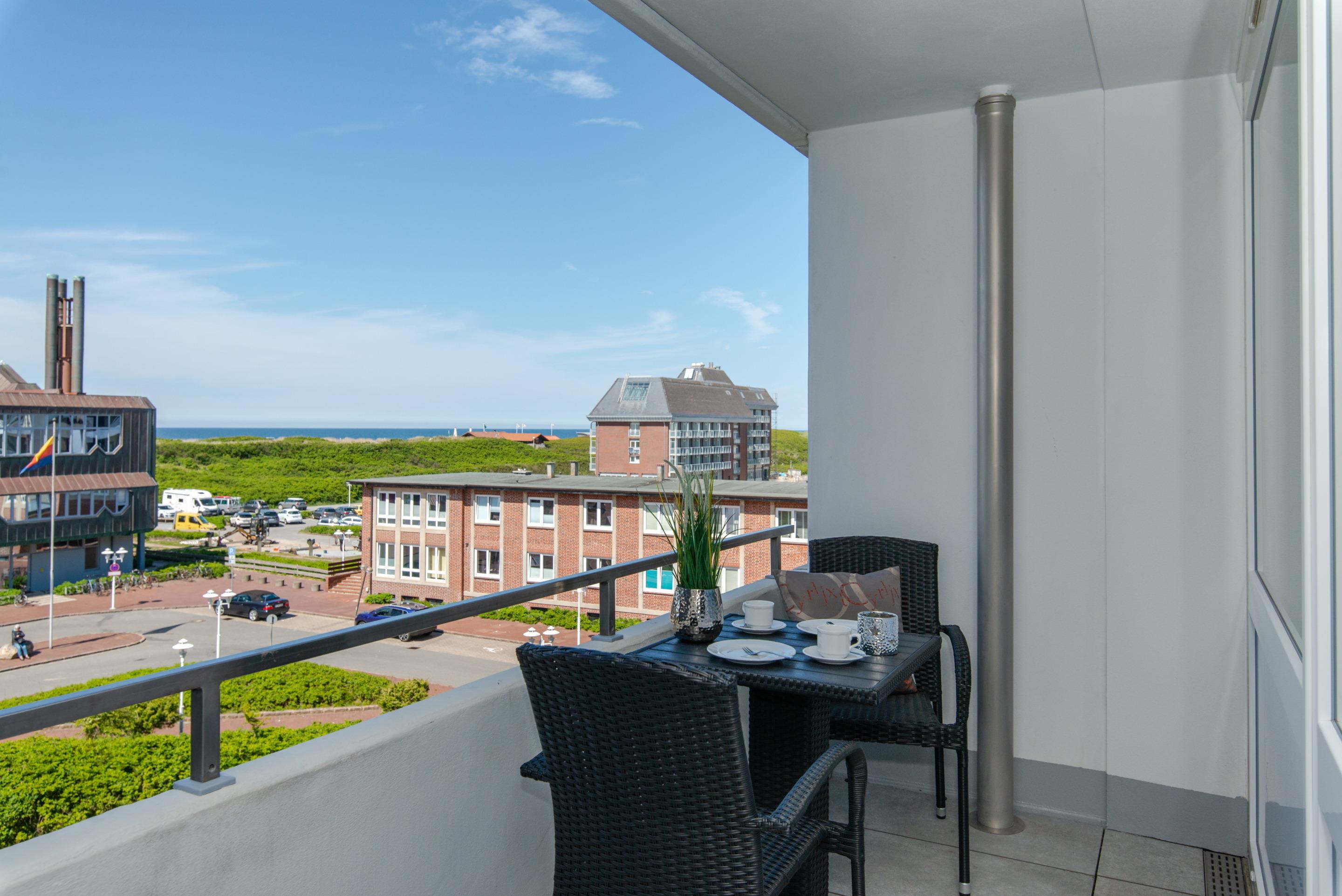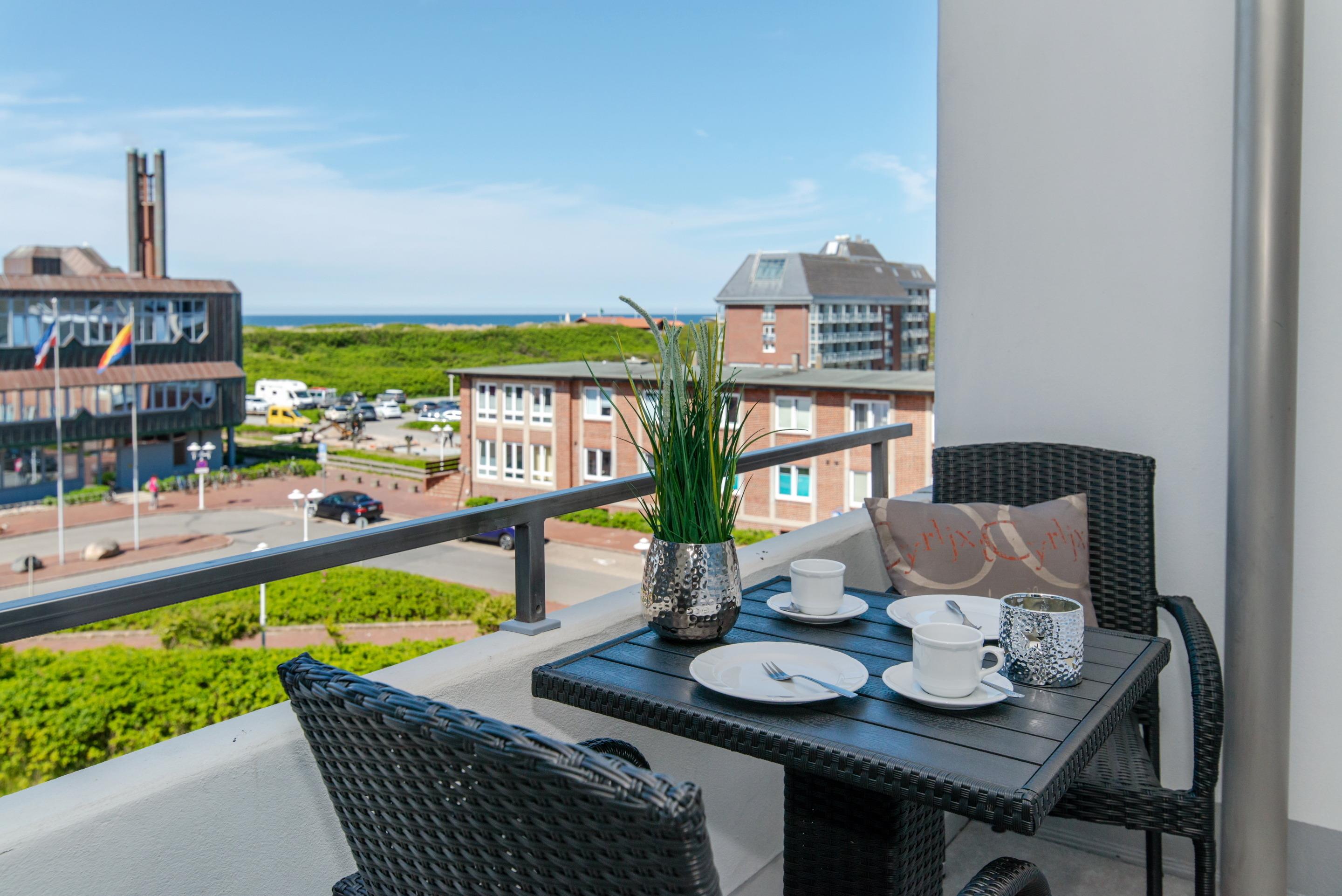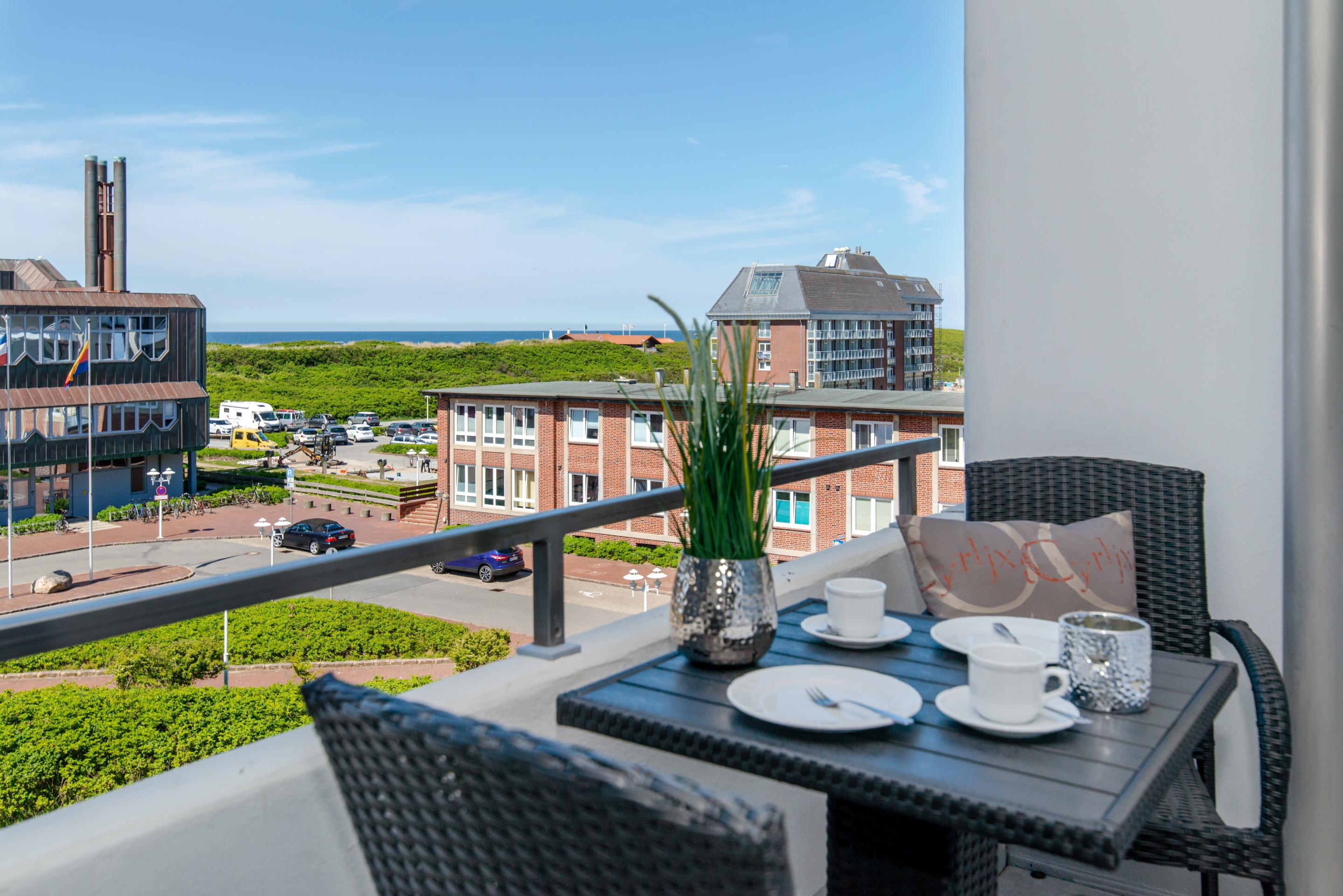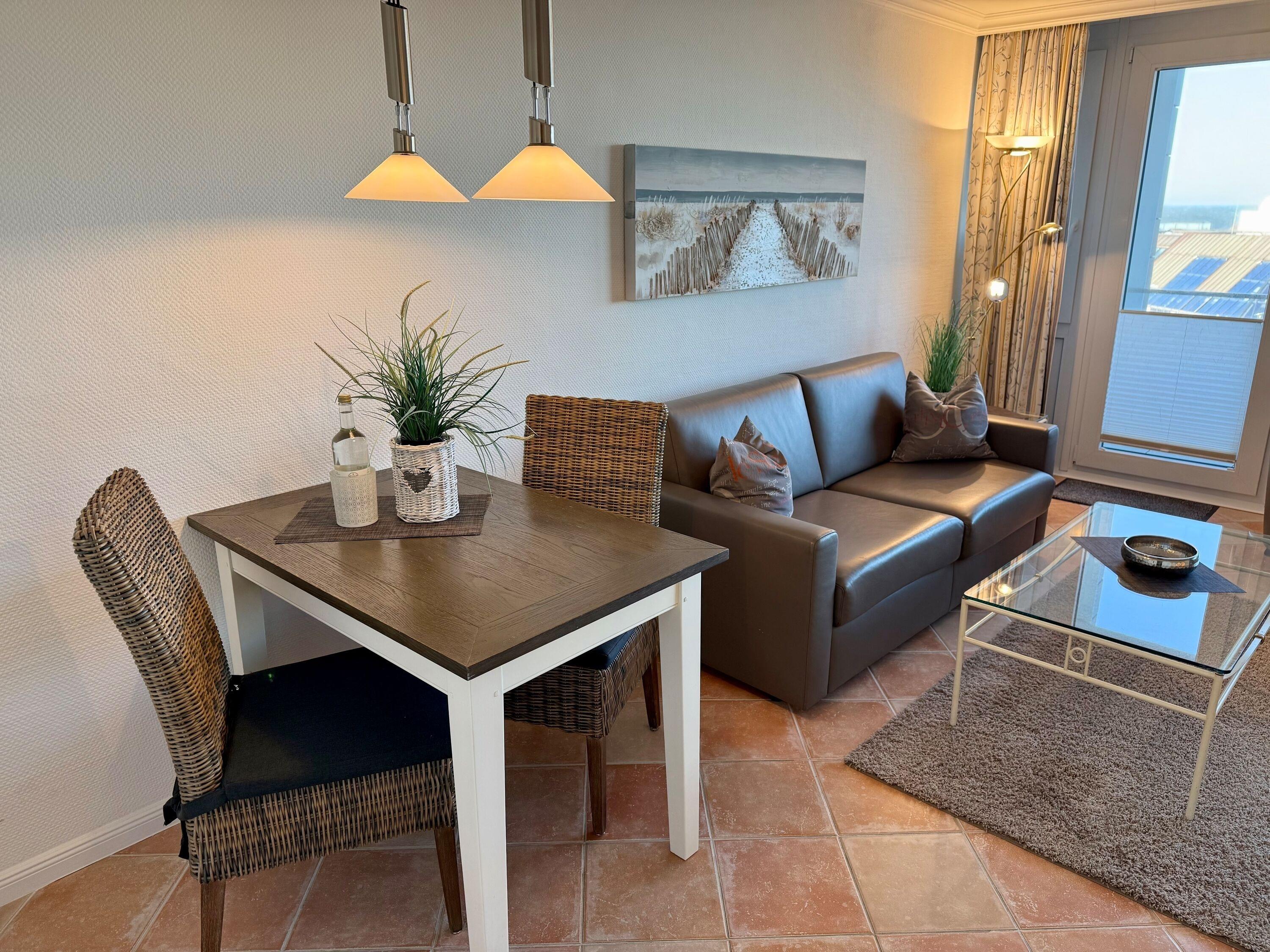 Geschmackvoll eingerichtete, komplett geflieste 1-Zimmer-Nichtraucher-Ferienwohnung (ca. 40 qm) in der 3. Etage mit Meerblick und Westloggia (Nachmittagssonne, mit Balkonmöbeln und Auflagen) für max. 2 Personen.
