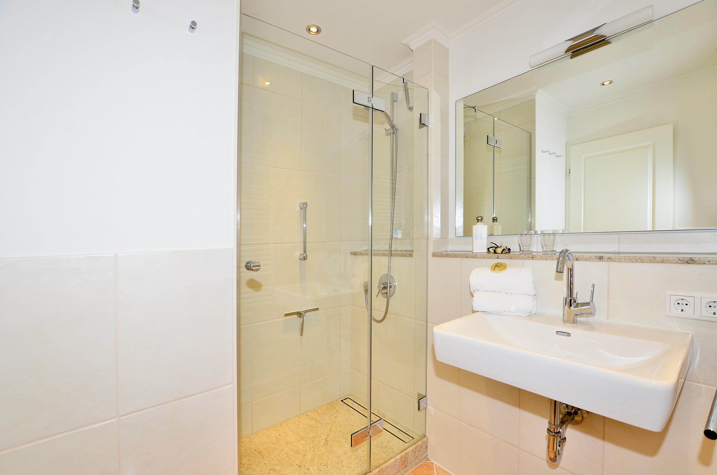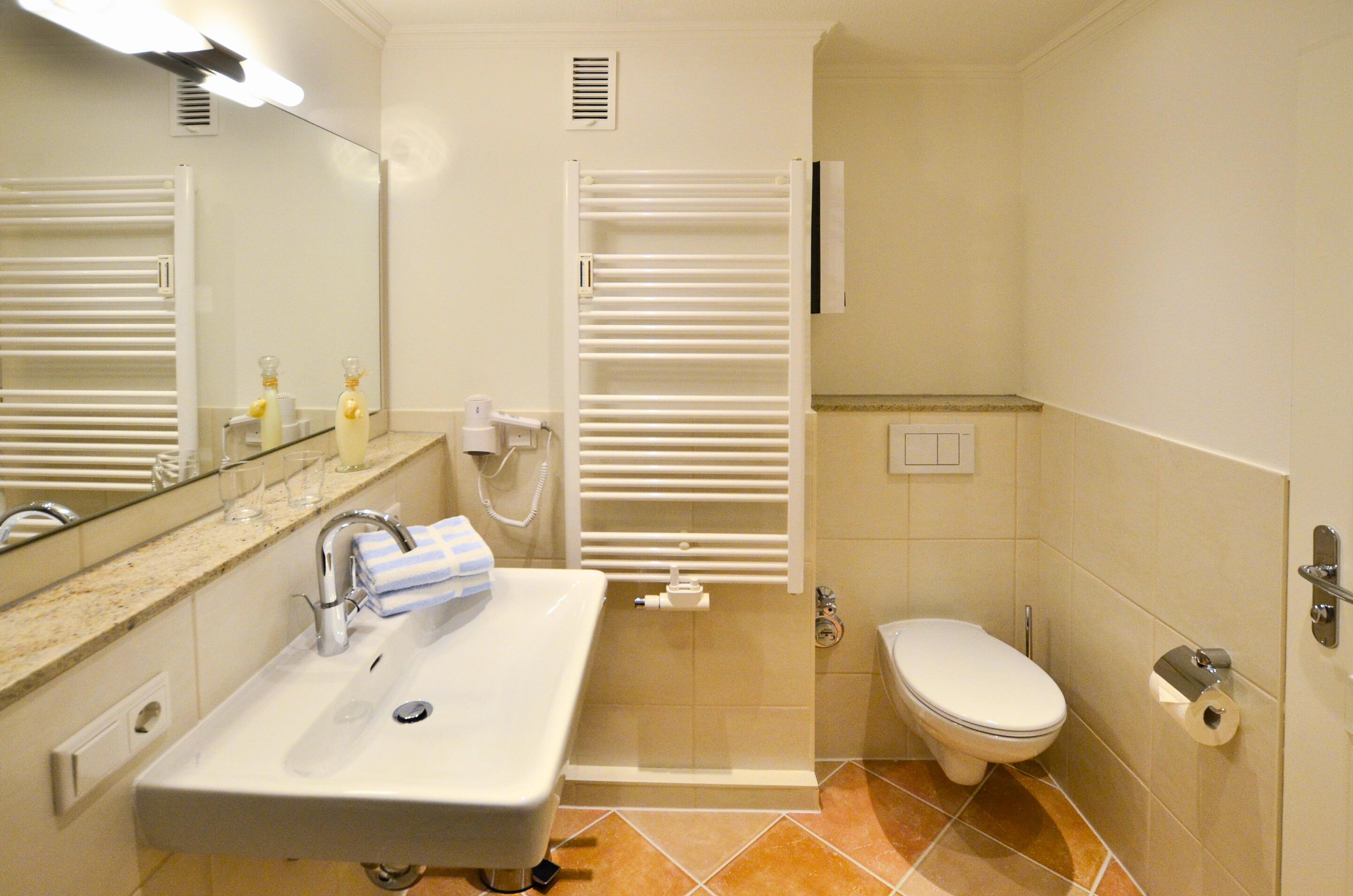 Das helle, neue Duschbad/WC hat einen Waschtisch, einen Handtuchtrockner und einen festinstallierten Fön.