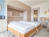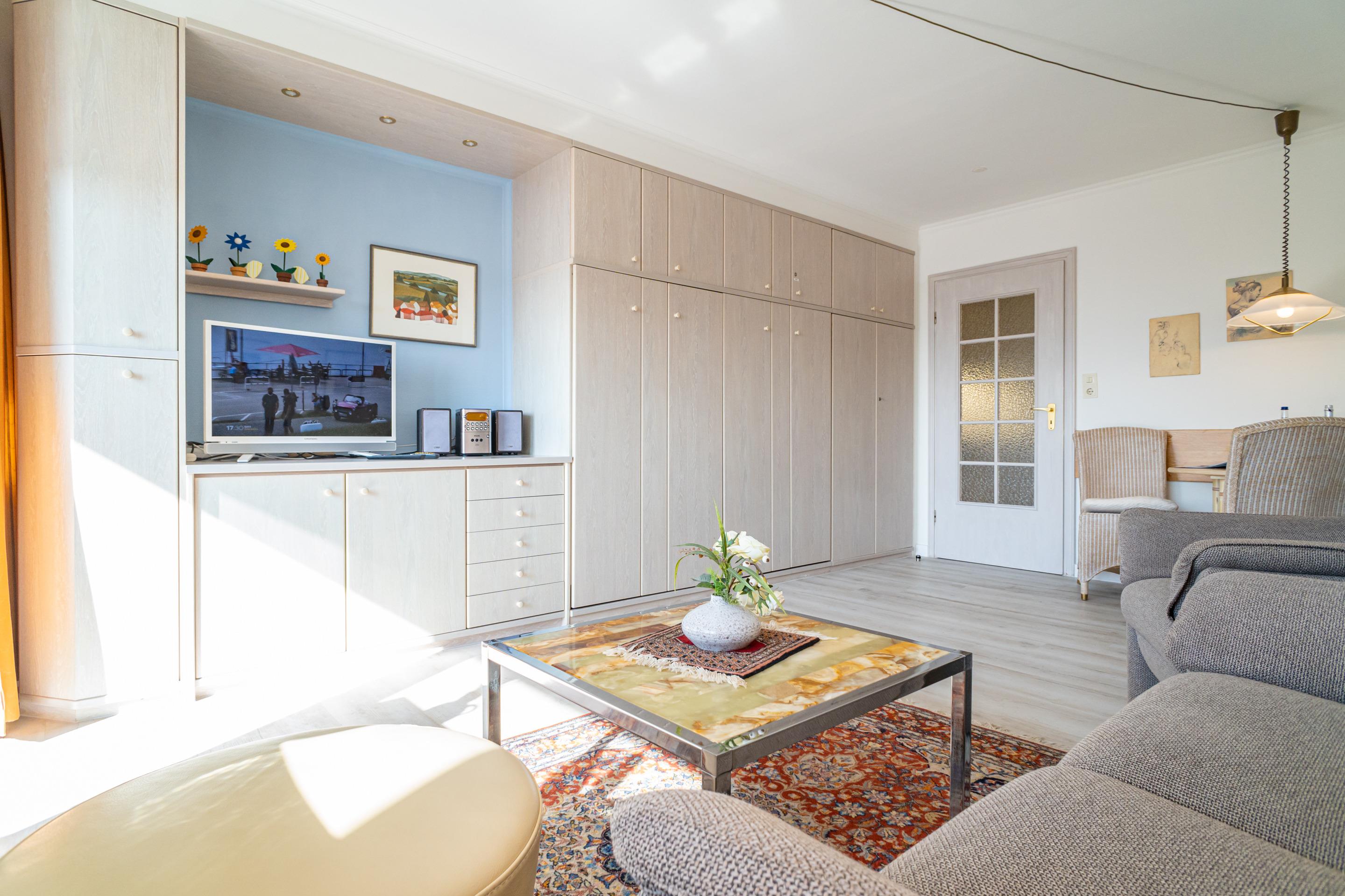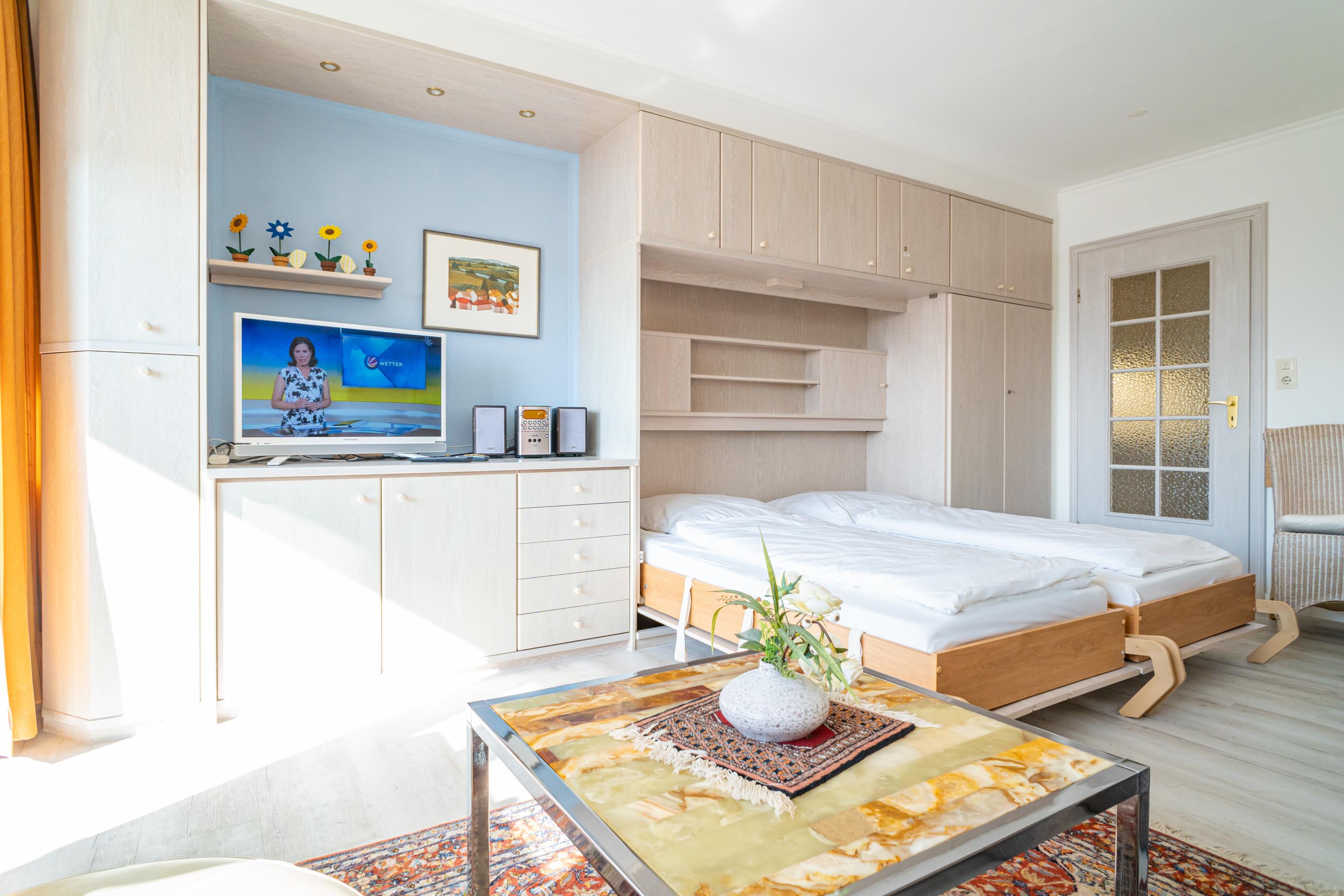Der Wohn-/Schlafraum besteht aus einer Sitzgarnitur (2-Sitzer-Couch und ein Sessel), einem Essplatz, Doppelschrankbetten (einzeln ausklappbar), einem großen Kabel-Flachbild-TV, Radio/CD-Player.