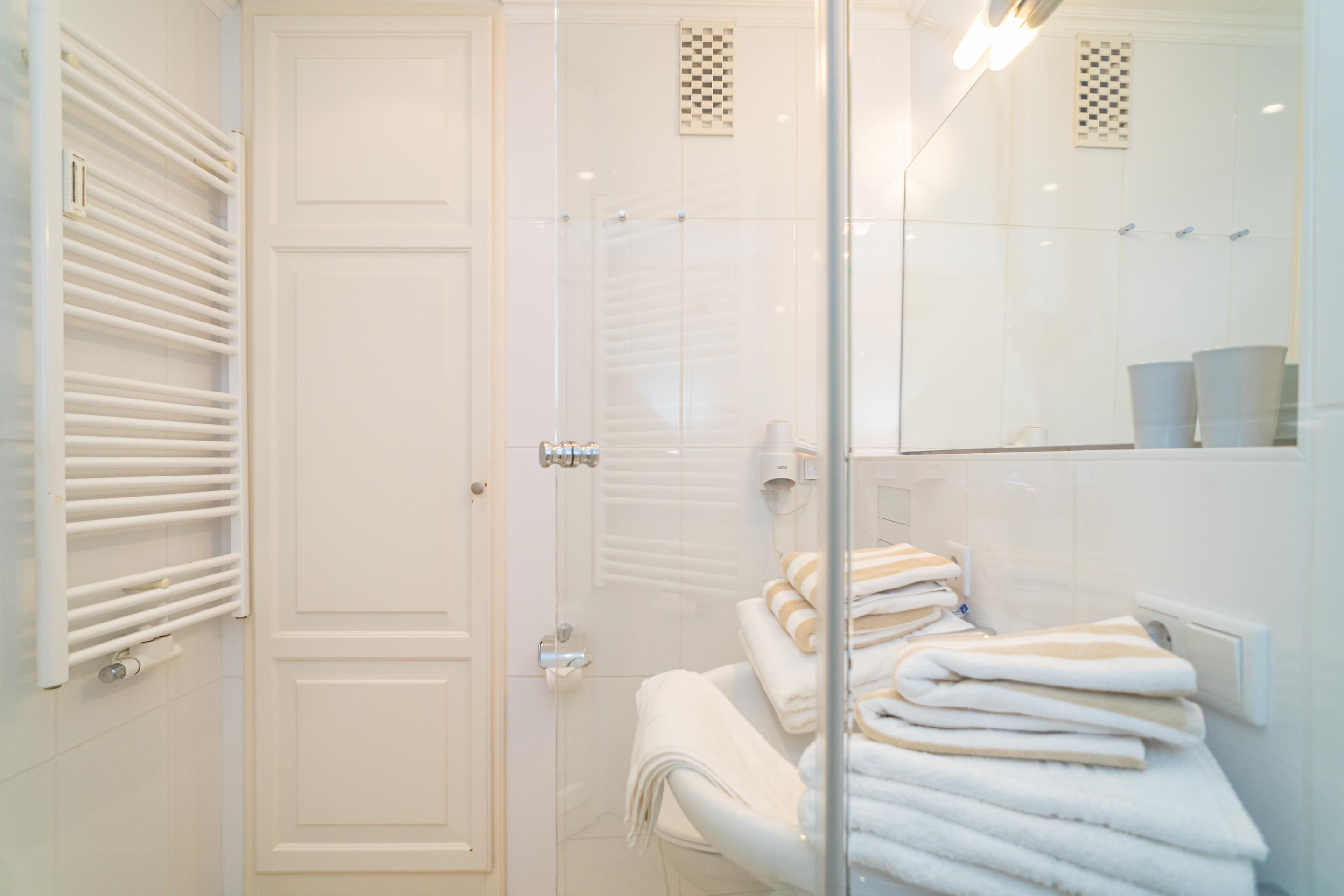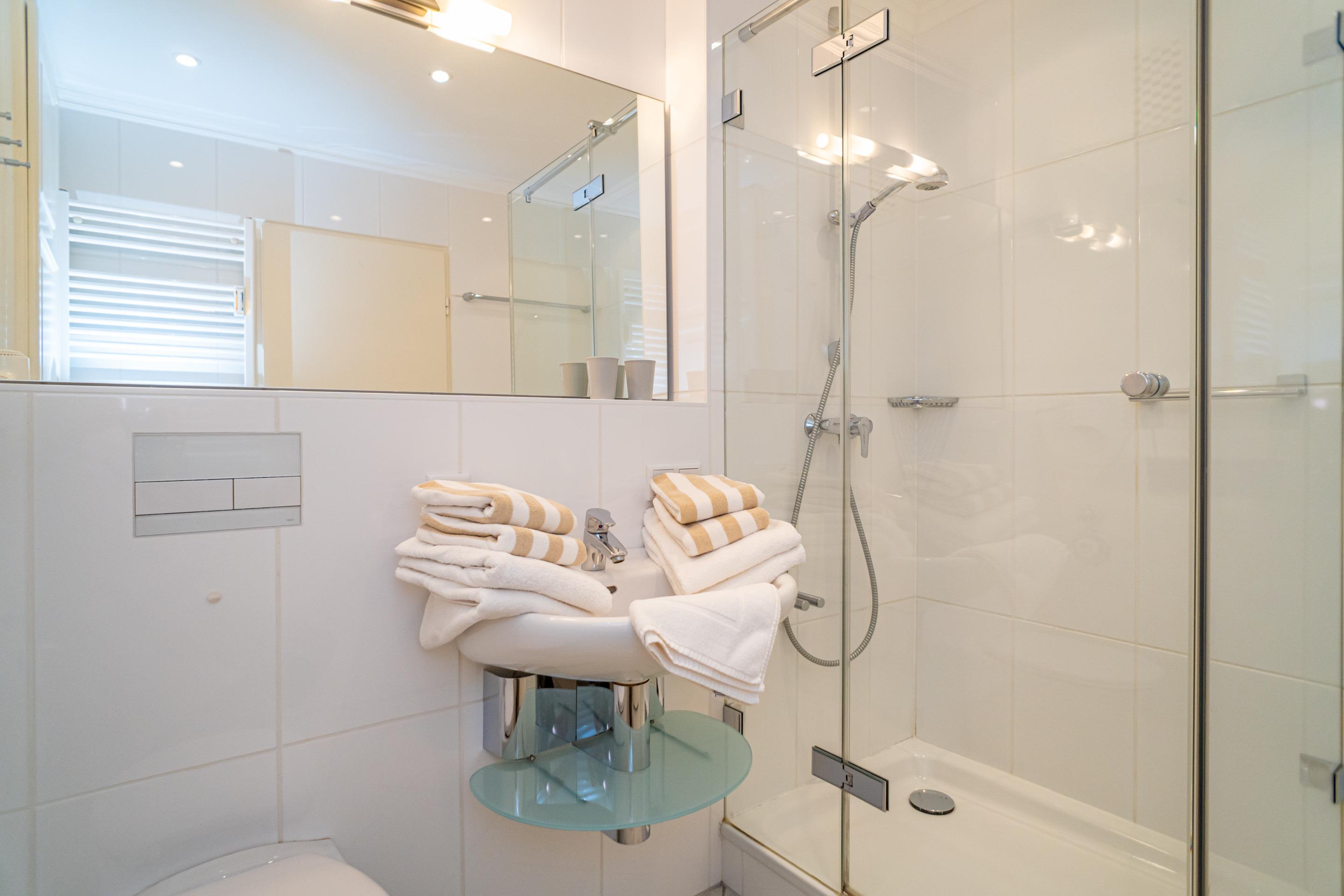 Das helle, neue Bad hat eine Dusche, ein WC, ein Waschtisch und einen Festinstallierten Fön.