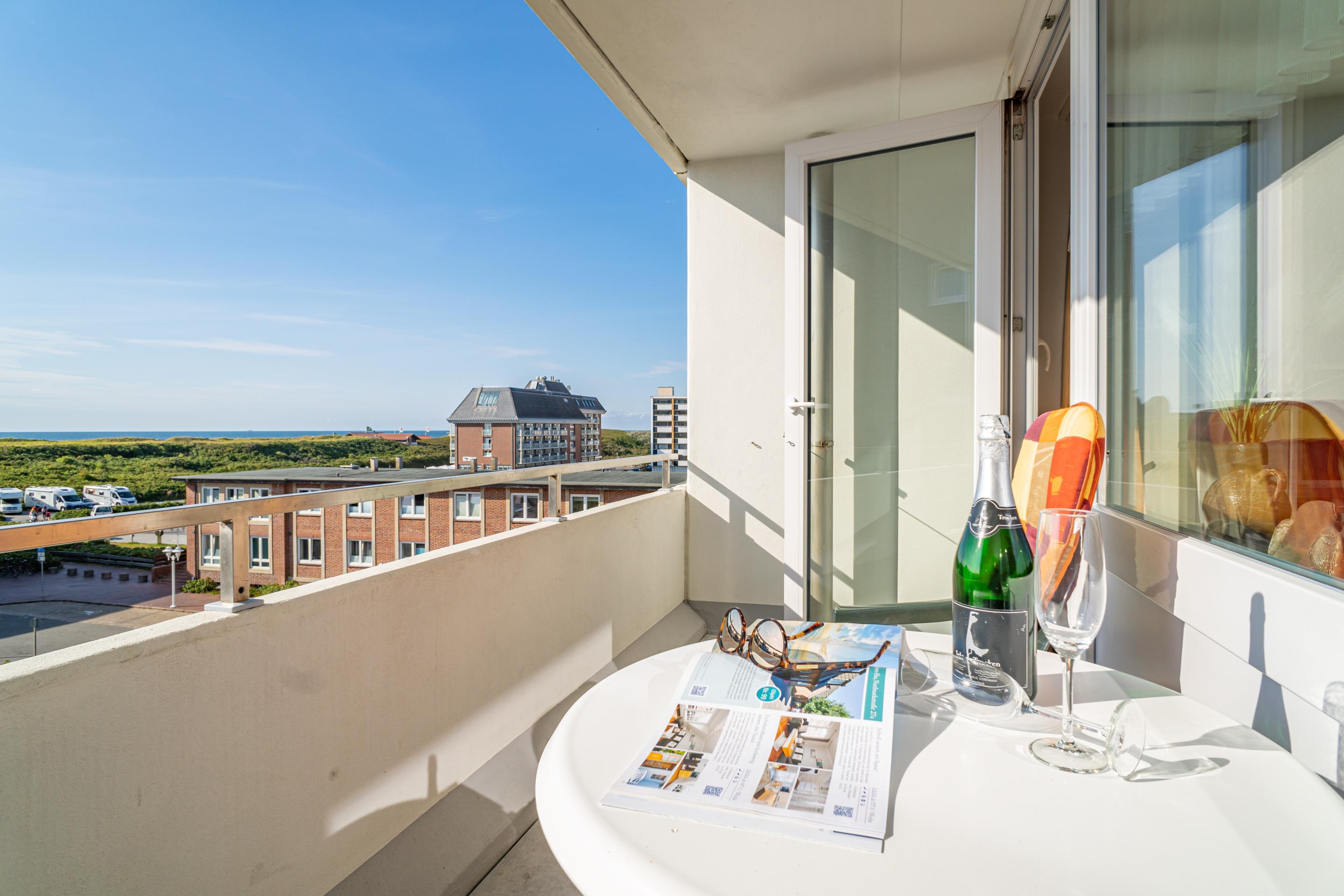 Gemütliche 1-Zimmer-Nichtraucher-Ferienwohnung (ca. 32 qm) in der 3. Etage mit Westloggia und Meerblick (Nachmittagssonne, mit Balkonmöbeln und Auflagen) für max. 2 Personen.