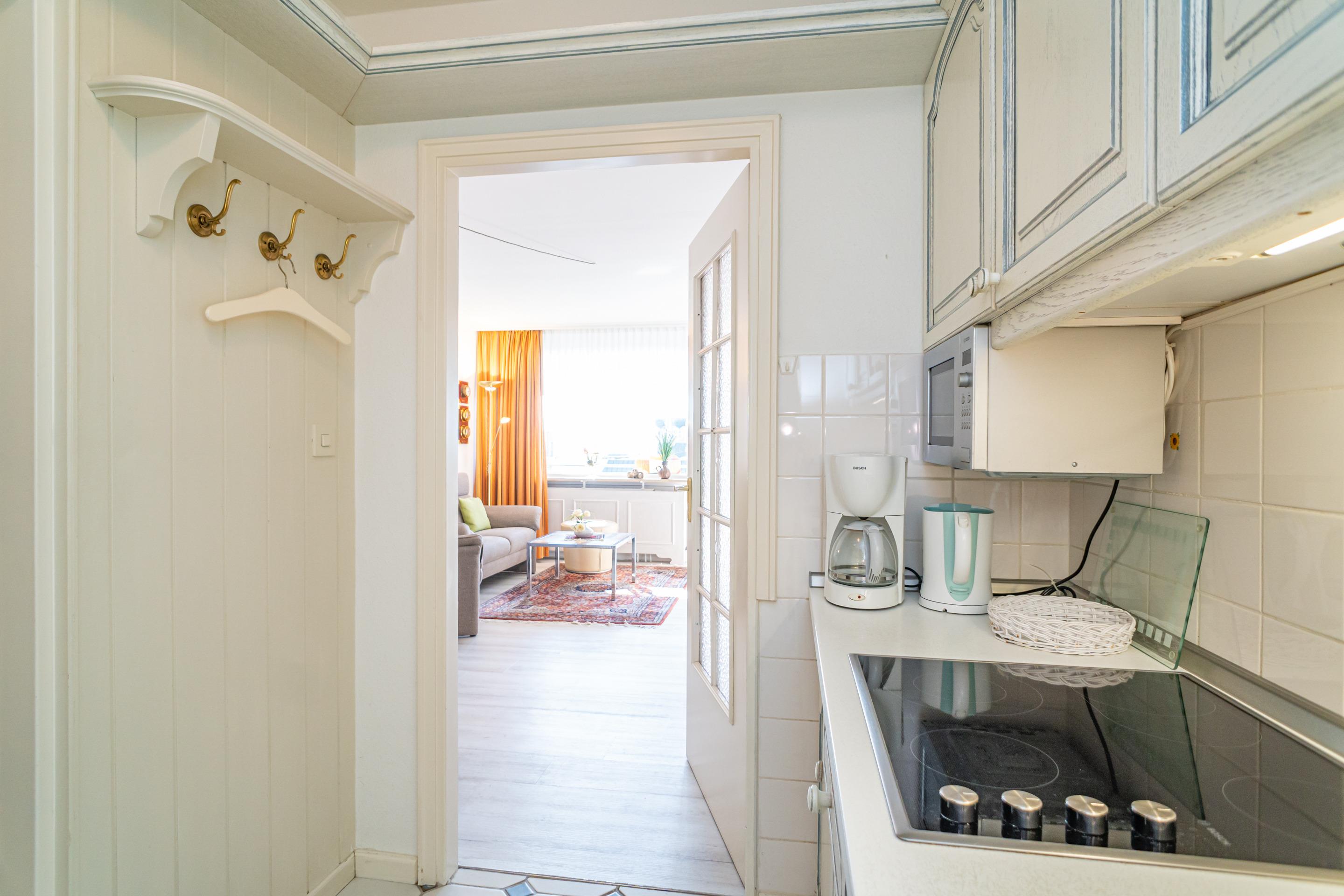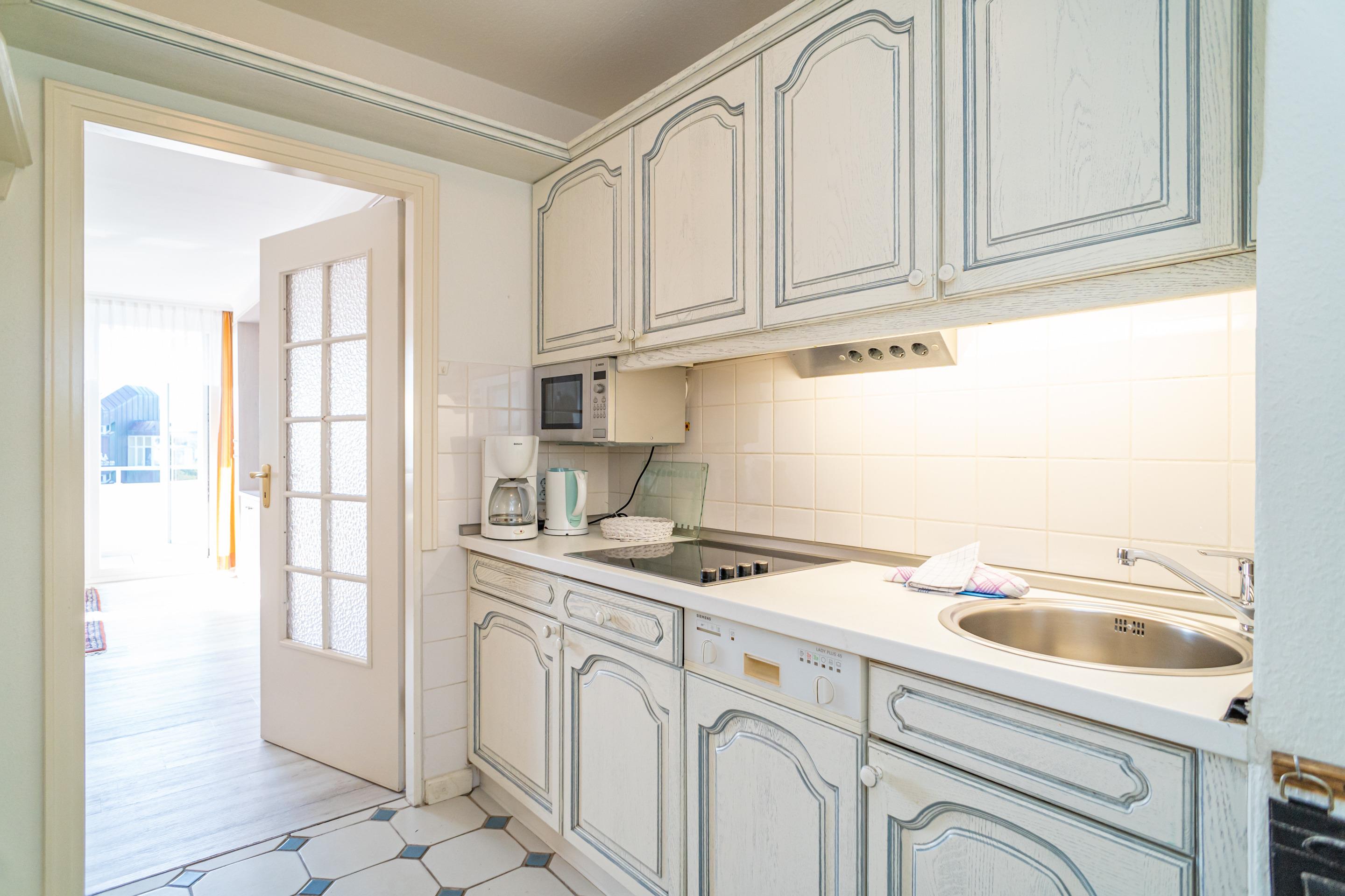 Die Küchenzeile hat einen Geschirrspüler, eine Mikrowelle (mit Grillfunktion), ein Cerankochfeld und einen Kühlschrank mit 3*-Gefrierfach. Kaffeemaschine, Wasserkocher und Toaster gehören zur Grundausstattung.