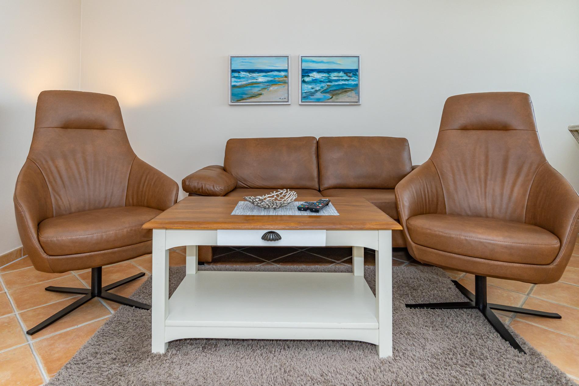 Der Wohnraum besteht aus einer gemütlichen Sitzgarnitur (2-Sitzer-Ledercouch, 2 Sessel), Essplatz, großer Kabel-Flachbild-TV, Radio/CD-Player.