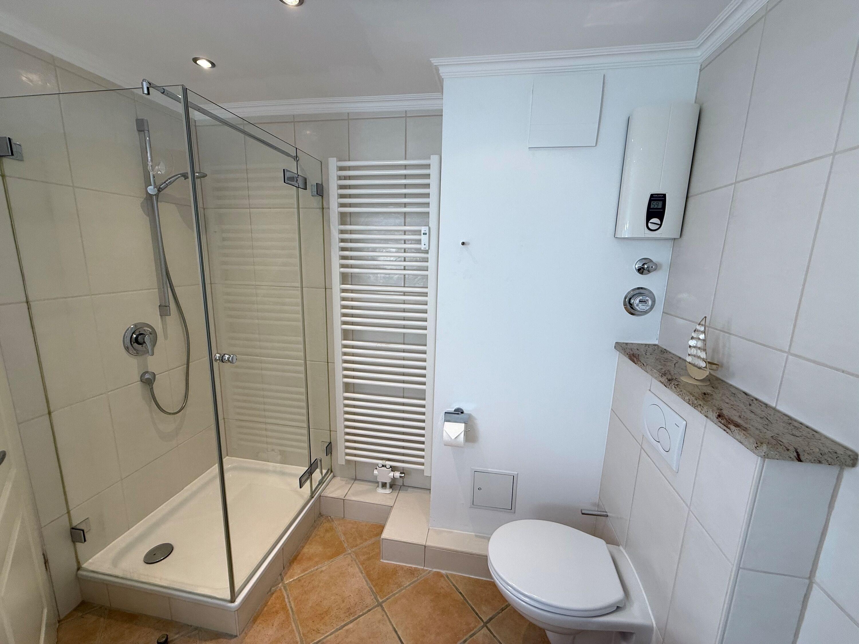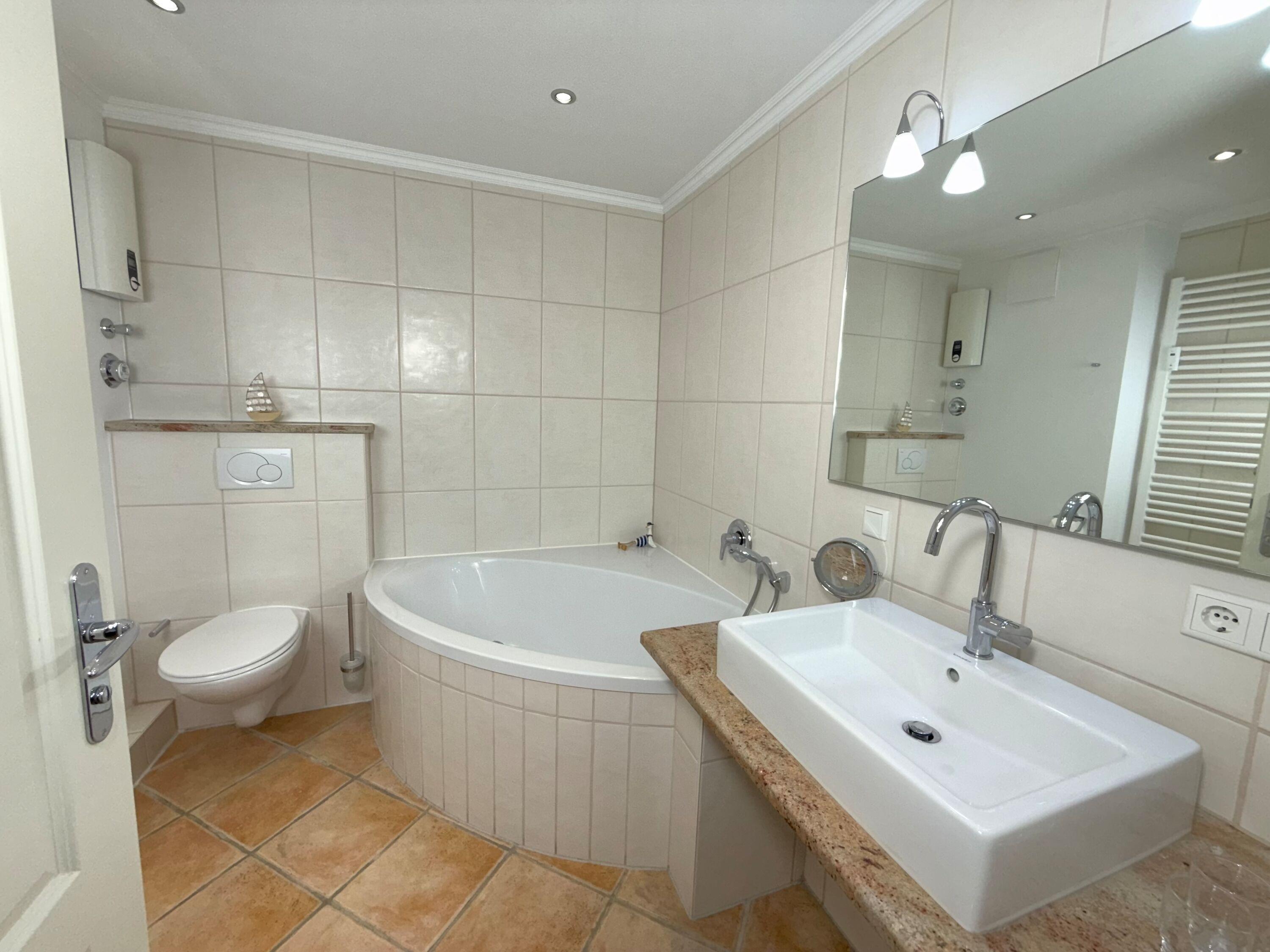 Im modernen, großzügigen Bad befinden sich eine Dusche, eine Eckbadewanne, ein WC, ein Waschtisch, ein Handtuchtrockner und Fön.