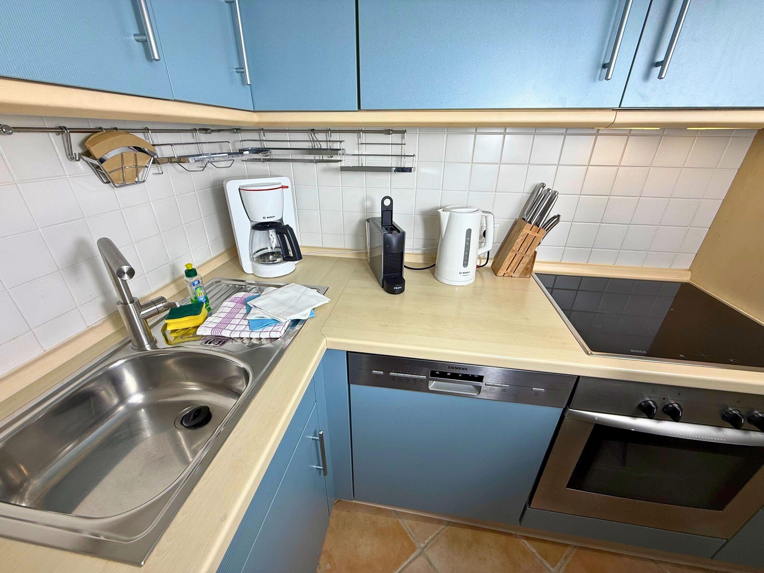 Die Küche besitzt einen Geschirrspüler, einen Herd mit Dampfabzugshaube, eine Nespresso-Maschine, ein Cerankochfeld, einen Backofen und einen Kühlschrank mit 3* Gefrierfach. Kaffeemaschine, Wasserkocher und Toaster gehören zur Grundausstattung.