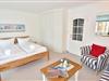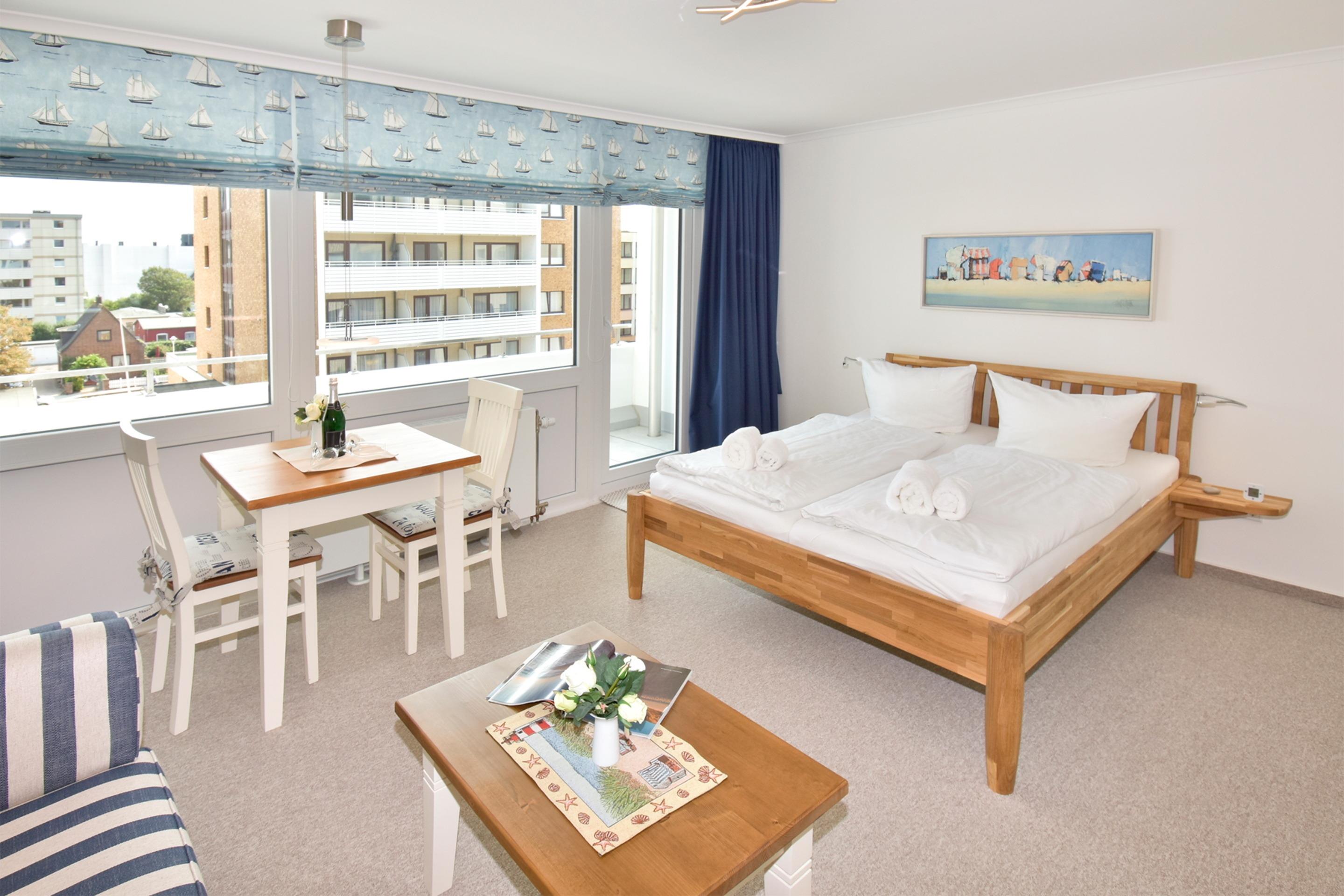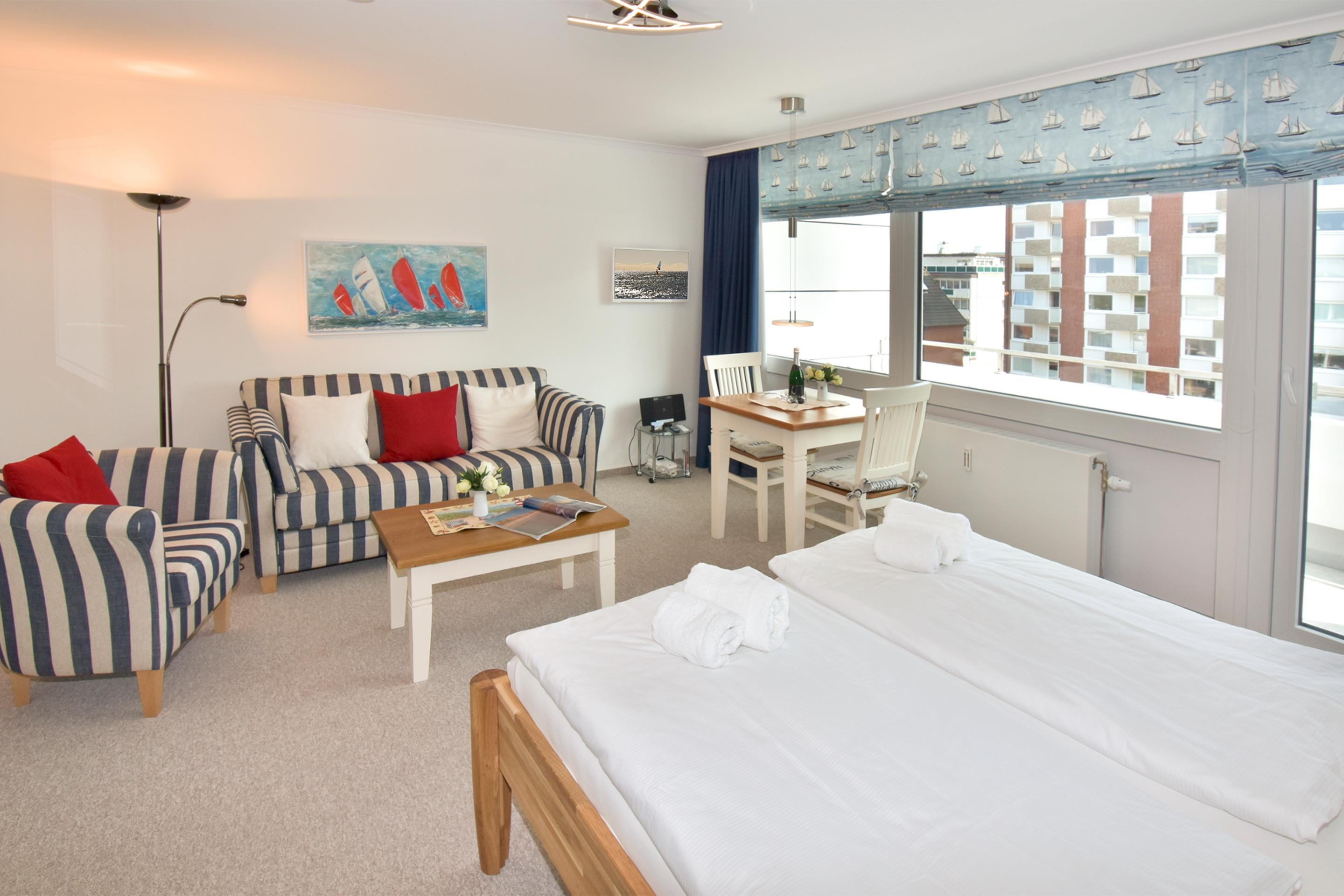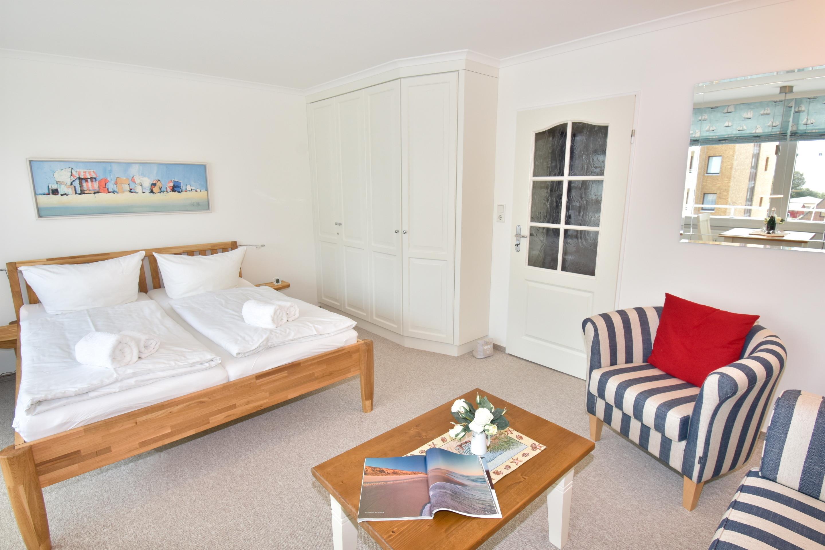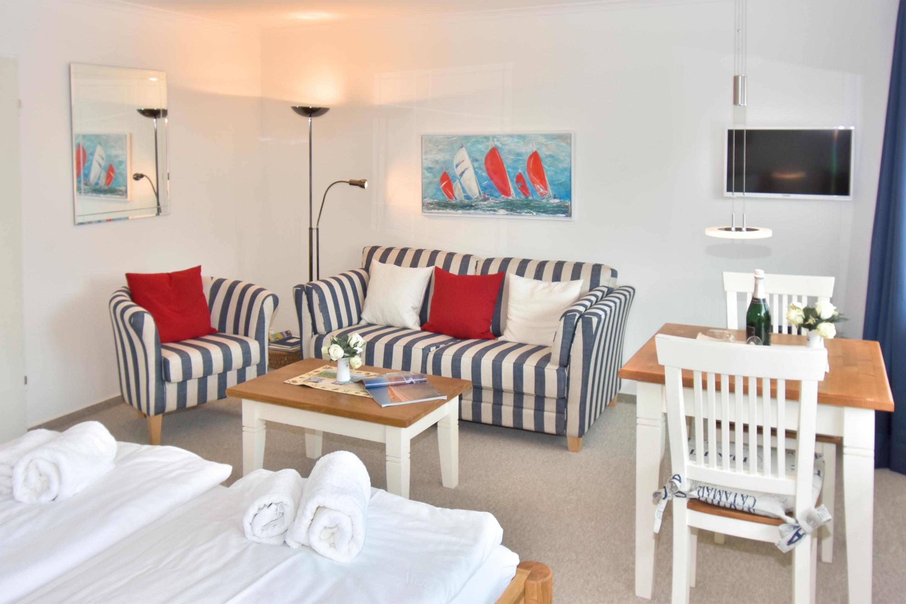 Der Wohn-/Schlafraum ist komplett neu gestaltet und besteht aus einer gemütlichen Sitzgarnitur (ein Zweisitzer und ein Stuhl), einem Essplatz, freistehenden Betten, Kabel-Flachbild-TV, Radio/CD. Die separate Küche hat einen Geschirrspüler, eine Mikrowelle, ein 2-Plattenkochfeld und Abzugshaube. Kaffeemaschine, Wasserkocher, und Toaster gehören zur Grundausstattung, sowie eine Saftpresse und ein Eierkocher. Im hellen, großzügig gestalteten Bad befinden sich eine Runddusche sowie ein beheizbarer Handtuchhalter.