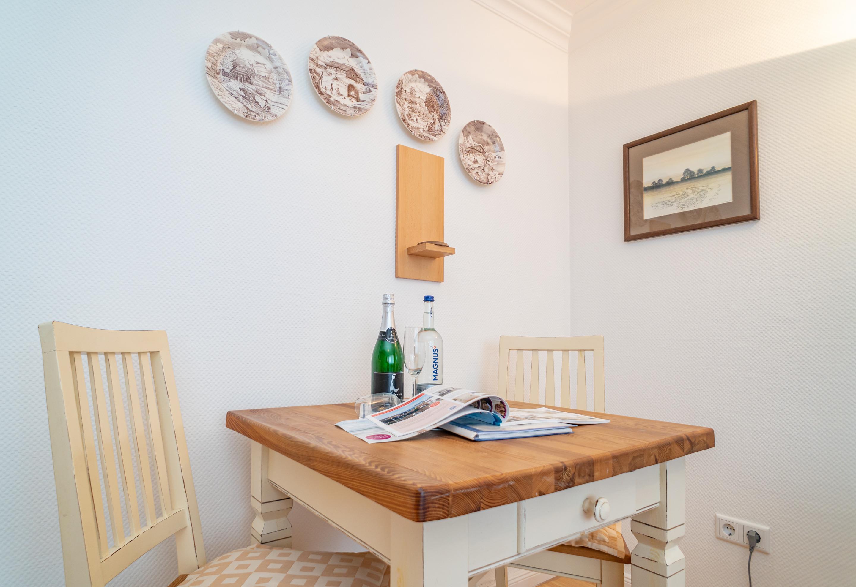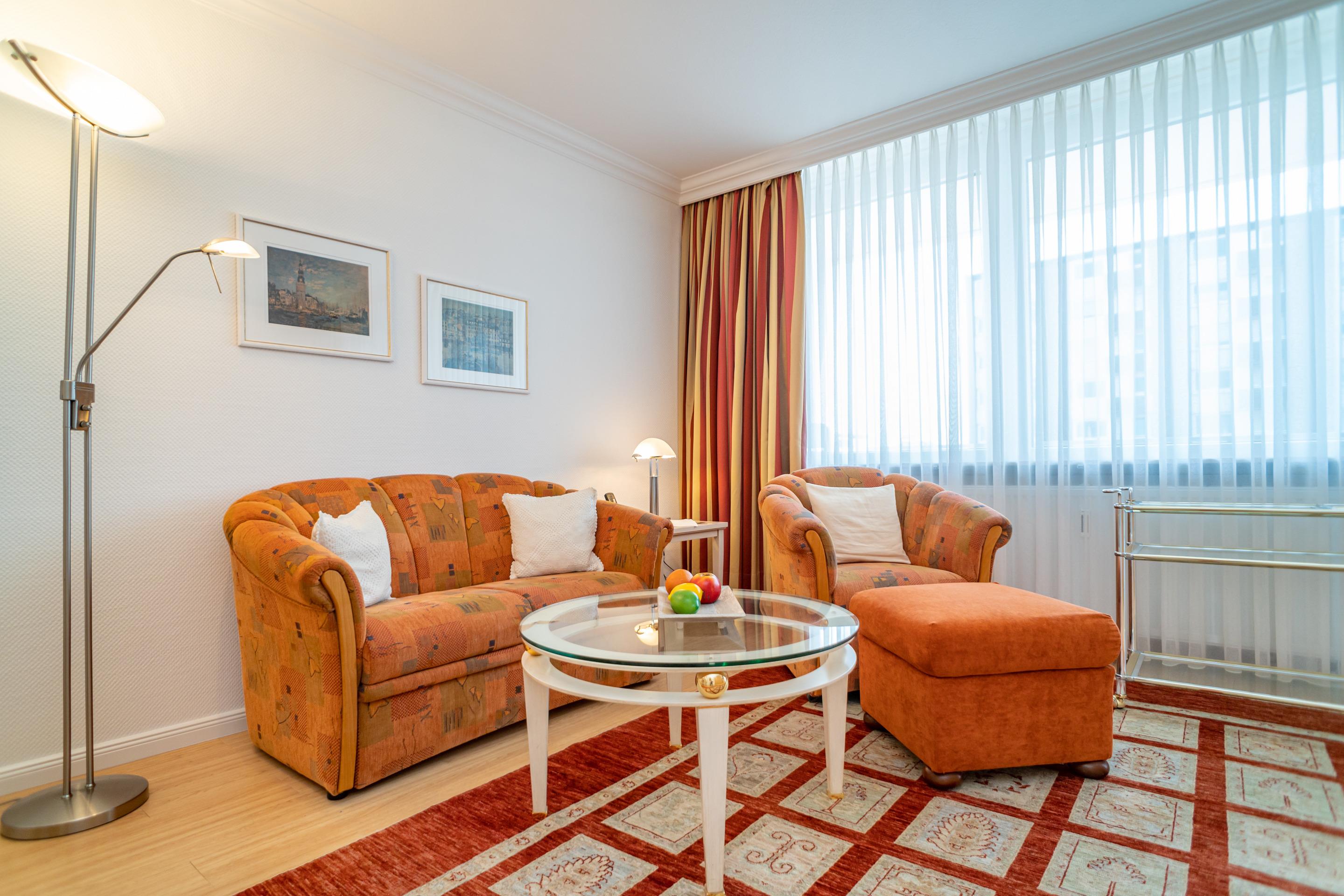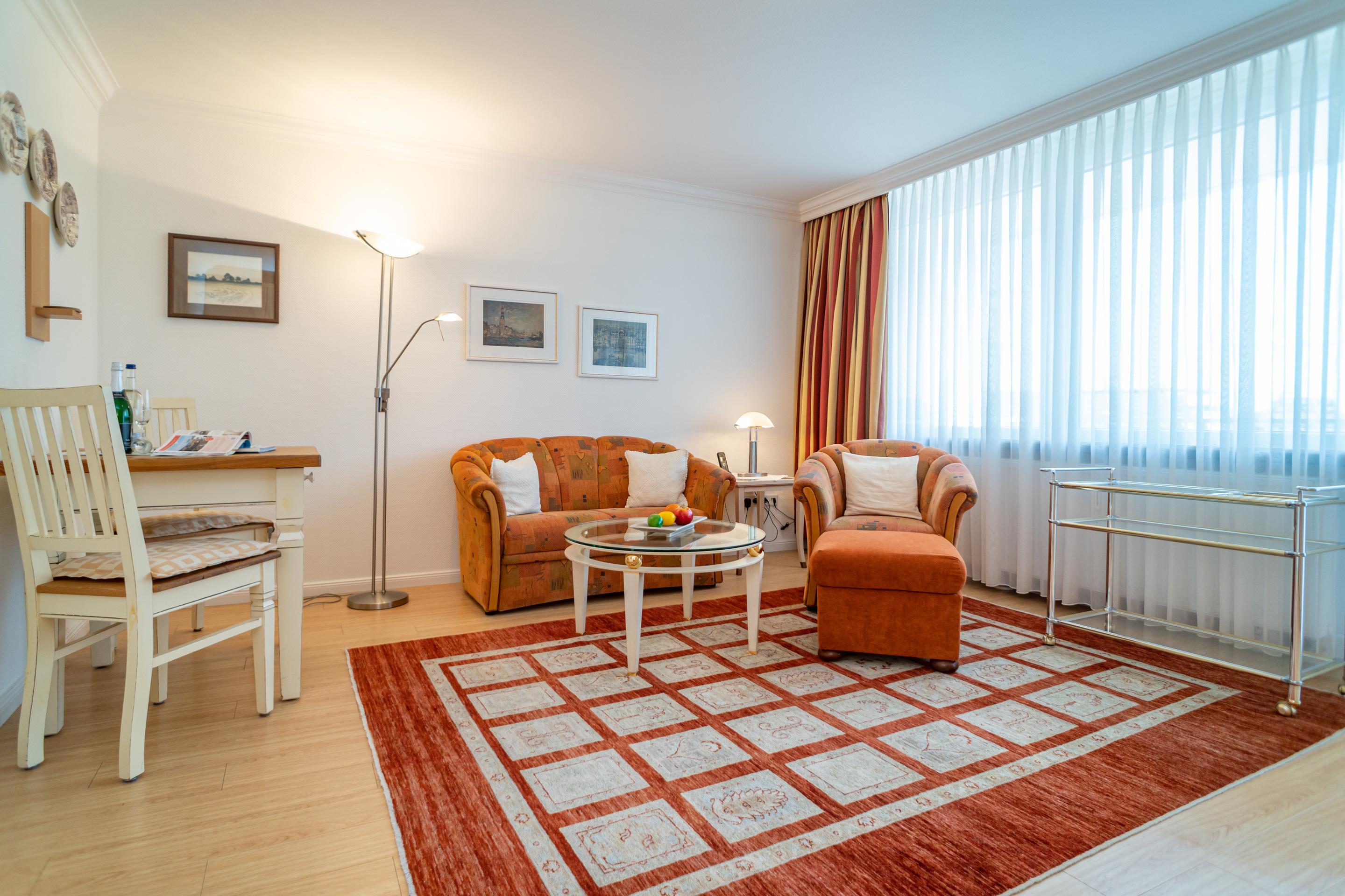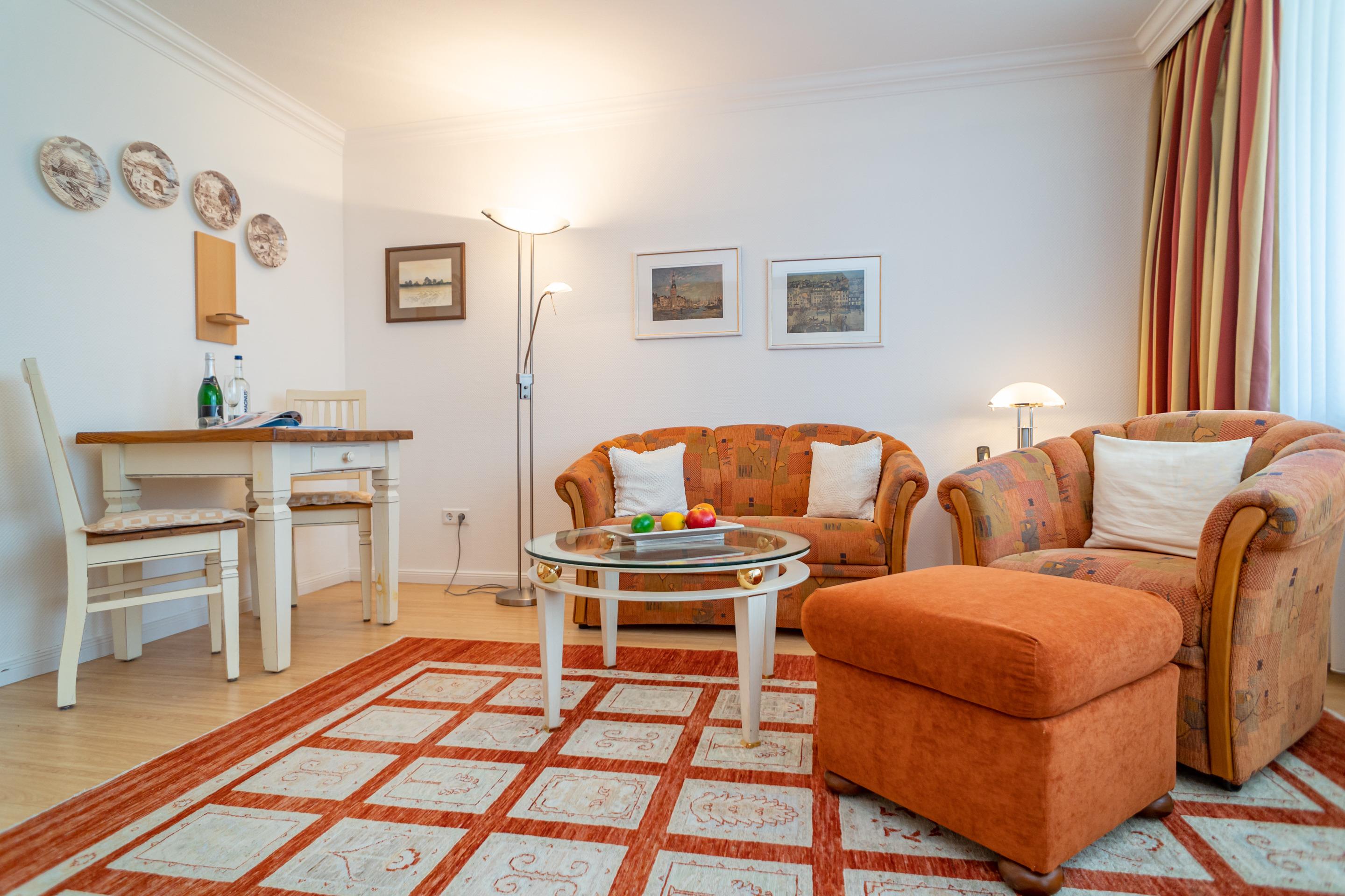 Der Wohn-/Schlafraum besteht aus einer gemütlichen Sitzgarnitur (Zweisitzer und Sessel), einem Essplatz, einem neuen Doppelschrankbetten (zusammen ausklappbar, 0,80 x 1,97 m), Kabel-Flachbild-TV mit digitalem Empfang, Radio, kostenlose Internetnutzung per W-Lan.