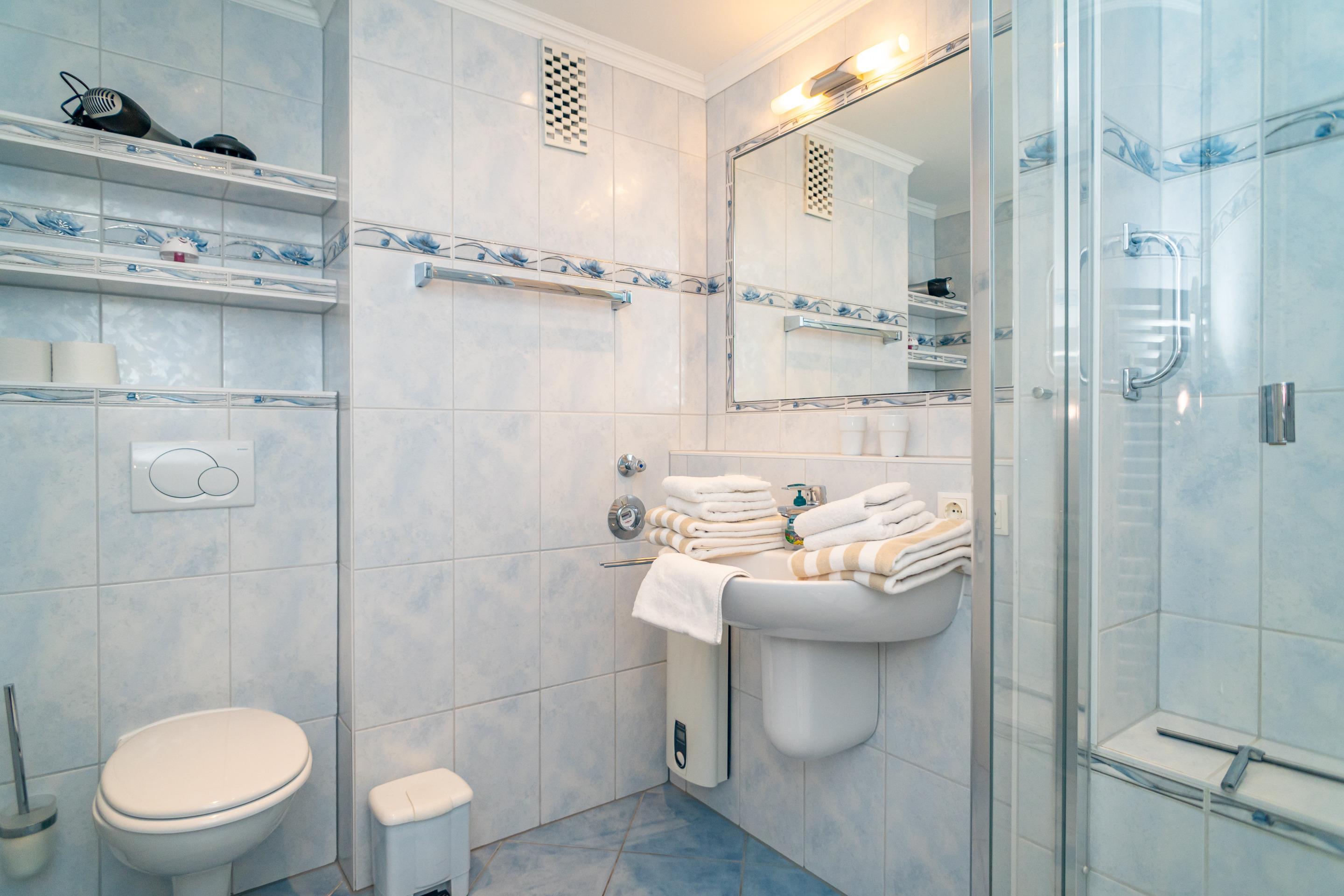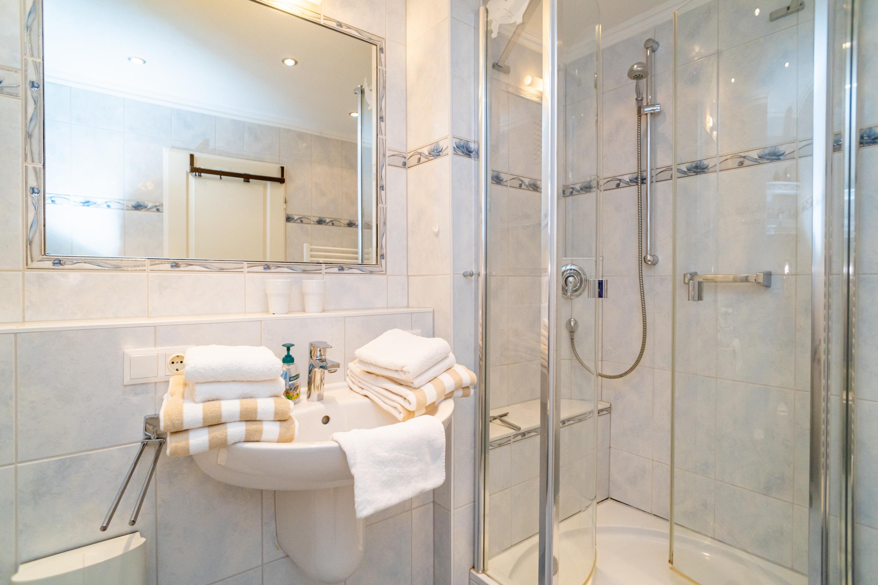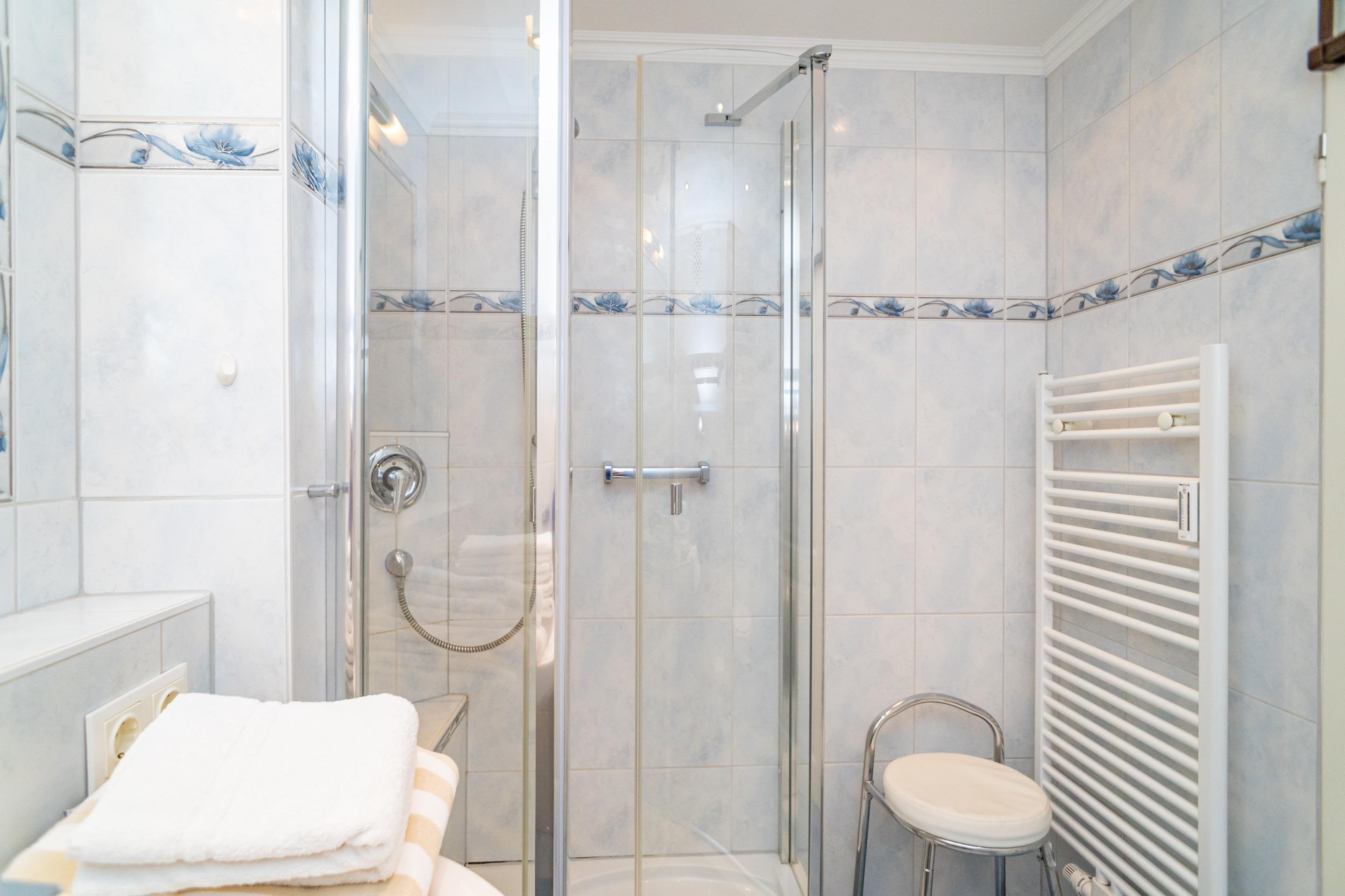 Im neuen, modernen Bad befinden sich eine Runddusche, ein WC, ein Waschtisch und ein Handtuchtrockner.