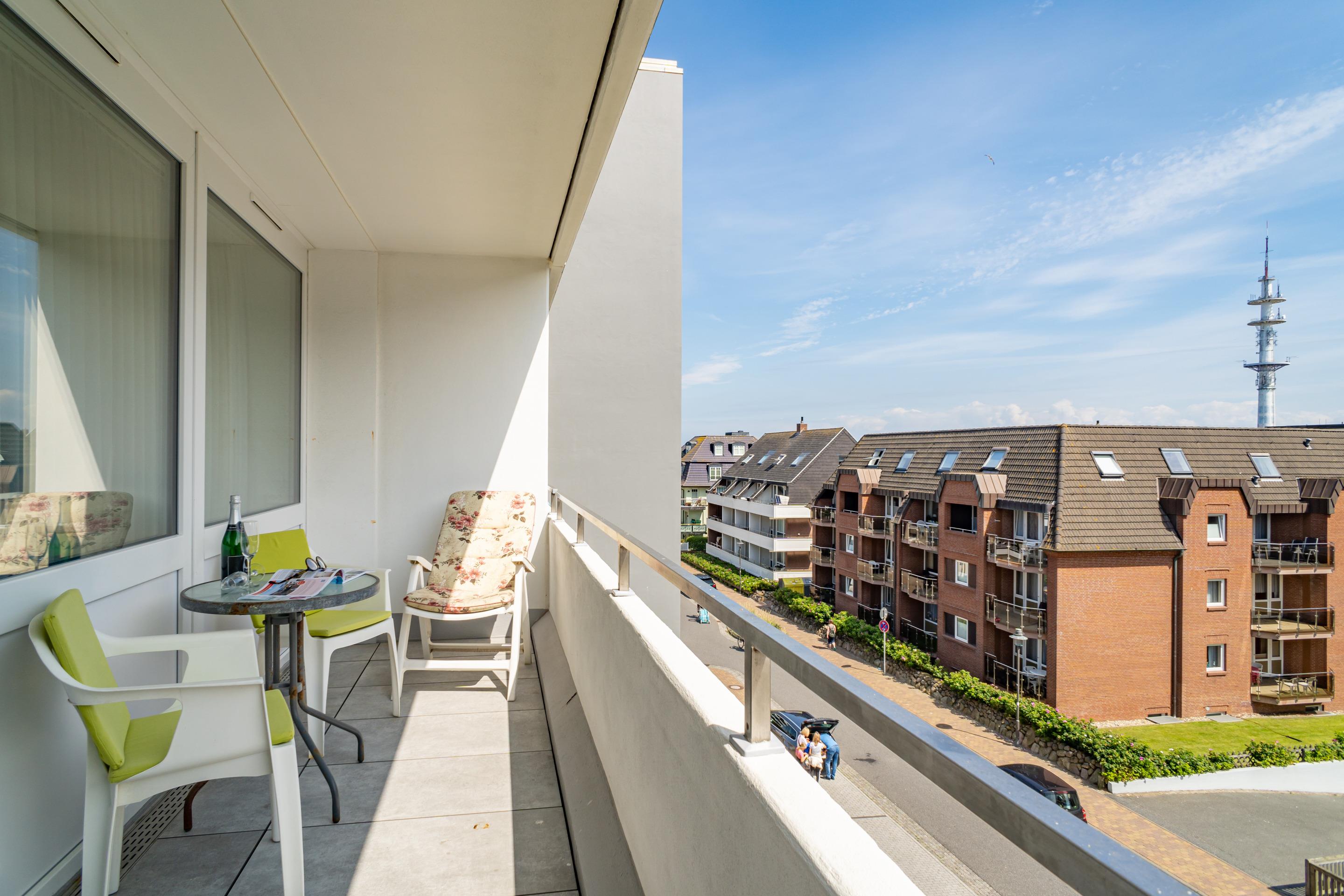 Großzügige, gut ausgestattete 1-Zimmer-Nichtraucher-Ferienwohnung (ca. 36 m²) in der 3. Etage zur Landseite mit Ostloggia (Morgensonne, mit Balkonmöbeln und Auflagen) für max. 2 Personen.
