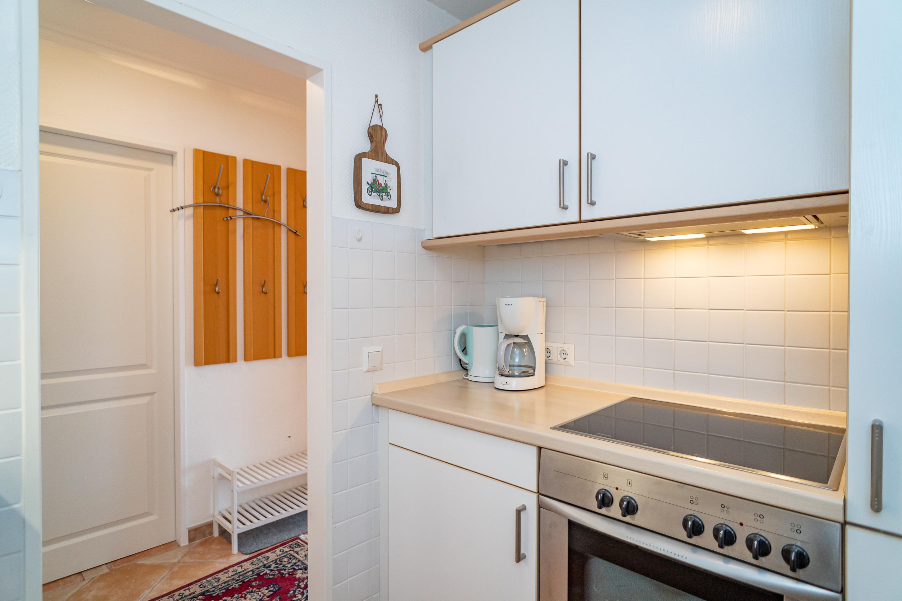 Die separate Küche hat einen Geschirrspüler, einen Herd mit Backofen und Cerankochfeld und einen Kühlschrank (3* Gefrierfach). Kaffeemaschine, Wasserkocher und Toaster gehören zur Grundausstattung.