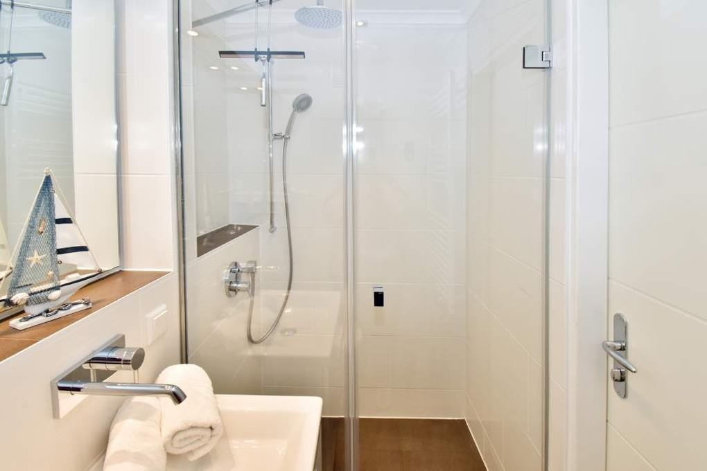 Individuell gestaltete 1-Zimmer-Nichtraucher-Ferienwohnung (ca. 25 qm) in der 4. Etage zur Seeseite mit Westloggia und herrlichem Meerblick, (Nachmittagssonne mit Balkonmöbeln und Auflagen) für max. 2 Personen. Vom Vorflur mit Garderobe und Küchenzeile gelangt man in das kombinierte Wohn-/Schlafzimmer (mit Austritt zum Balkon) und in das moderne Duschbad/WC.