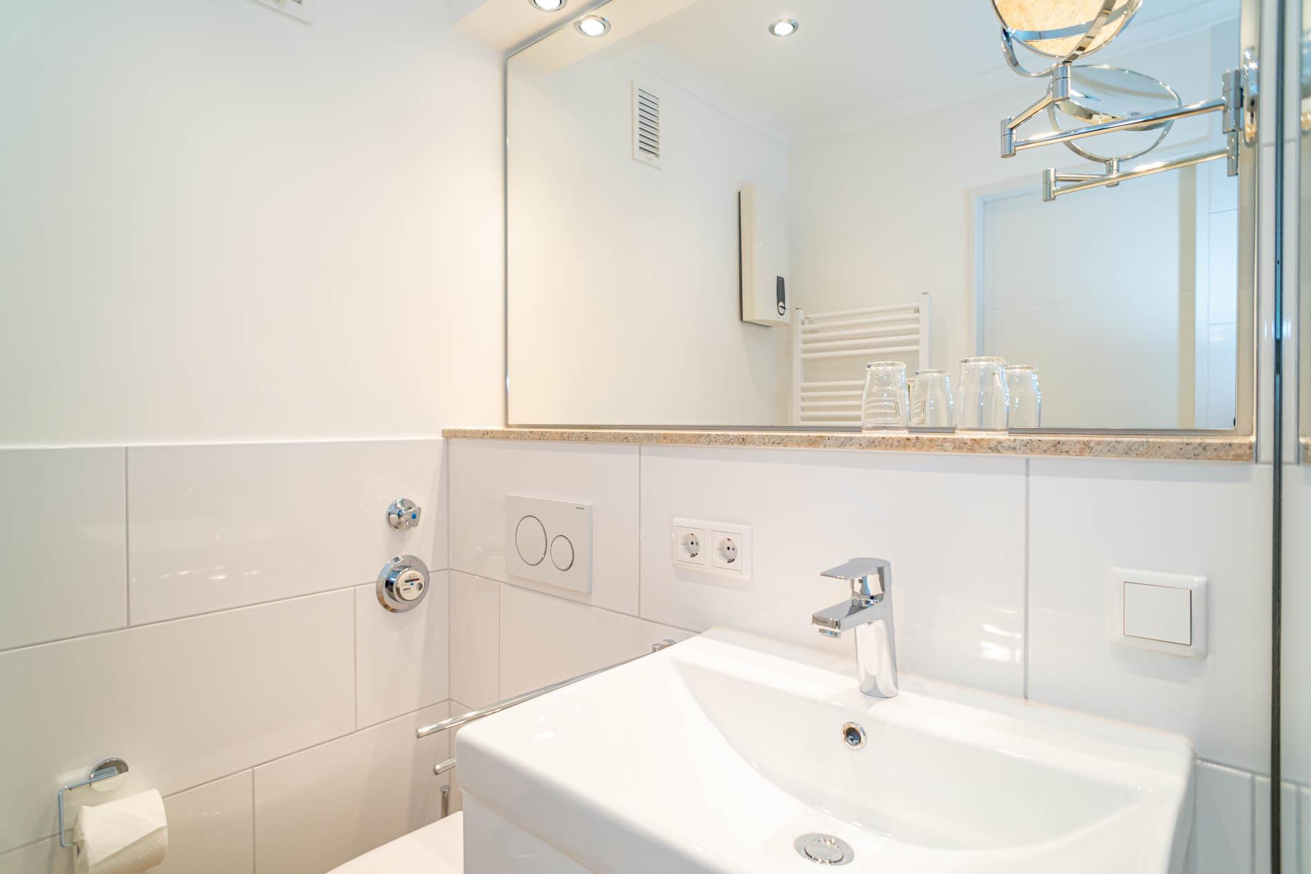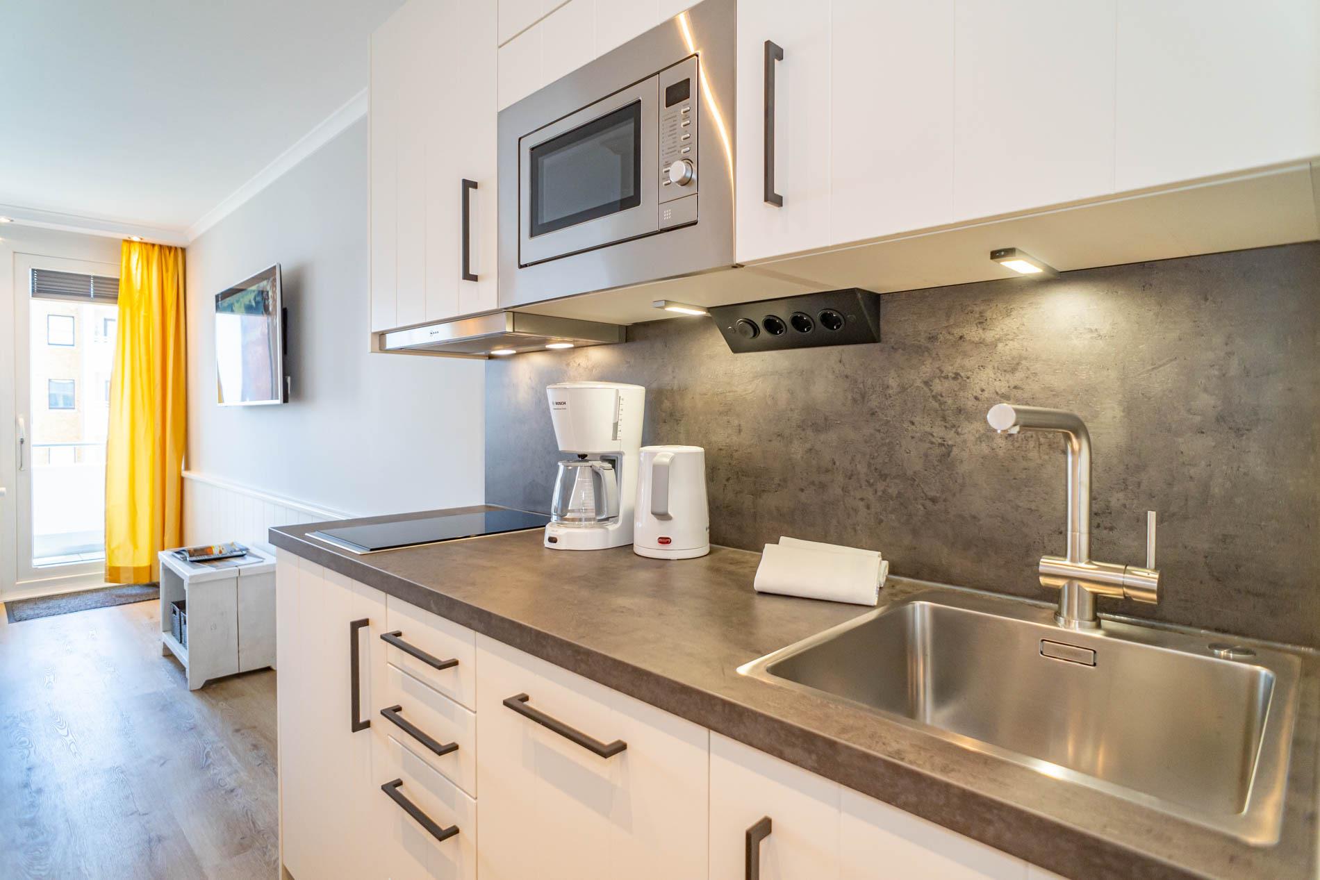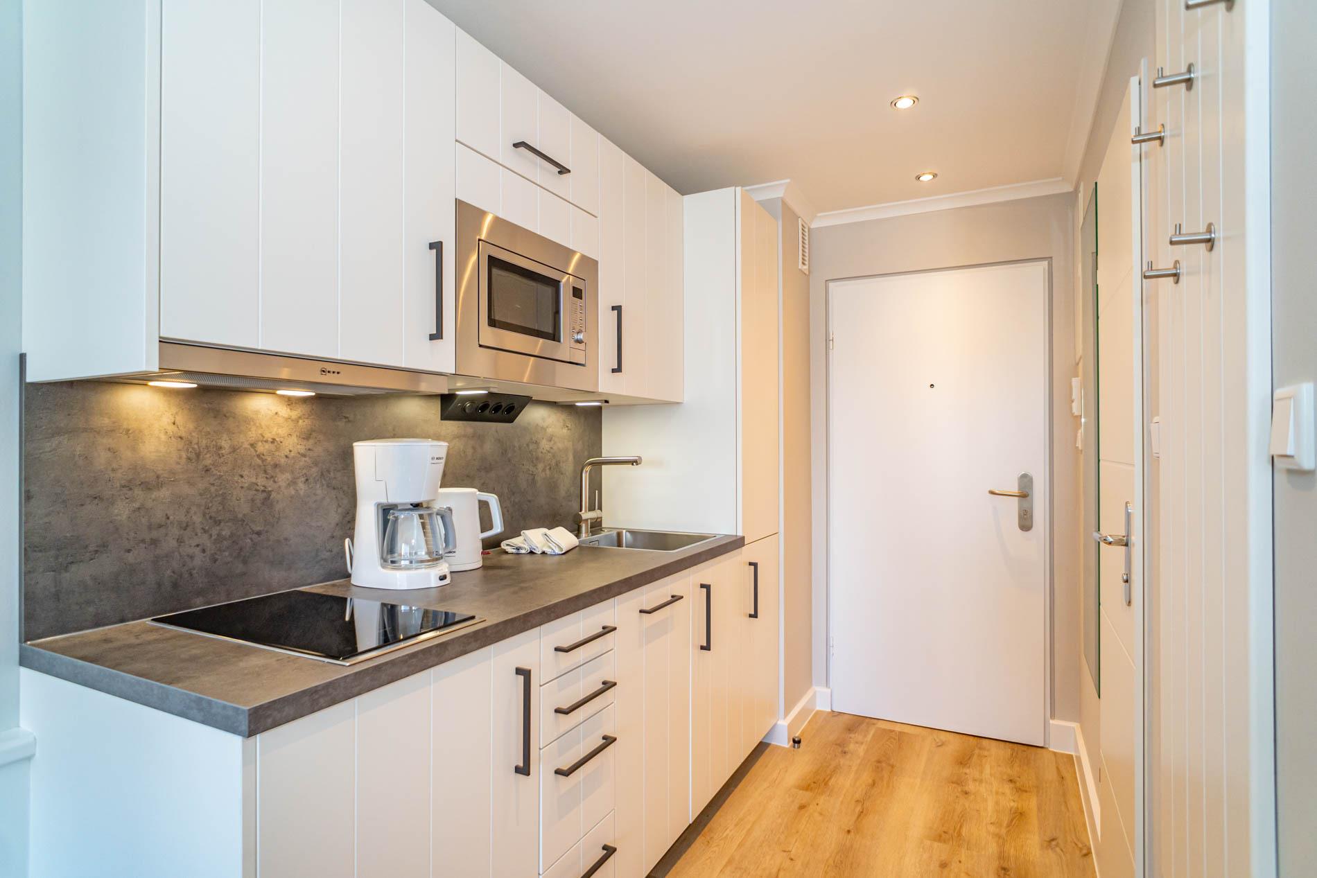 Die moderne Küchenzeile hat einen Geschirrspüler, ein Cerankochfeld, eine Mikrowelle mit Grillfunktion und einen Kühlschrank mit 3*-Gefrierfach. Kaffeemaschine, Wasserkocher und Toaster gehören zur Grundausstattung. Im modernen Badezimmer befinden sich eine Dusche mit extraflachem Einstieg, ein Waschtisch, Handtuchtrockner, Fön, Kosmetikspiegel und WC.