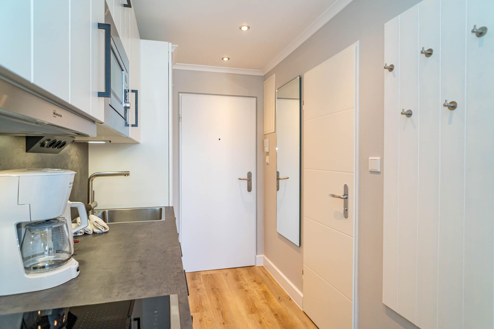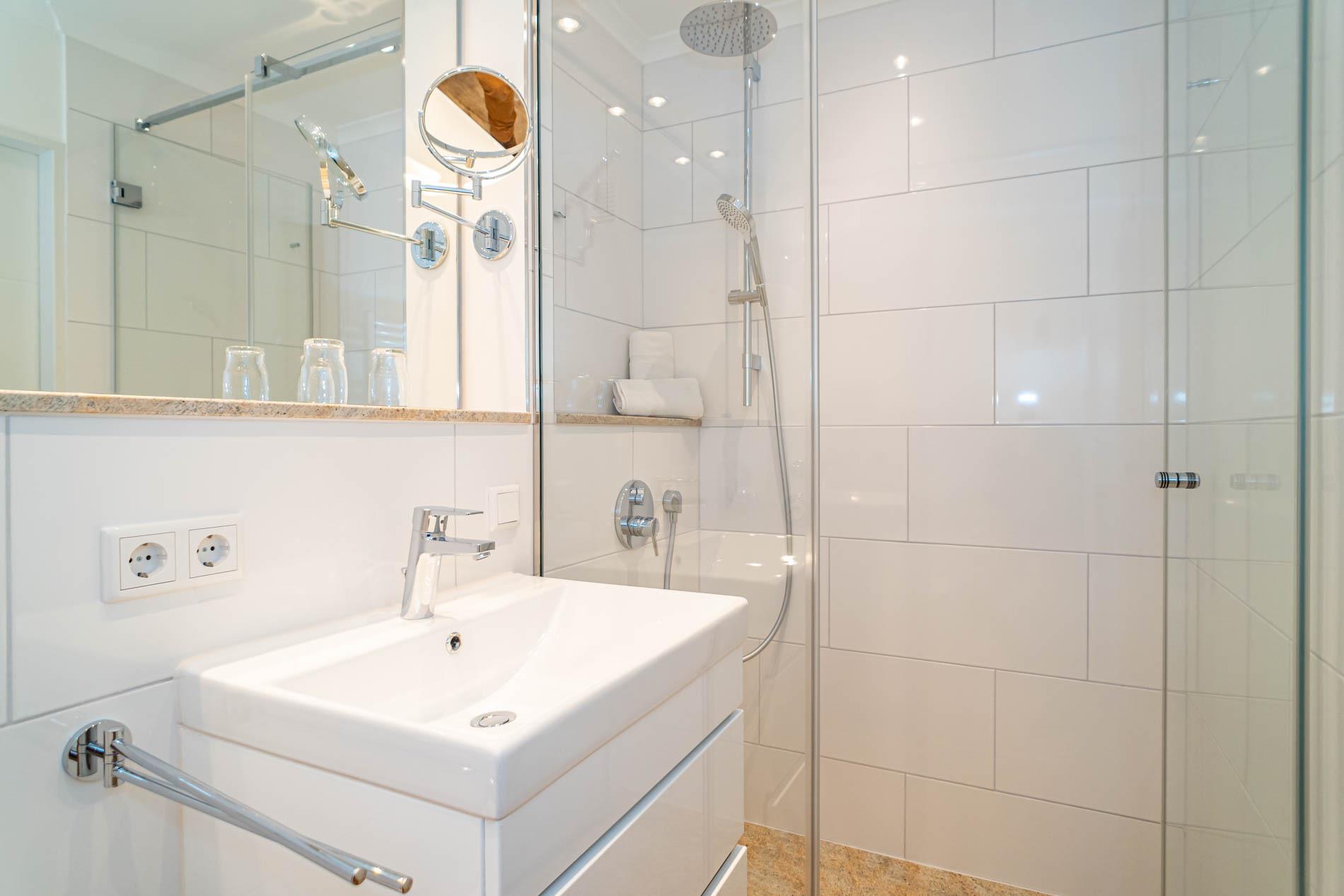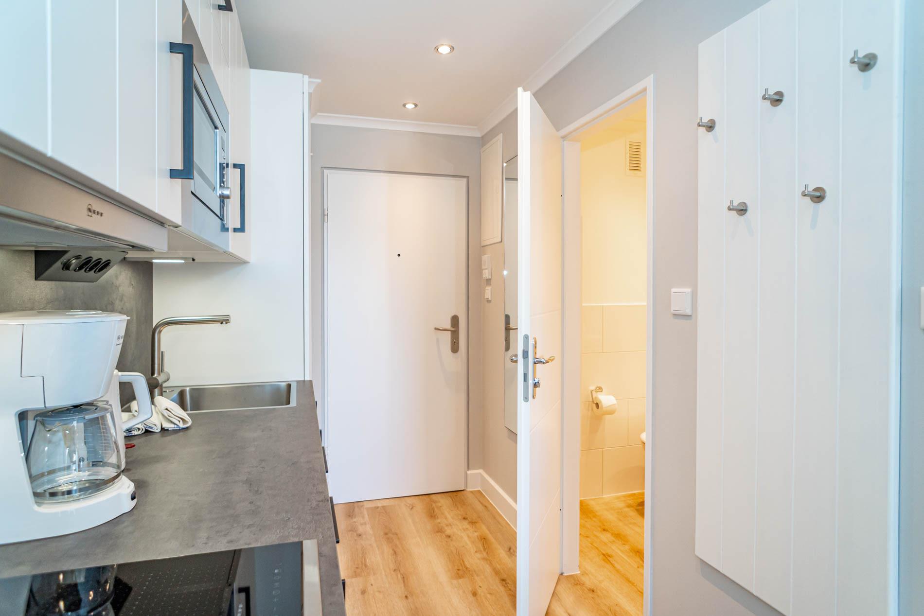 Die moderne Küchenzeile hat einen Geschirrspüler, ein Cerankochfeld, eine Mikrowelle mit Grillfunktion und einen Kühlschrank mit 3*-Gefrierfach. Kaffeemaschine, Wasserkocher und Toaster gehören zur Grundausstattung. Im modernen Badezimmer befinden sich eine Dusche mit extraflachem Einstieg, ein Waschtisch, Handtuchtrockner, Fön, Kosmetikspiegel und WC.