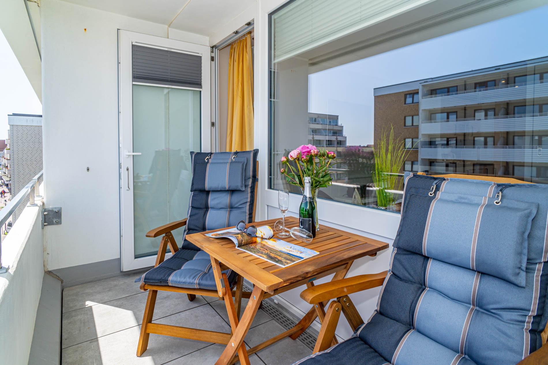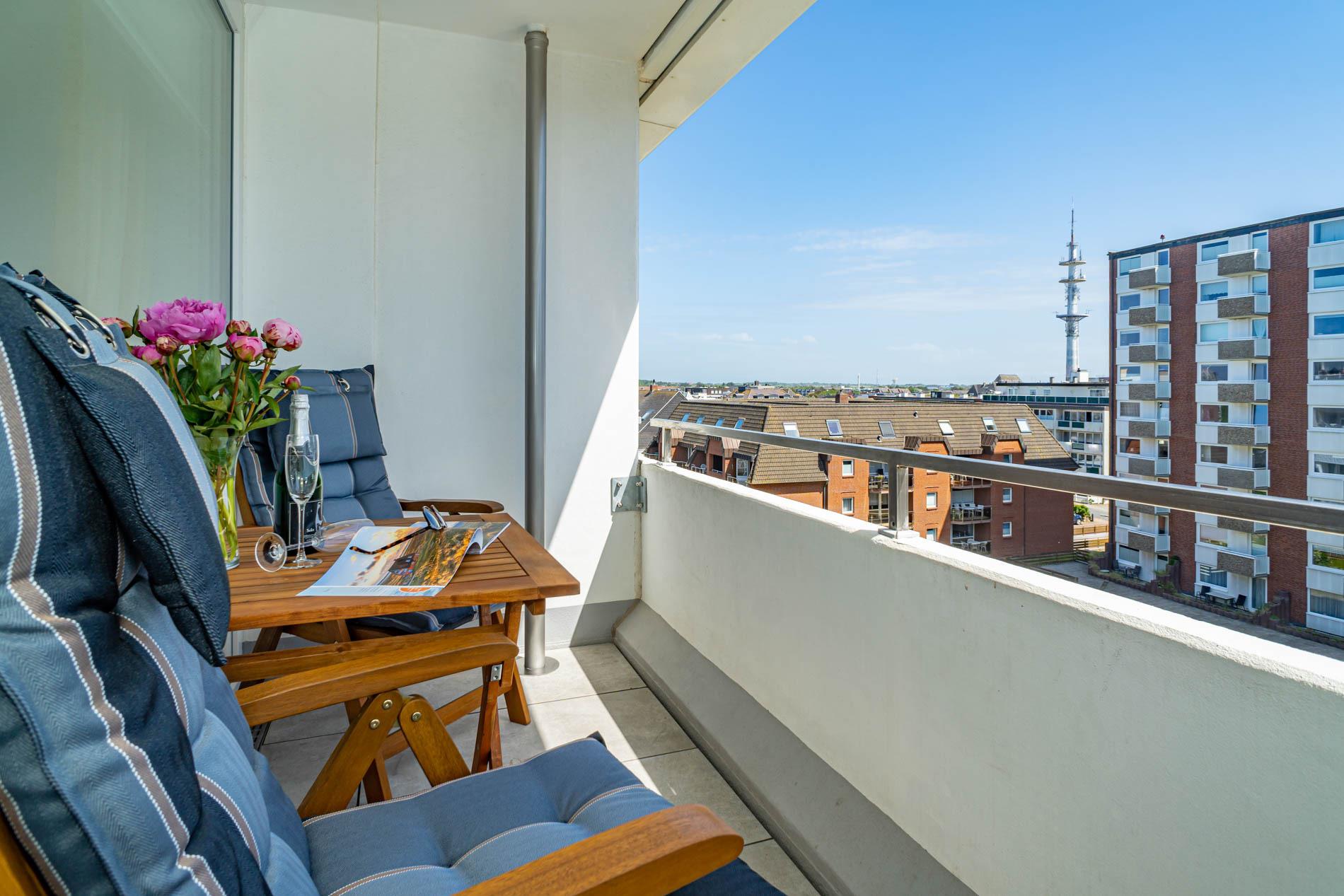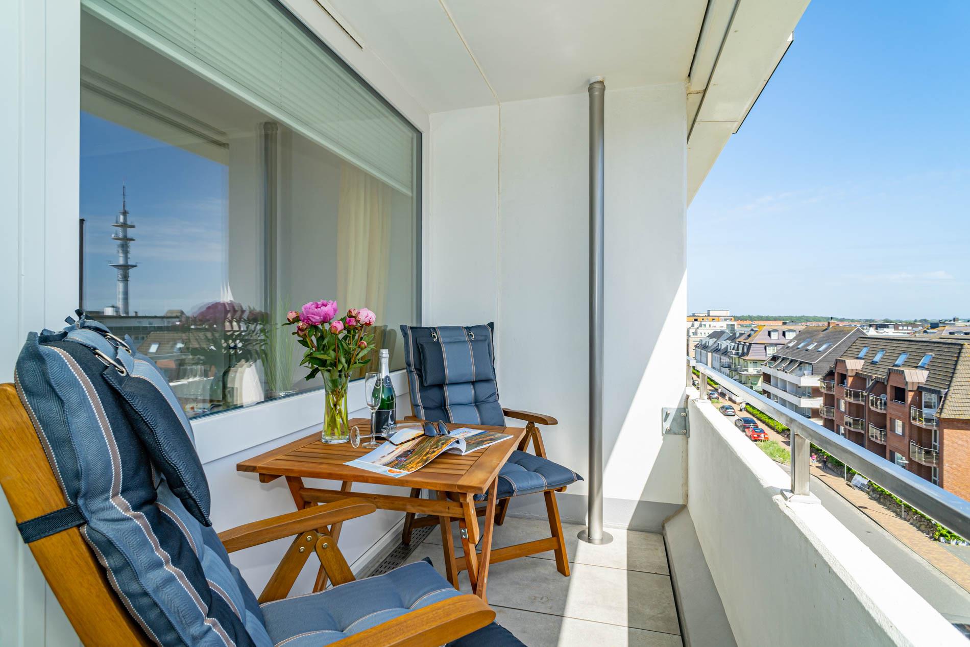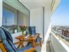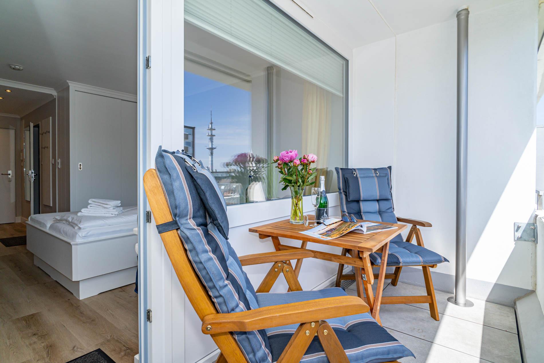Hochwertig und modern gestaltete 1-Zimmer-Nichtraucher-Ferienwohnung (ca. 25 qm) in der 4. Etage zur Landseite mit Ostloggia, (Morgensonne, mit Balkonmöbeln und Auflagen) für max. 2 Personen.