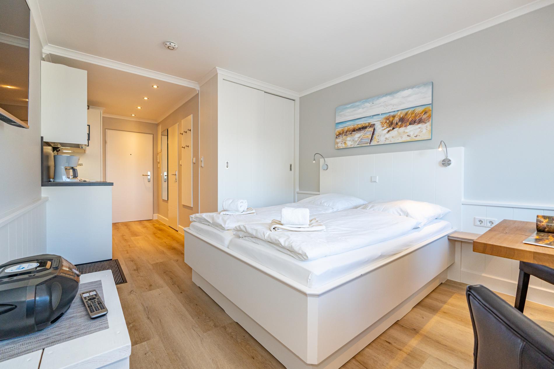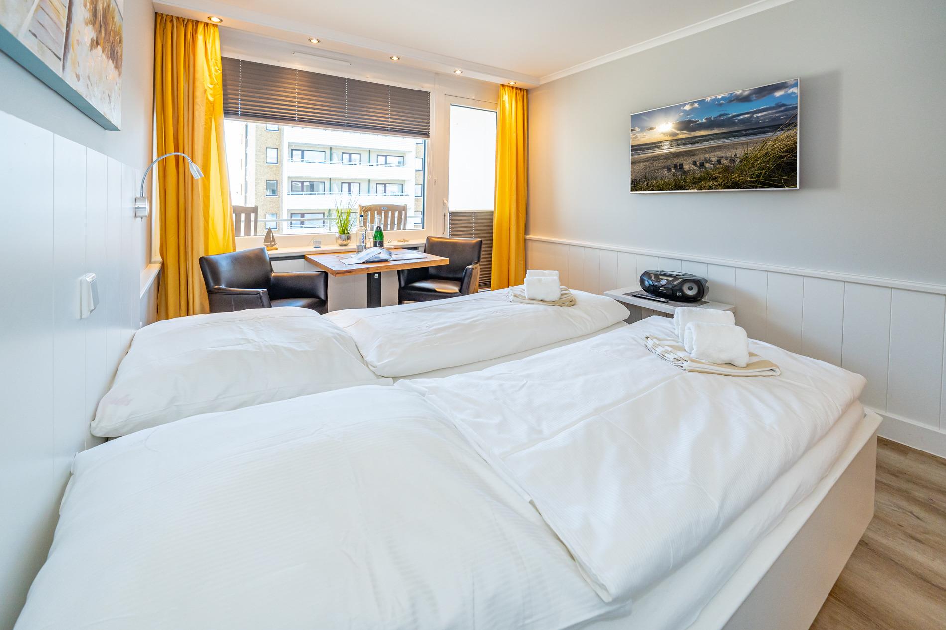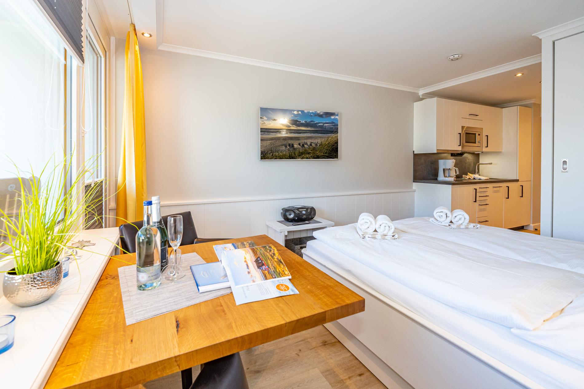 Der Wohn-/Schlafraum besteht aus einem feststehendem Doppelbett (1,60 x 2,00 m, gute Einzelmatratzen), Schiebetüren-Kleiderschrank (beides hochwertige Tischlereinbauten), zwei Leder-Sesselstühlen und Esstisch direkt an der breiten Fensterfront, Flachbild-TV, Radio-CD.