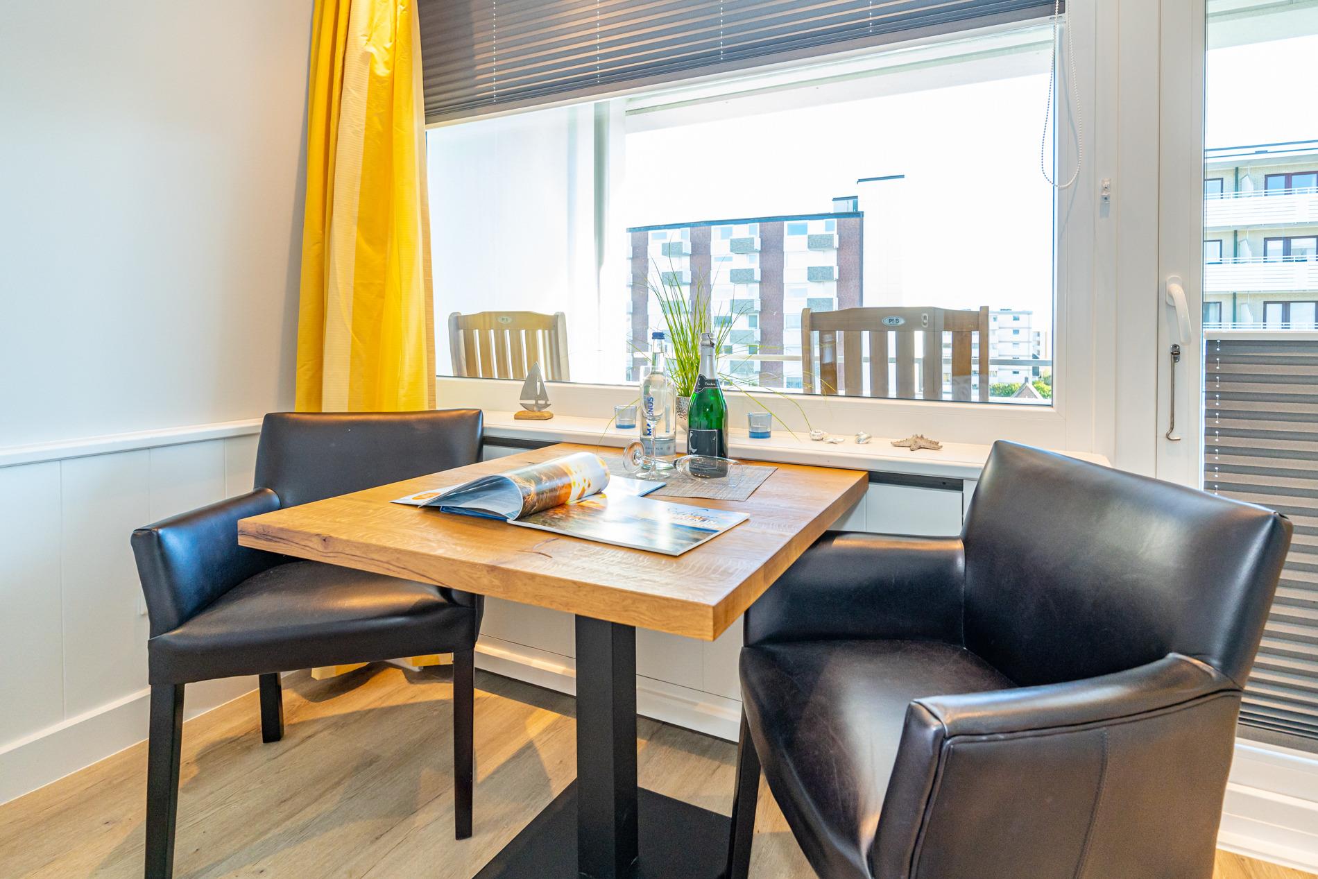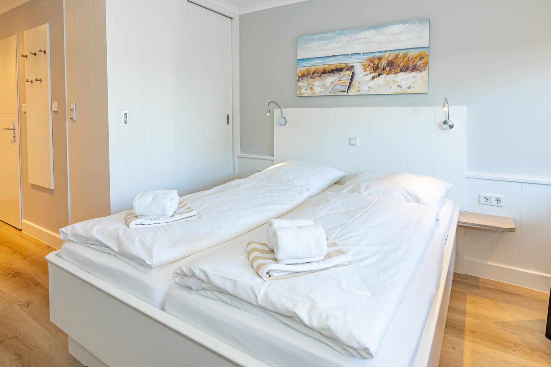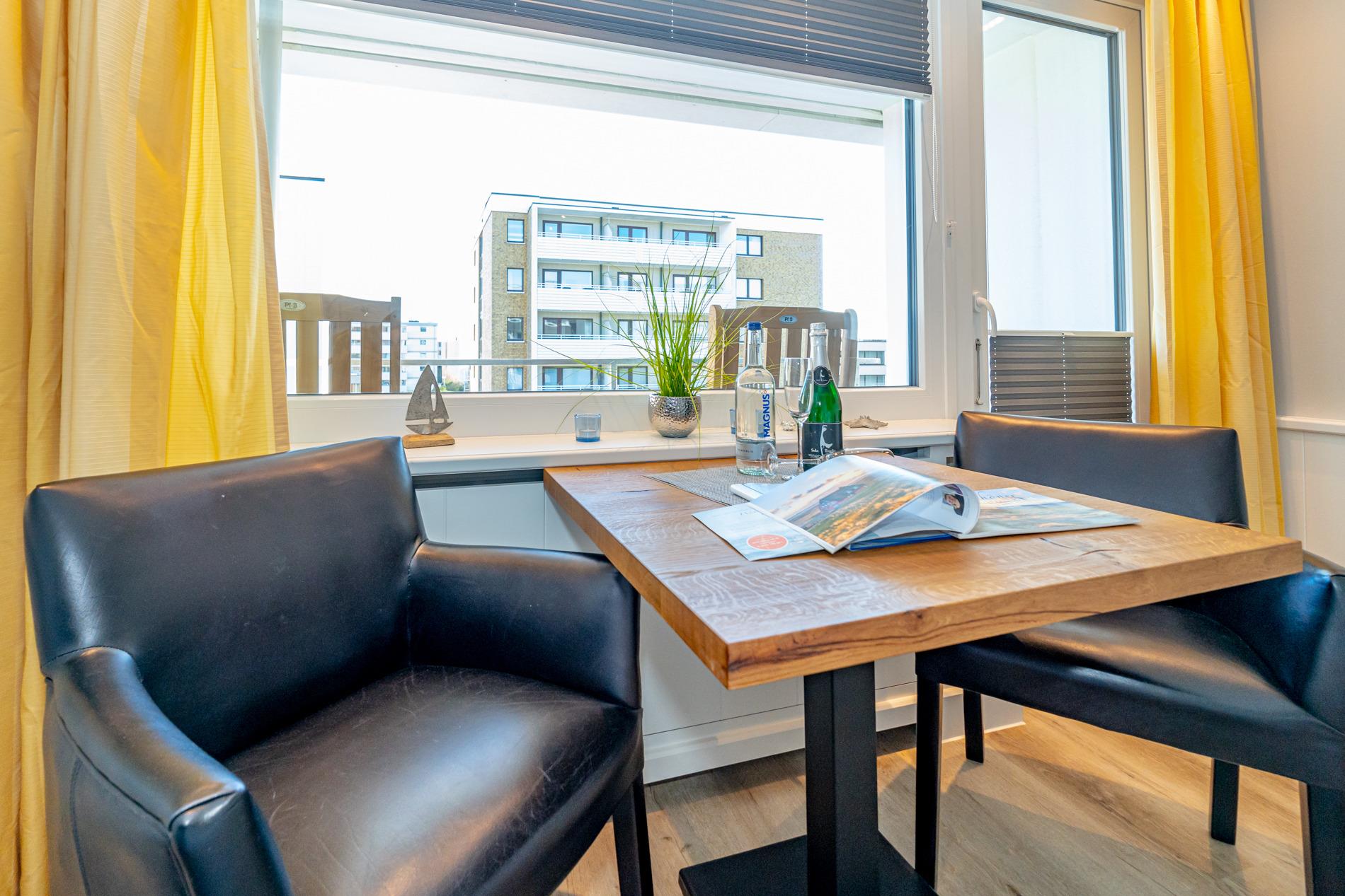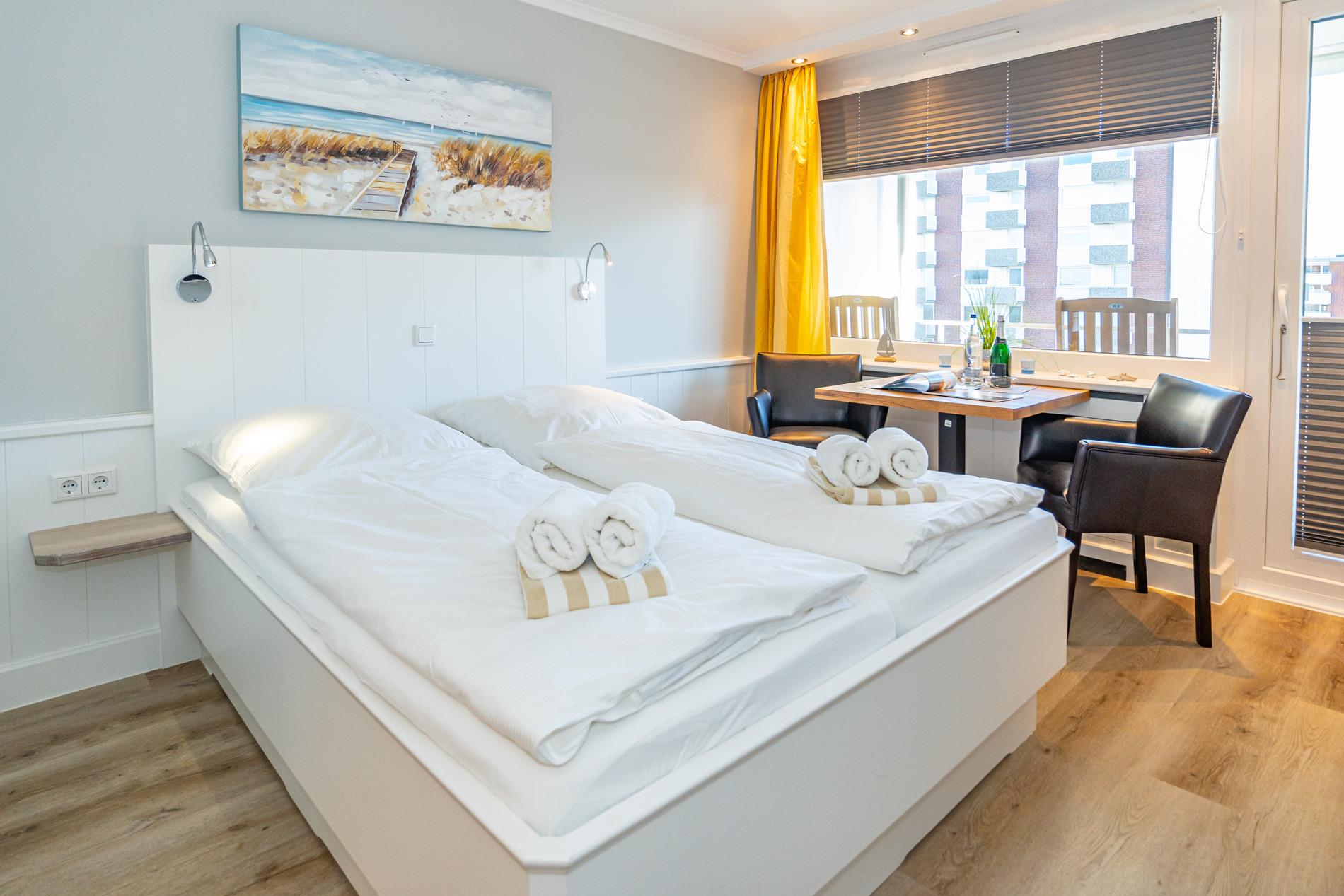 Der Wohn-/Schlafraum besteht aus einem feststehendem Doppelbett (1,60 x 2,00 m, gute Einzelmatratzen), Schiebetüren-Kleiderschrank (beides hochwertige Tischlereinbauten), zwei Leder-Sesselstühlen und Esstisch direkt an der breiten Fensterfront, Flachbild-TV, Radio-CD.
