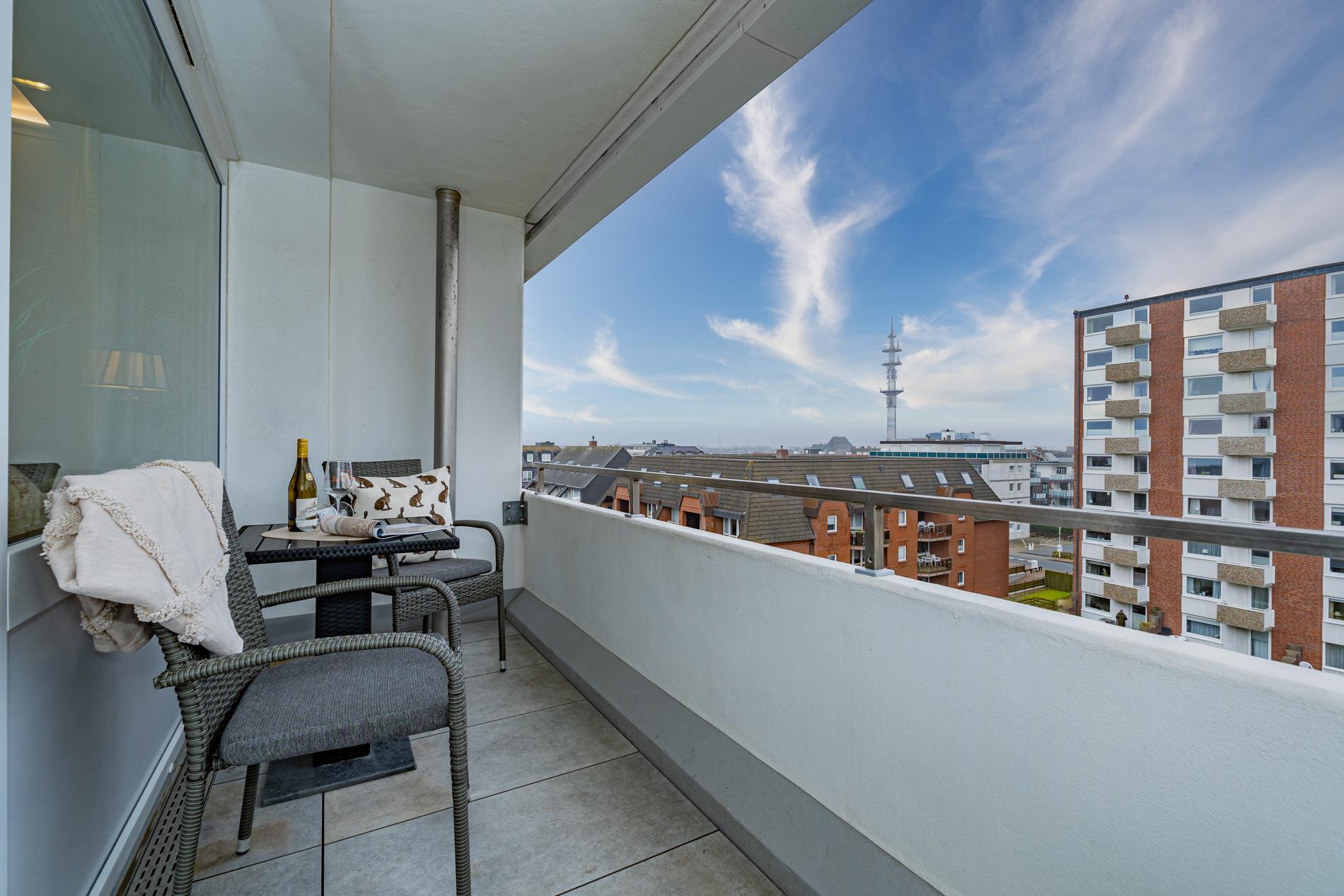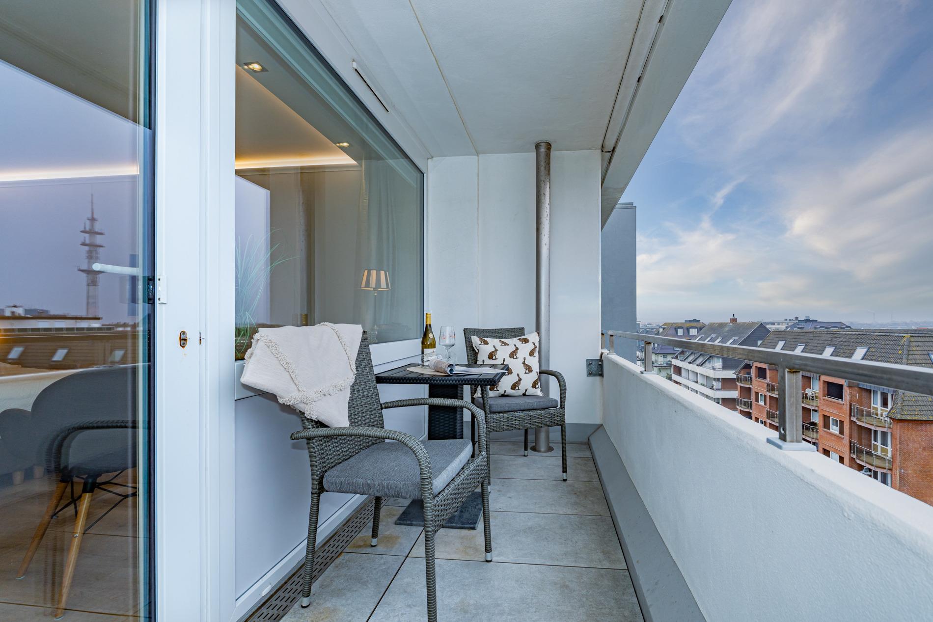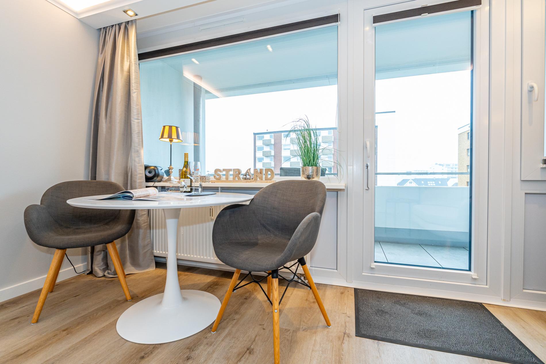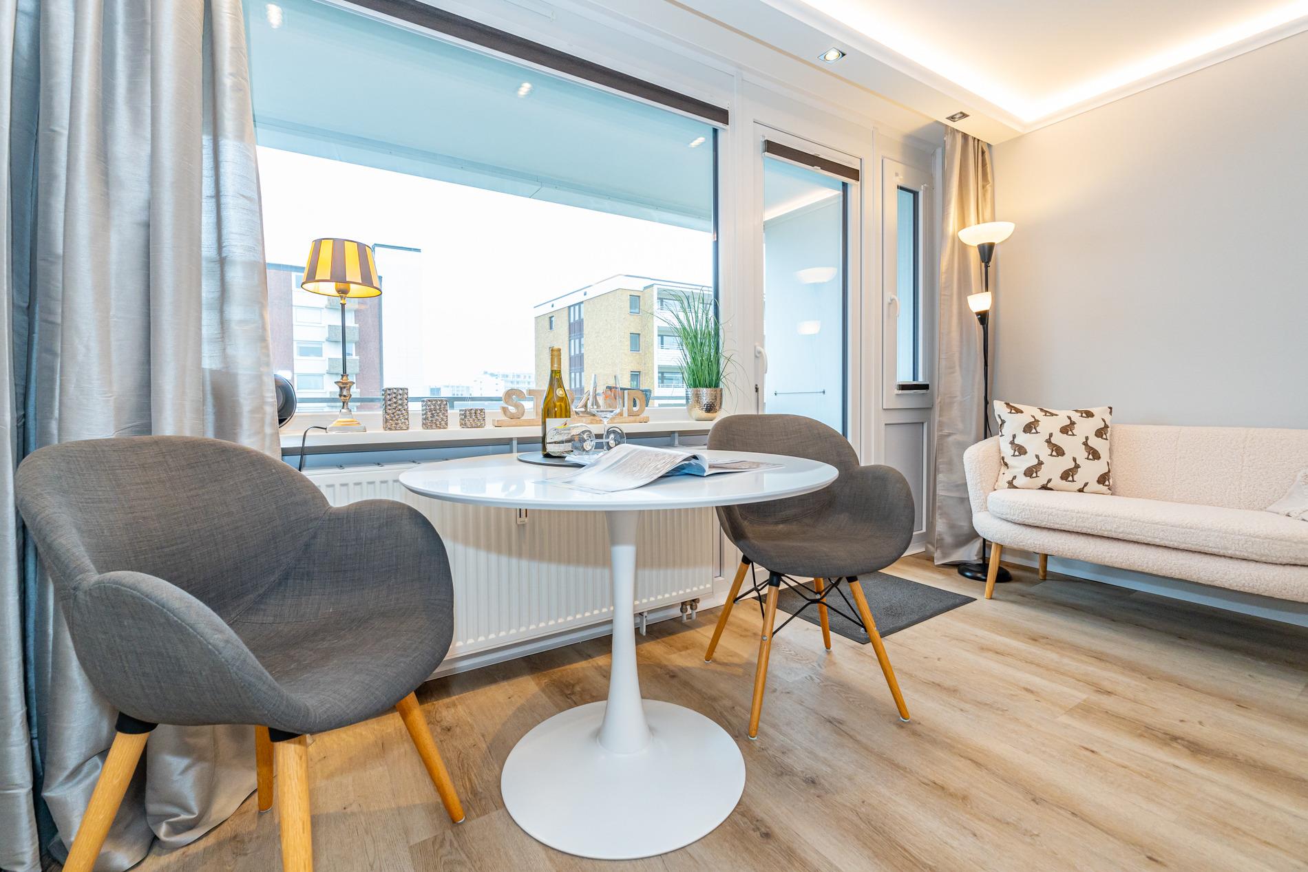 Top ausgestattete 1-Zimmer-Nichtraucher-Ferienwohnung (ca. 28 m²) in der 4. Etage zur Landseite mit Ostloggia (mit Balkonmöbeln und Auflagen) für 2 Personen.