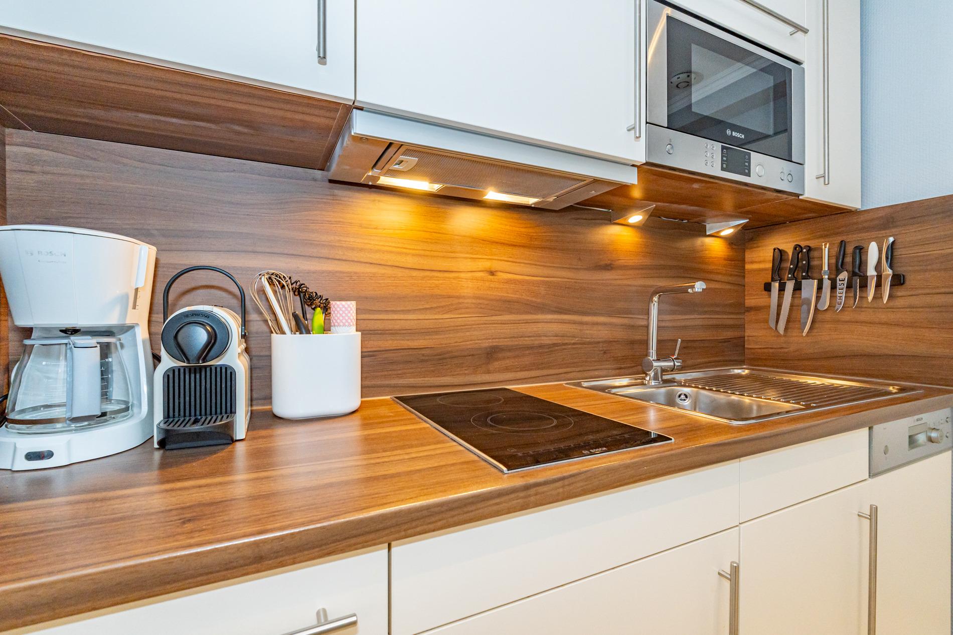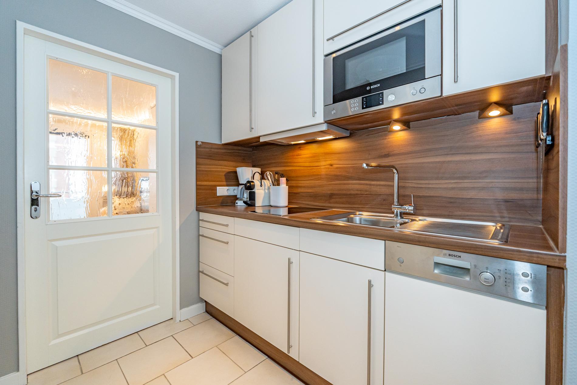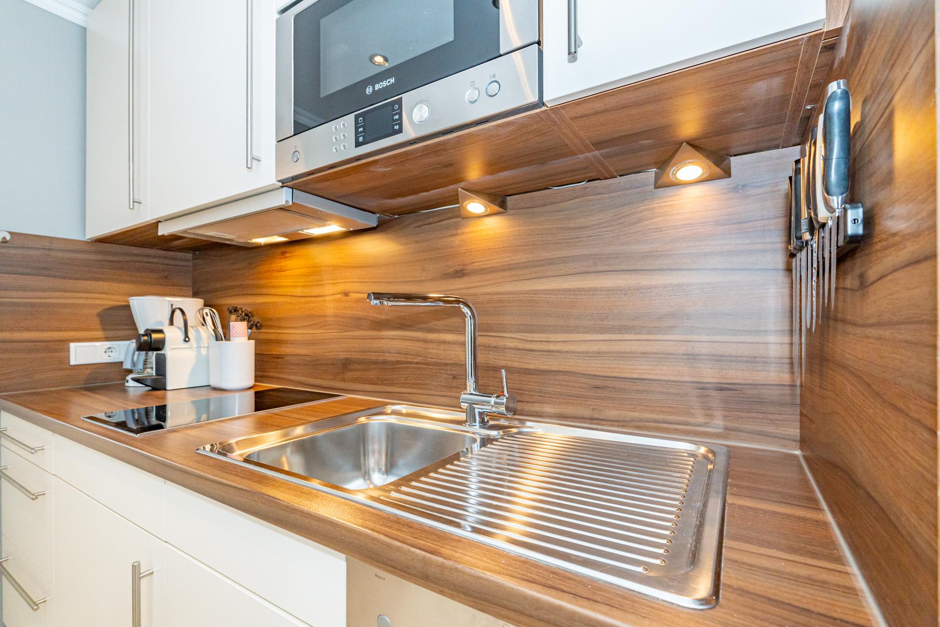 Die hochwertige, neue Küchenzeile hat einen Geschirrspüler, eine Mikrowelle, und ein 2-Platten-Ceranfeld.