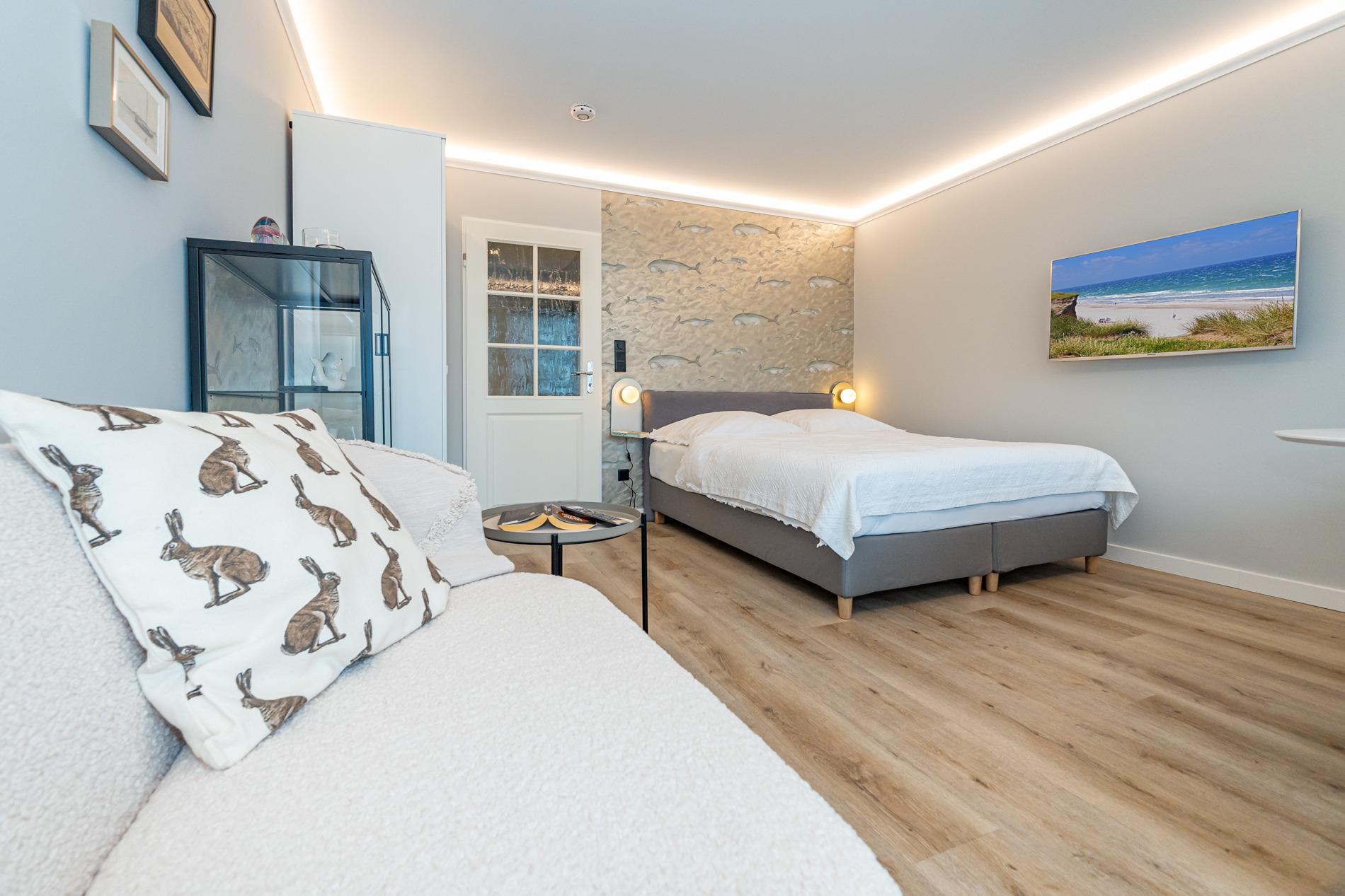 Das Wohn-/Schlafzimmer mit modernem Designerboden in Holzoptik hat ein feststehendes Doppelbett (1,60m x 2,00m), 2er-Sitzbank, Esstisch, einen Kabel-Flachbild-TV, Radio/CD.