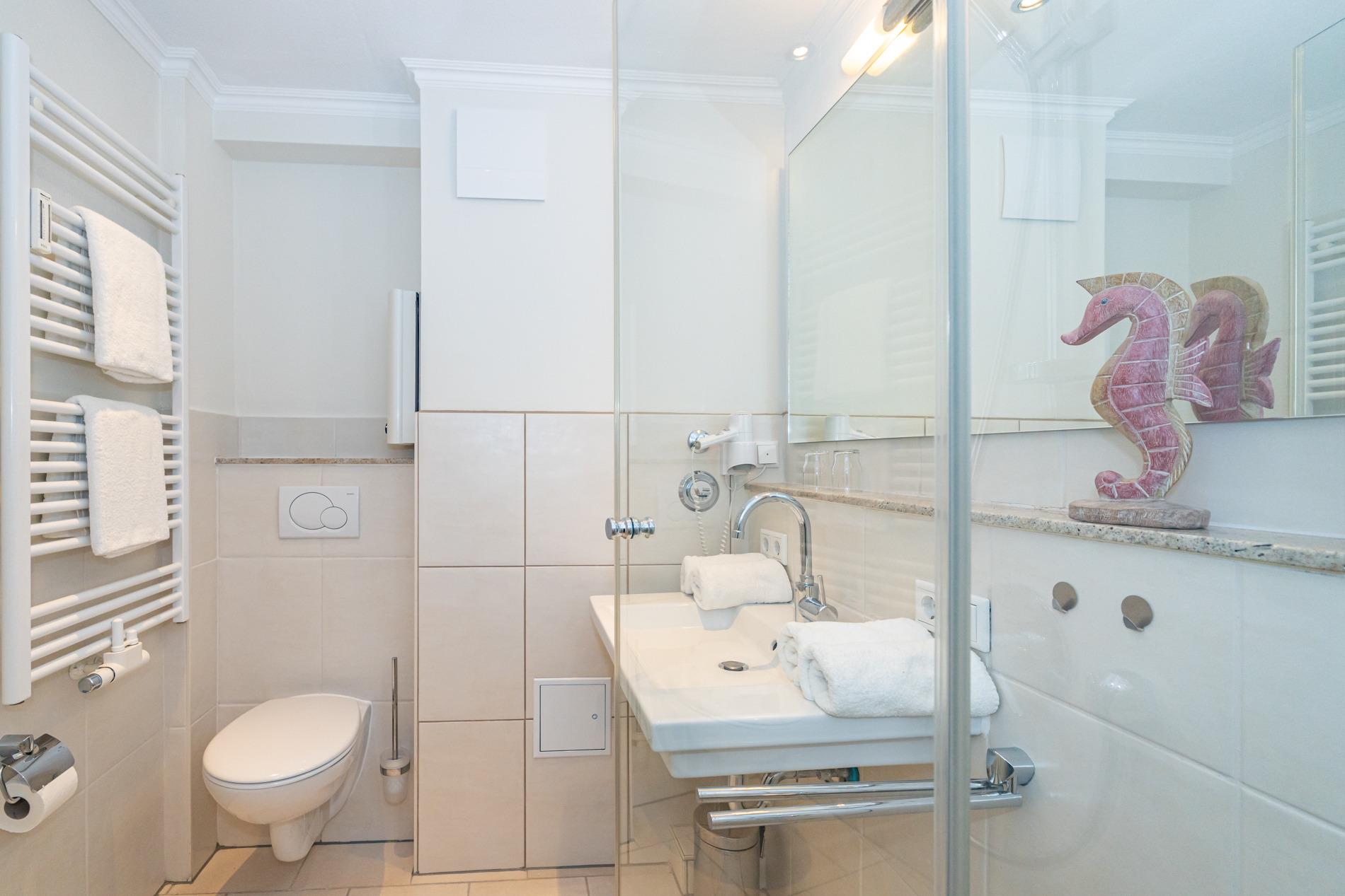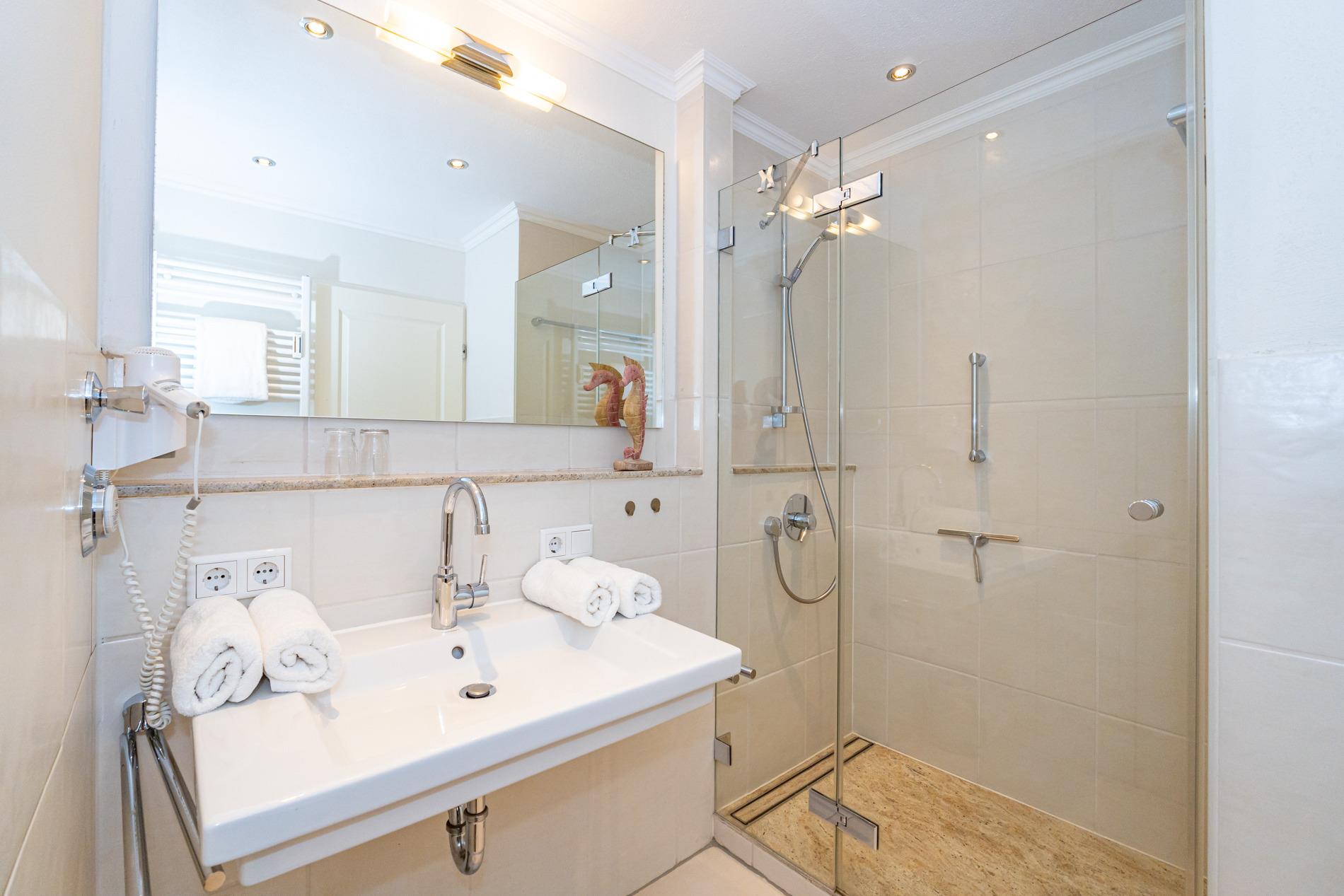 Das neue luxuriöse Duschbad/WC hat einen Waschtisch und Fön.
