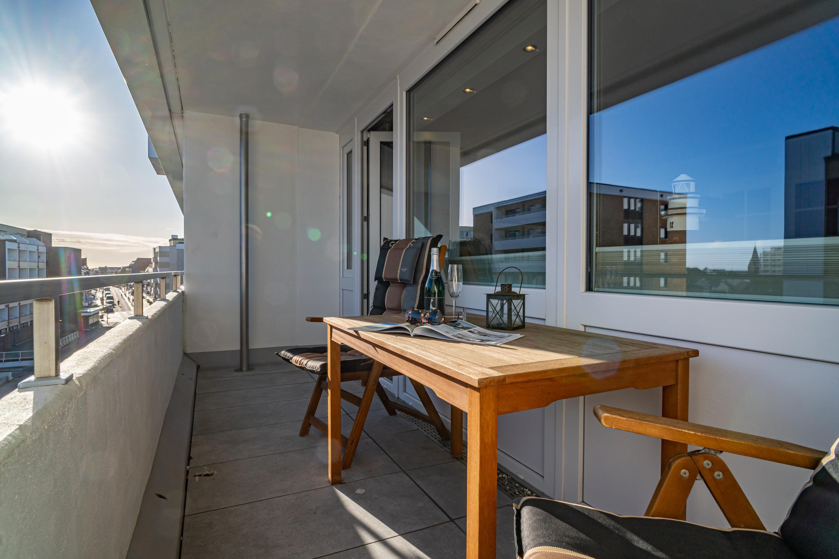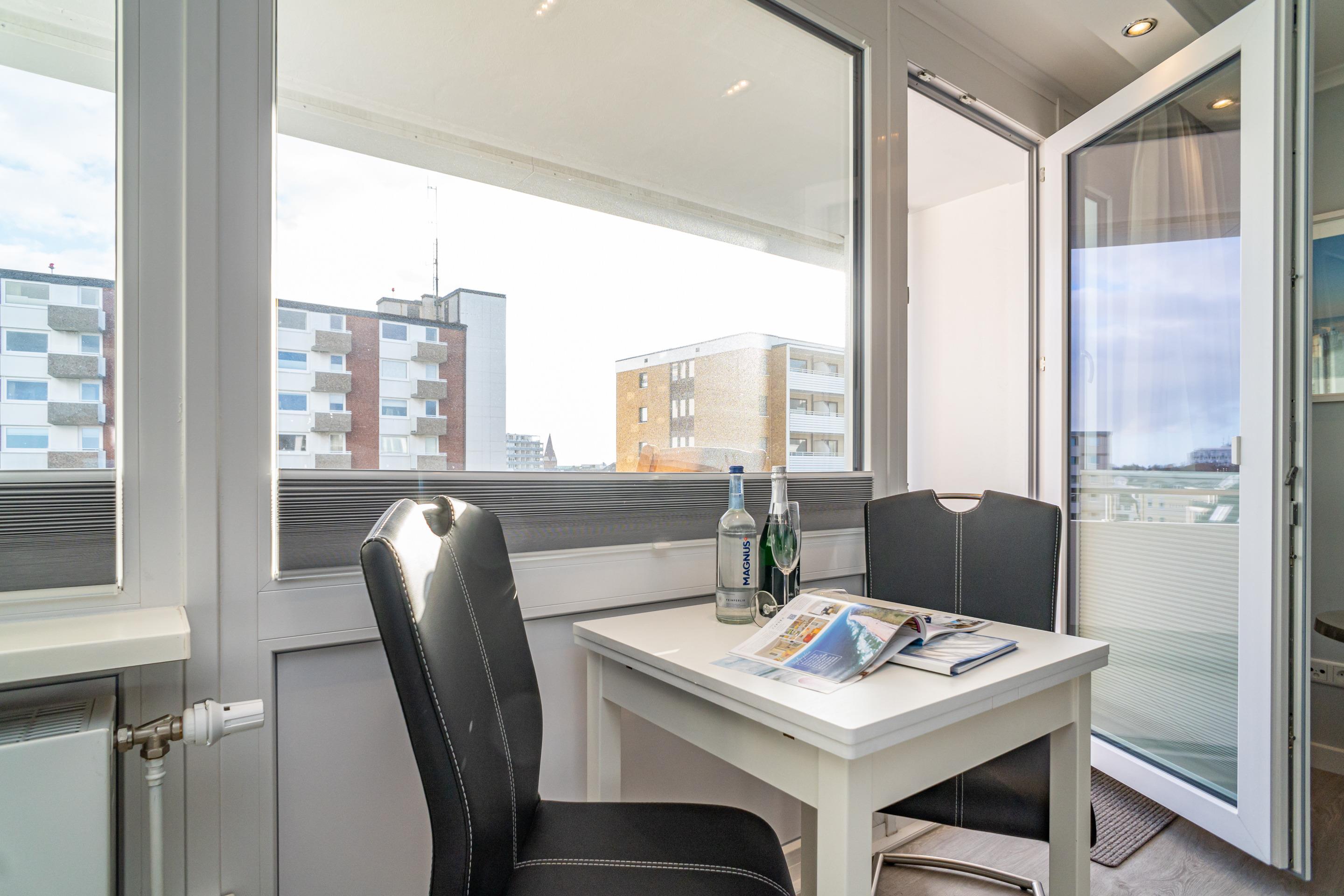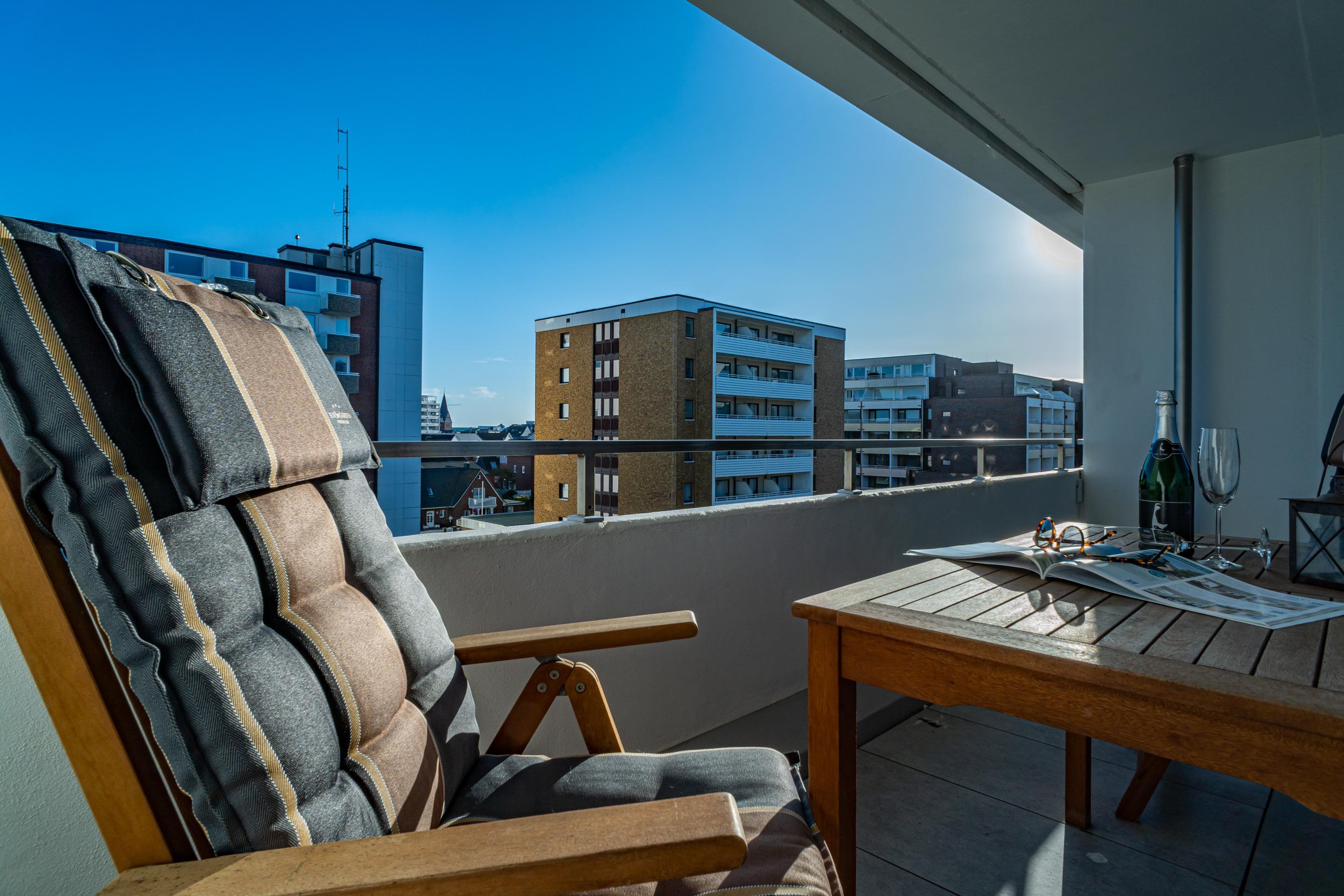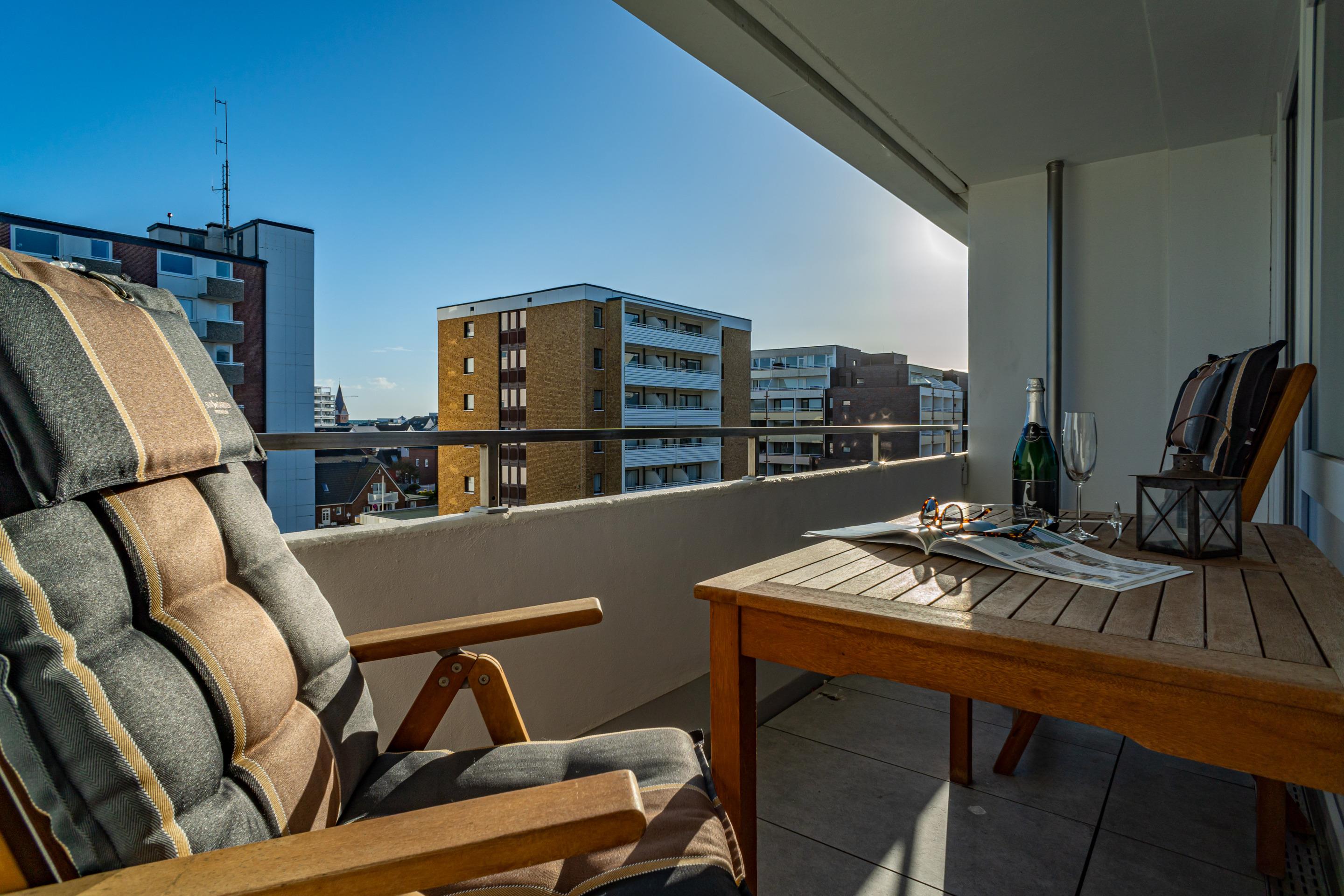 Großzügige 1-Zimmer-Nichtraucher-Ferienwohnung (ca. 38 m²) in der 4. Etage zur Landseite mit Ostloggia (Morgensonne, mit Balkonmöbeln und Auflagen) für max. 2 Personen.
