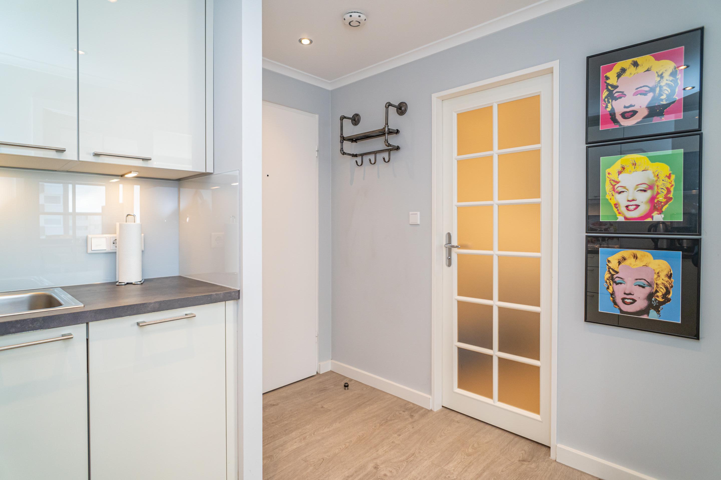 Vom Vorflur mit Garderobe gelangt man in das kombinierte Wohn-/Schlafzimmer (mit Austritt zum Balkon),[nbsp][nbsp]in das Duschbad/WC.