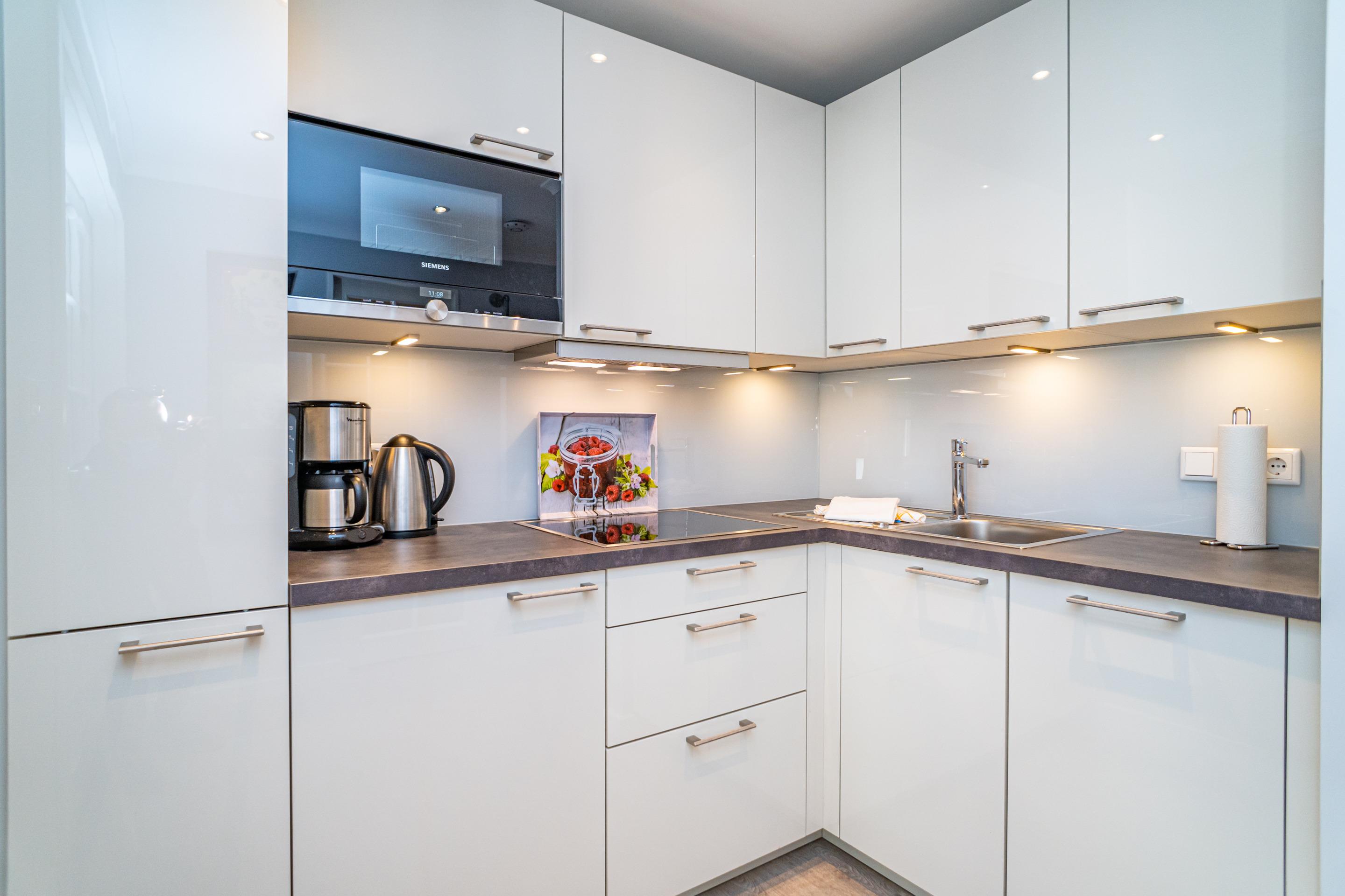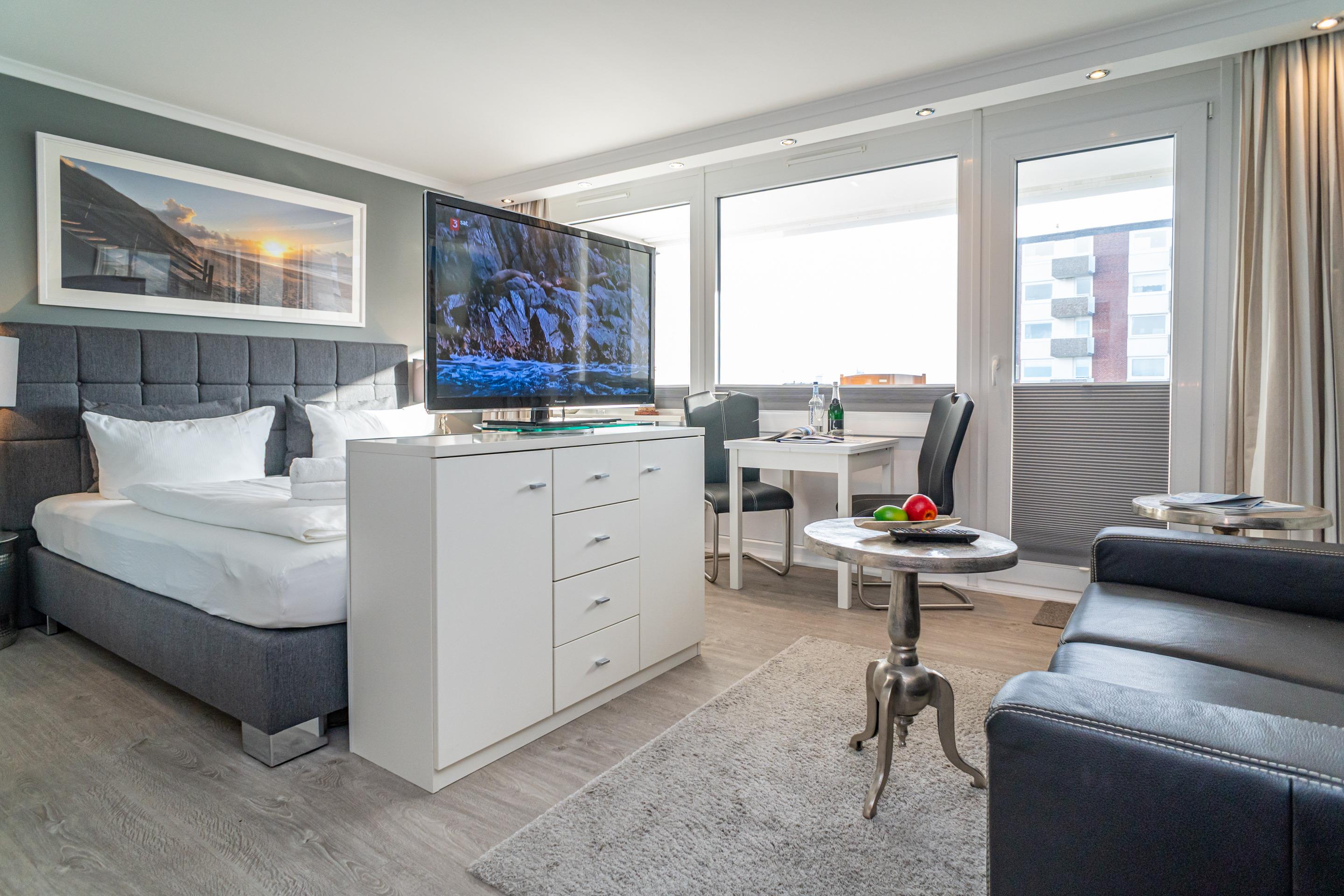 Der Wohn-/Schlafraum besteht aus einer Küchenzeile mit 4-Platten-Ceranfeld-Herd mit Backofen, Kühlschrank mit Gefrierfach und einem Geschirrspüler, Kaffeemaschine, Wasserkocher und Toaster gehören zur Grundausstattung, einer gemütlichen Sitzgarnitur, einem Essplatz, einem Doppelbett ( 180 x 200 cm), Kabel-Flachbild-TV.