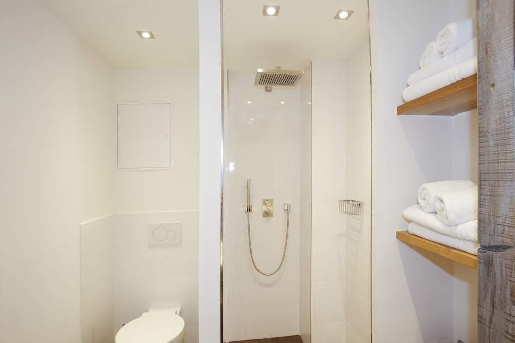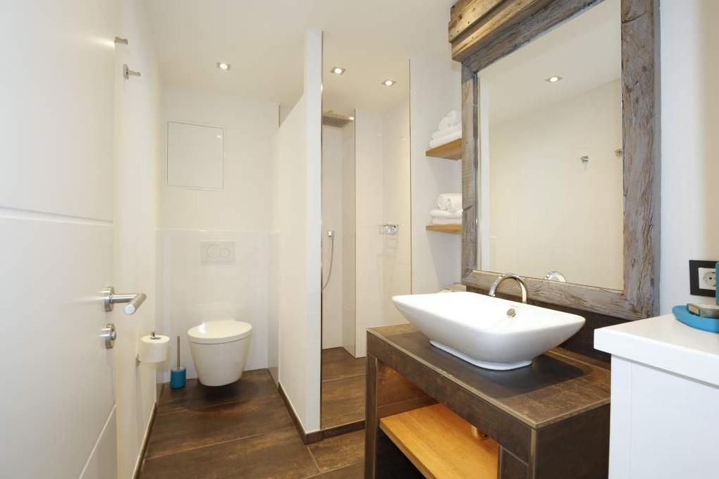 Im neuen Bad befindet sich eine großzügige Dusche mit extraflachem Einstieg, ein gemauerter Waschtisch und das WC.